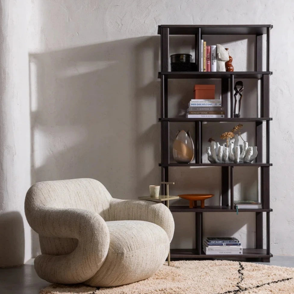 A Riss egy modern és kreatív könyvespolc a holland Woood márka kollekciójából. A bútor FSC minősítésű, sötétbarnára festett tölgyfából készült, ami masszív és hosszantartó használatot biztosít. Ez a modell játékosan van felépítve, és nagy nyitott felületeket tartalmaz.