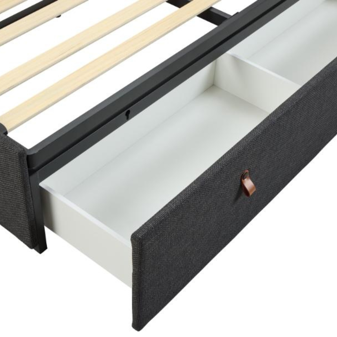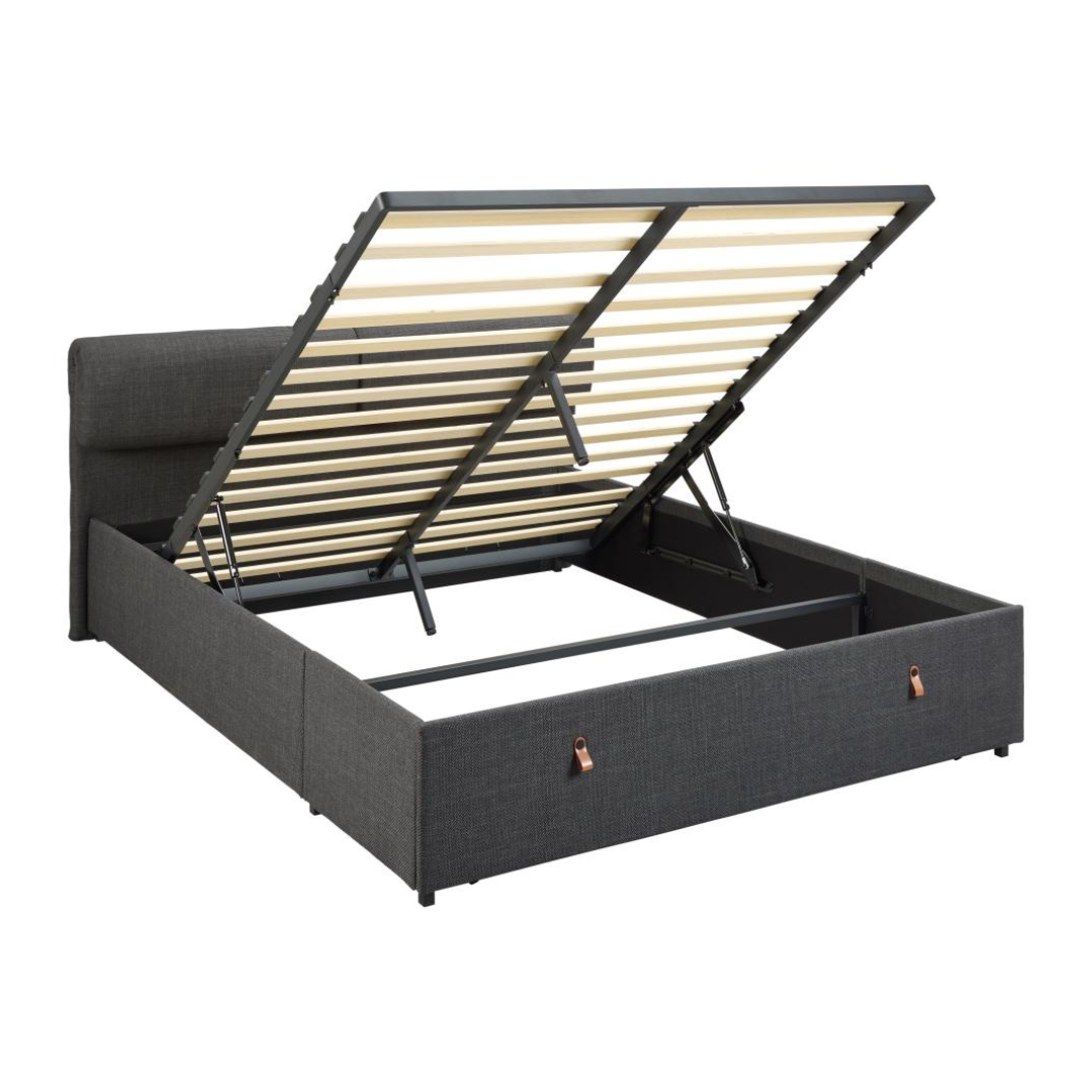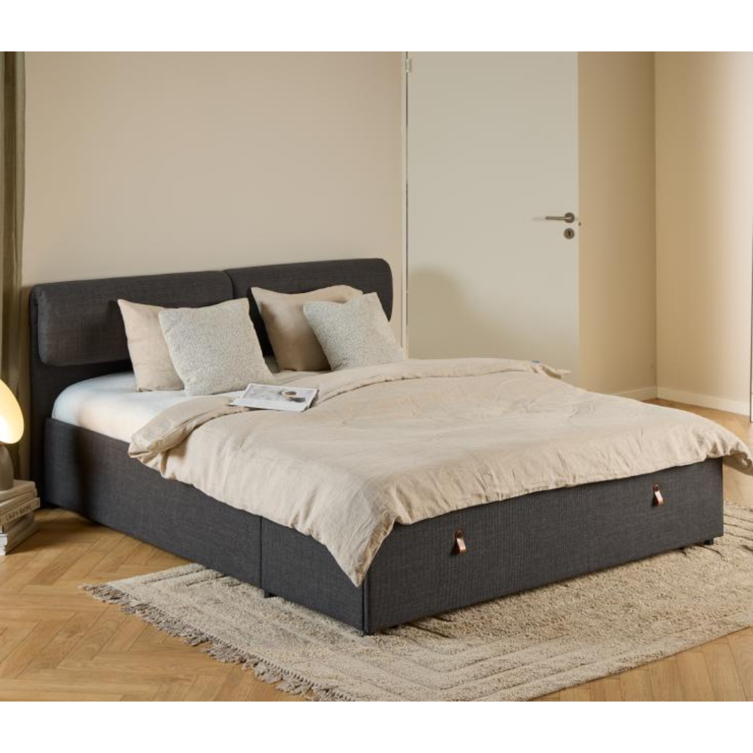 A Calvi franciaágy egy modern, kárpitozott ágykeret 2 fiókos tárolóval, párnázott és állítható fejtámlával a nagyobb kényelem érdekében. Strukturált sötétszürke szövettel van kárpitozva, kifinomult megjelenéssel, mely mélységet és textúrát kölcsönöz. Letisztult dizájnja feldobja bármely modern hálószoba hangulatát.
