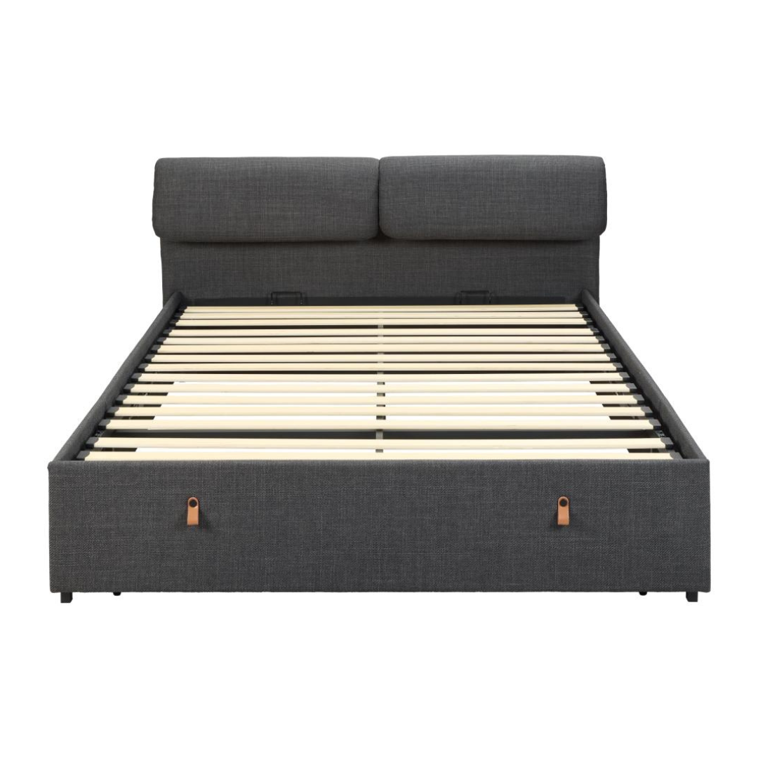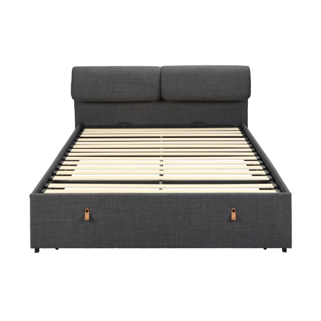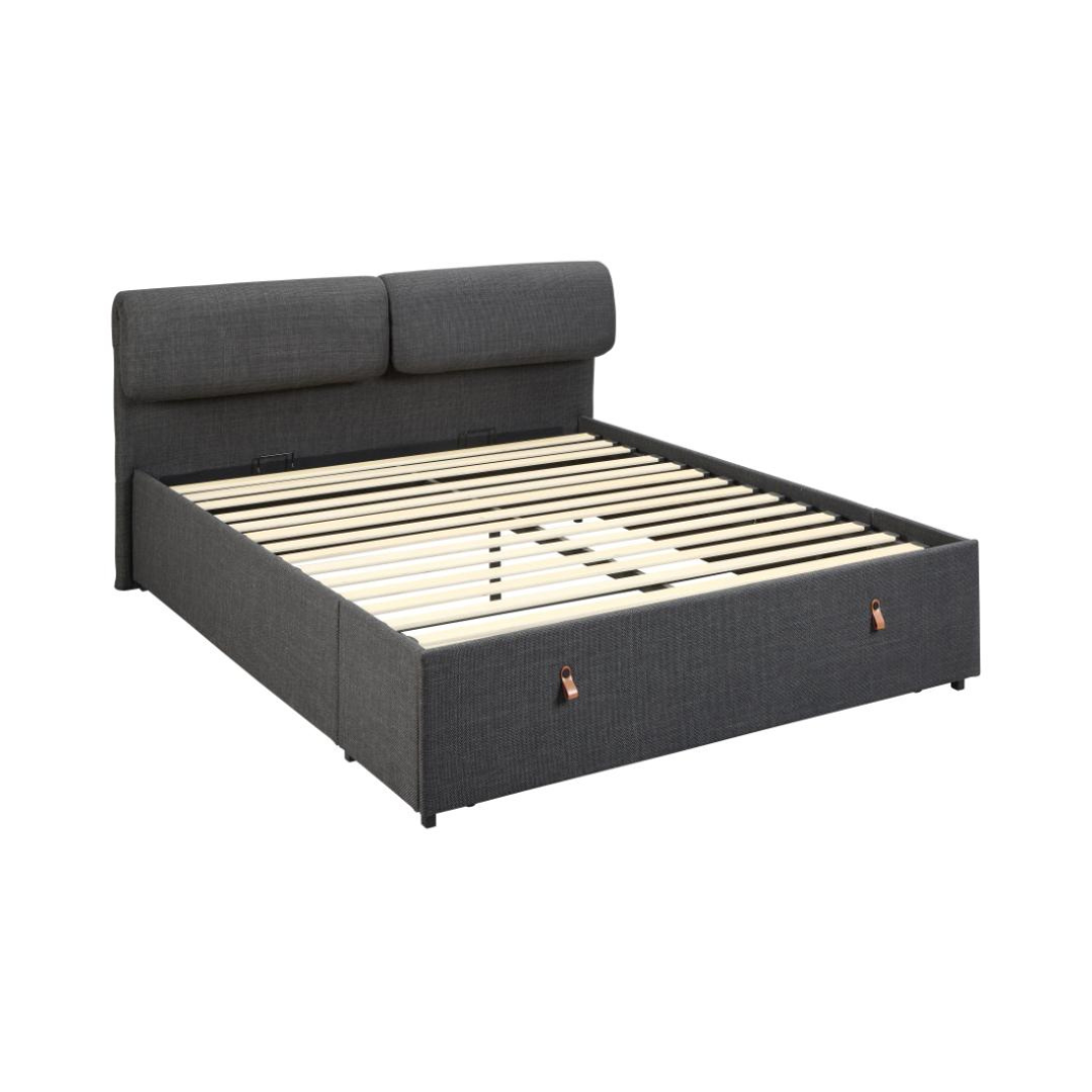 A Calvi franciaágy egy modern, kárpitozott ágykeret 2 fiókos tárolóval, párnázott és állítható fejtámlával a nagyobb kényelem érdekében. Strukturált sötétszürke szövettel van kárpitozva, kifinomult megjelenéssel, mely mélységet és textúrát kölcsönöz. Letisztult dizájnja feldobja bármely modern hálószoba hangulatát.