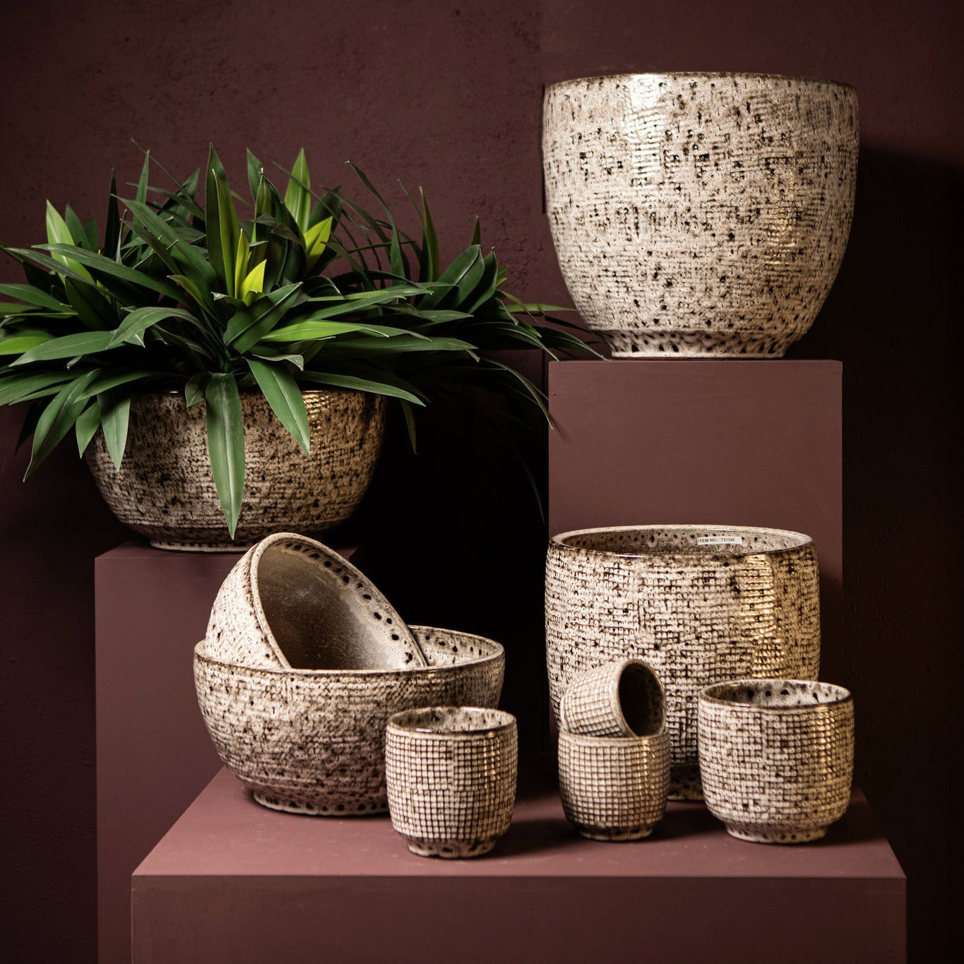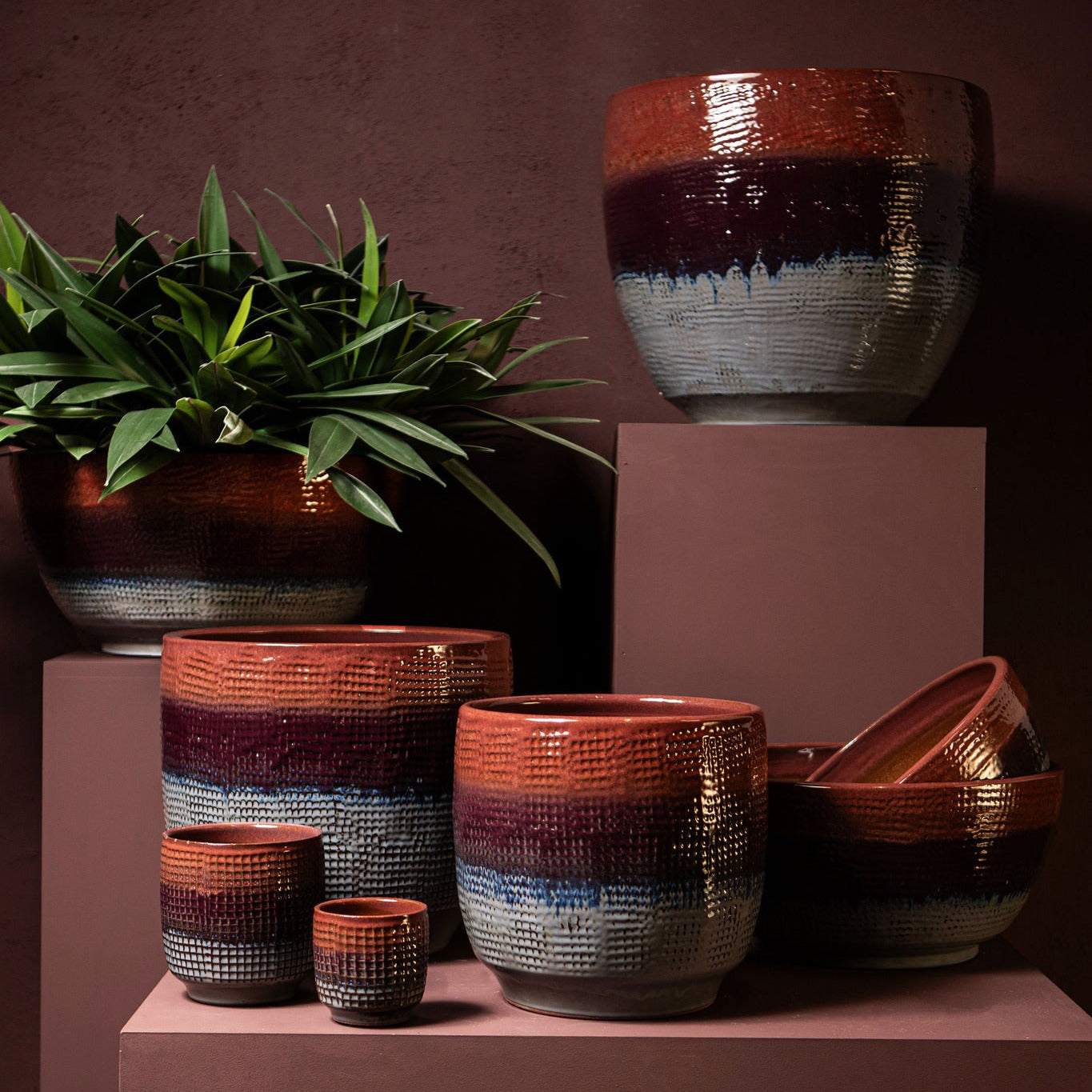 A kétféle méretben (Ø39x35 cm, és Ø50.5x44 cm) kapható Elana virágtartó egy látványos kiegészítő, mely mázas kerámiából készült, így tartós és időjárásálló. A kül-, és beltéren egyaránt használható Elana kaspó színes, vízszintes csíkos mintás, és kopottas fehér színekben érhető el.