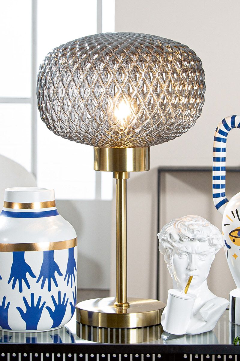 A Diamond asztali lámpa elegáns részleteivel hívja fel magára a figyelmet. Üveg búrája időtálló és elegáns megjelenésű, egyedi gyémántokat formázó mintázattal rendelkezik. Arany színű, fémből készült lába és talpazata teszi igazán kifinomulttá. A kábel hossza: 180 cm. Kompatibilis 1 darab E27 foglalatú, max. 25W izzóval, amely nem tartozéka.