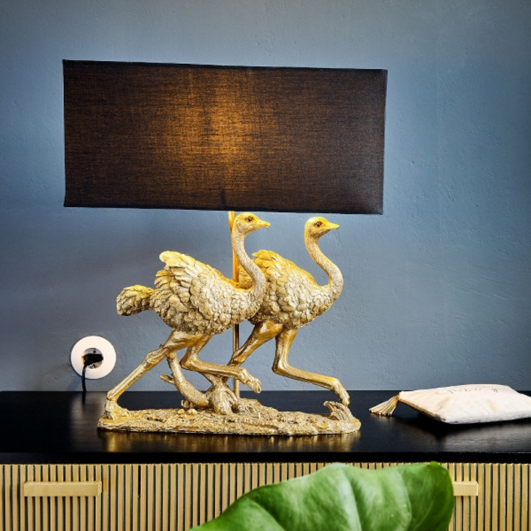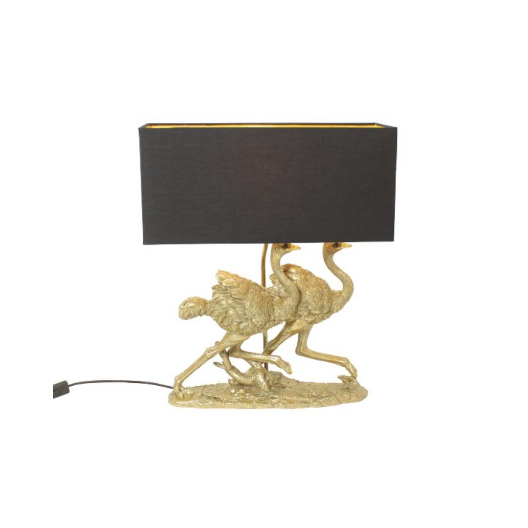 A Franz & Franzi asztali lámpa egy látványos világítótest, amely tökéletes dísze lehet bármilyen belső térnek. A lámpa műgyanta anyaga biztosítja a tartósságot, míg az arany színű struccok különleges megjelenést kölcsönöznek neki. Elegáns, téglatest alakú fekete szövet búra egészíti ki. Ideális választás lehet otthoni , üzleti, vagy irodai környezetbe is. A termék 2 méteres kábellel rendelkezik, az izzót nem tartalmazza.