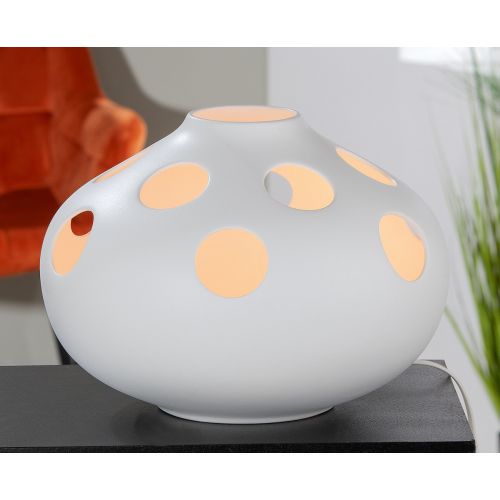 A Nazareth asztali lámpa organikus formáival hívja fel magára a figyelmet. Kerámia búrája időtálló és elegáns megjelenésű. A fényt lyukakon keresztül sugározza, amik egyedi mintázatot vetítenek a környezetébe. Bájos megjelenése, akár egy gyertyatartó, meleg hangulatot teremt a terekben. Választhatod fehér, fekete vagy pezsgő színű kivitelben. Kompatibilis 1 darab E27 foglalatú, max. 60W izzóval, amely nem tartozéka.