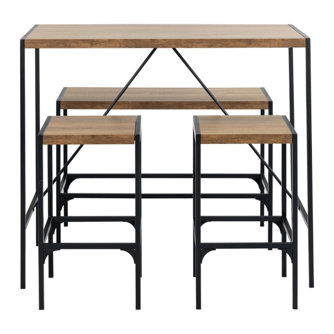 Az elegáns és stílusos Bahamas fa bárasztal szett tökéletes választás bármely otthoni bár vagy étkező számára. A készlet tartalmaz egy bárasztalt, két bárszéket és egy padot, így ideális baráti összejövetelekhez vagy családi vacsorákhoz. A porszórt fekete acél váz biztosítja a stabilitást és a tartósságot, miközben a rusztikus tölgyfa megjelenés elegáns és modern megjelenést kölcsönöz a szettnek.