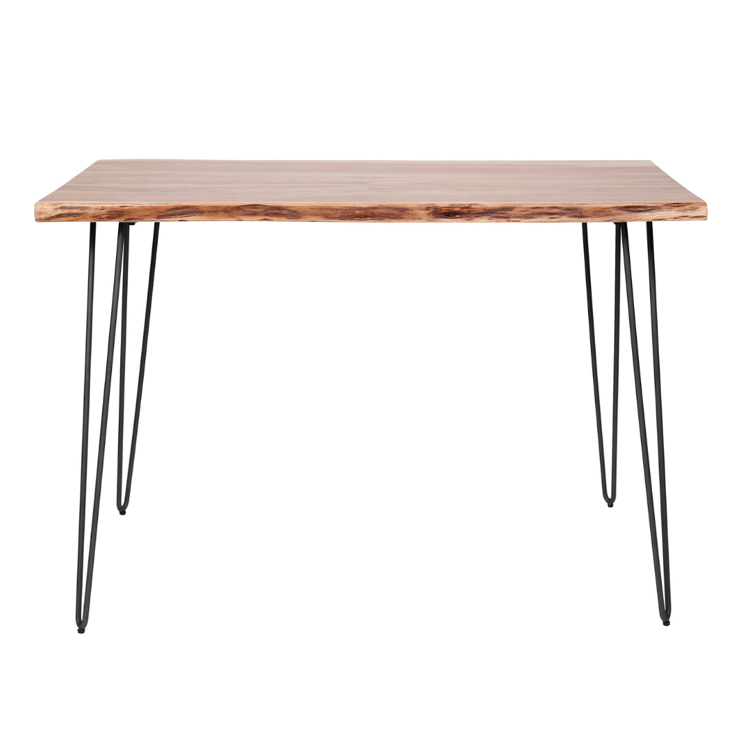 A natúr színű, természetes formájú akácfa asztallappal rendelkező Zistra 042 bárasztal egy modern megjelenésű bútordarab, amely a vékony, visszahajlított fekete fém lábaknak köszönhető. Praktikus kialakítása, és ideális mérete miatt könnyedén elhelyezhető konyhába, étkezőbe, vagy nappaliba is.