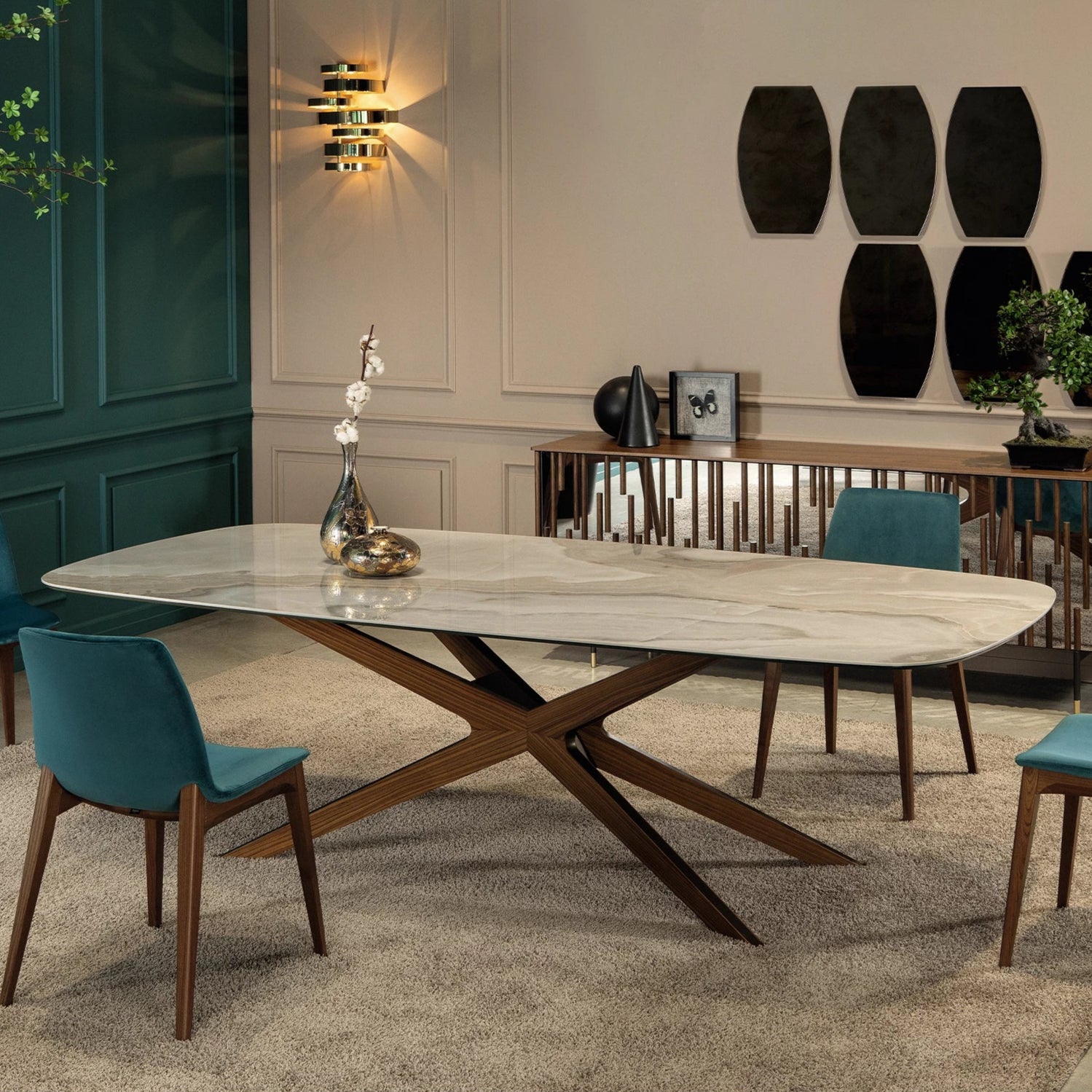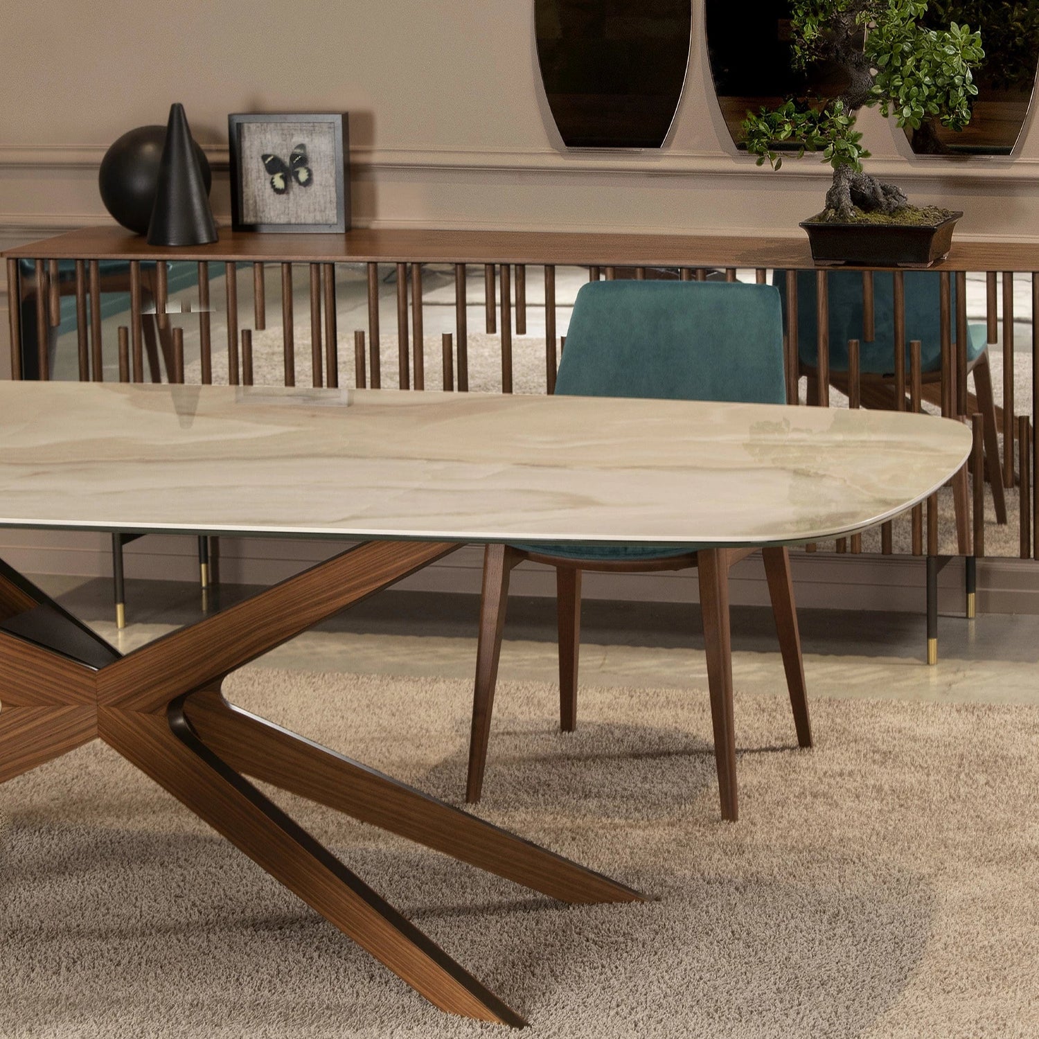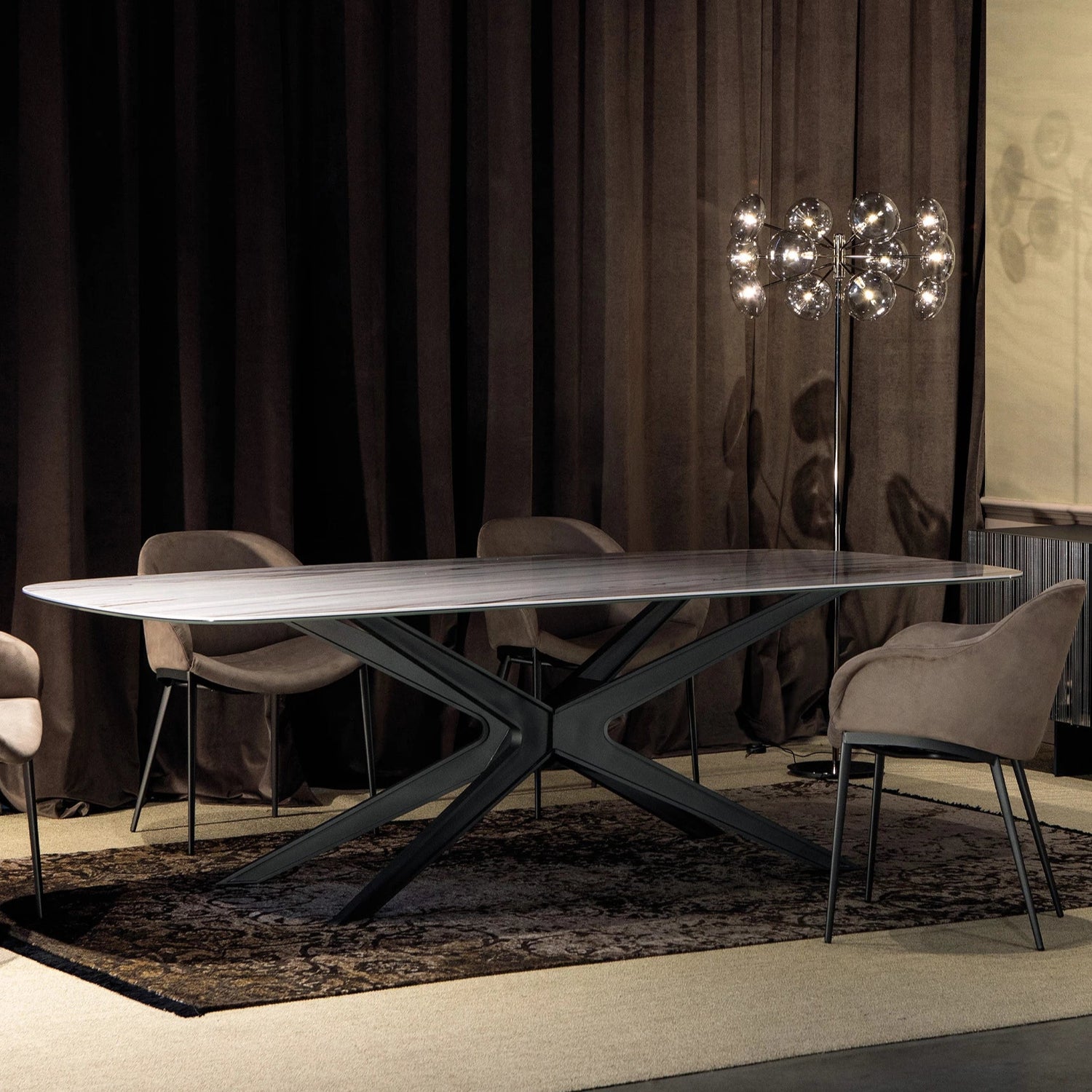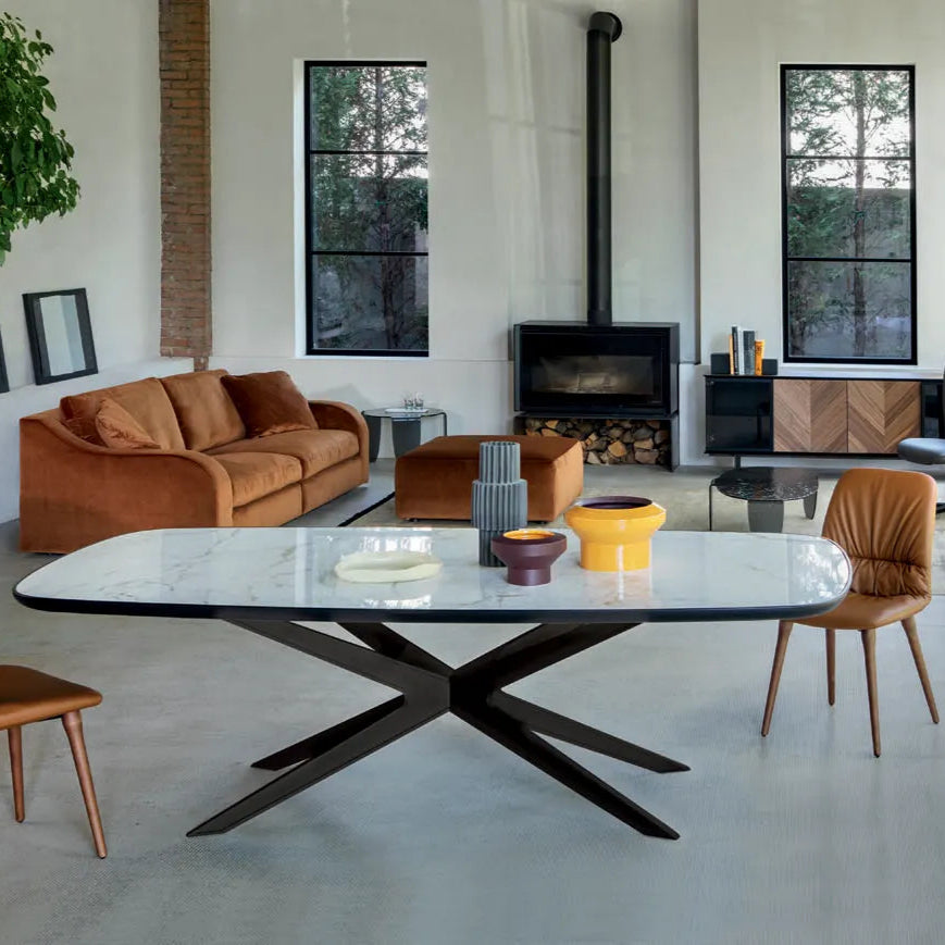 A Blade asztal központi talapzata festett acél talapzattal vagy fa borítással, amelynek sziluettje a teteje felé nyílik, könnyedséggel és eleganciával, így minden helyiség főszereplőjévé válik. Szögletes, lekerekített asztallappal választható, többet között fa, márvány és edzett üveg anyagokból. Elérhető méretei: 100x200x75 / 120x250x75 / 120x300x75 cm.