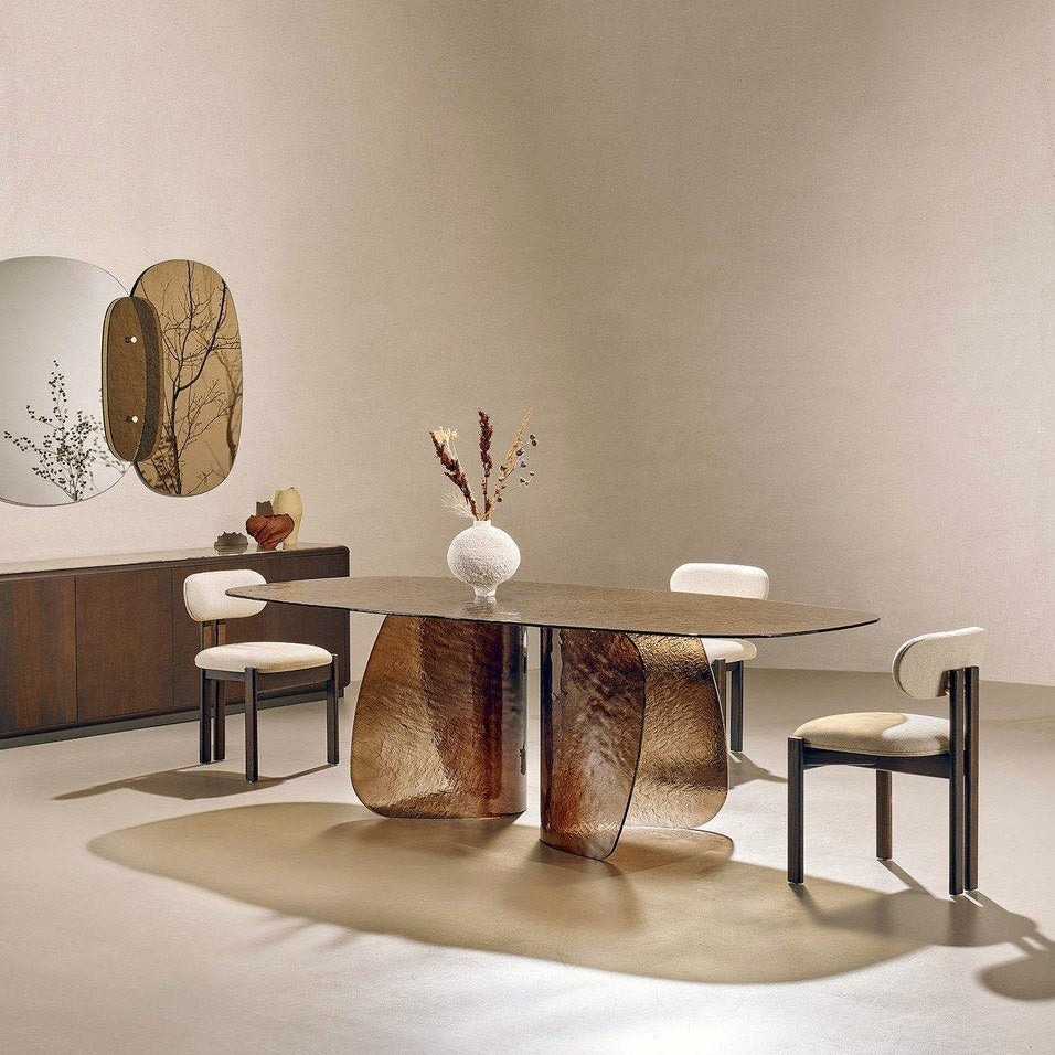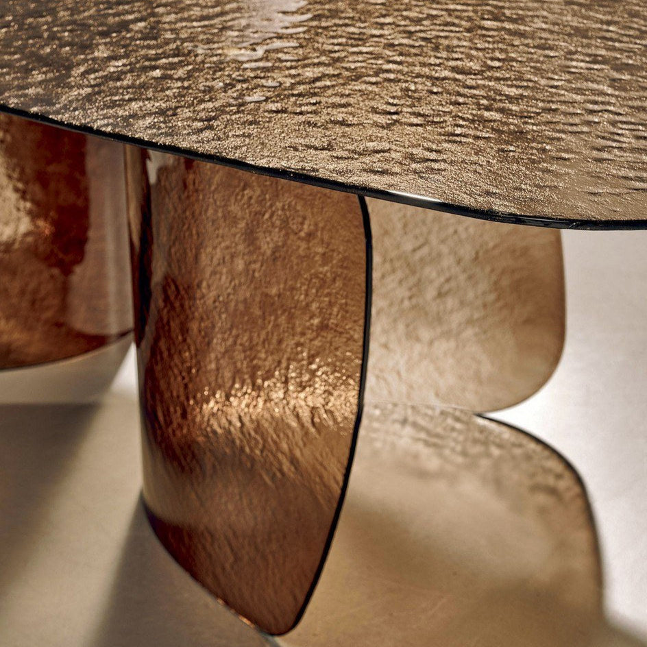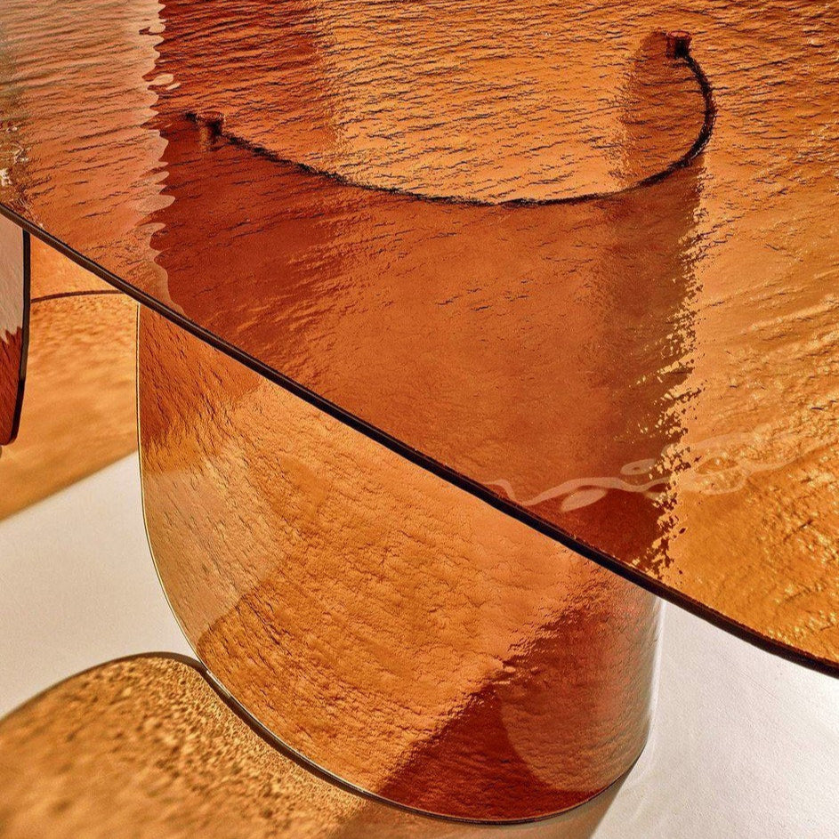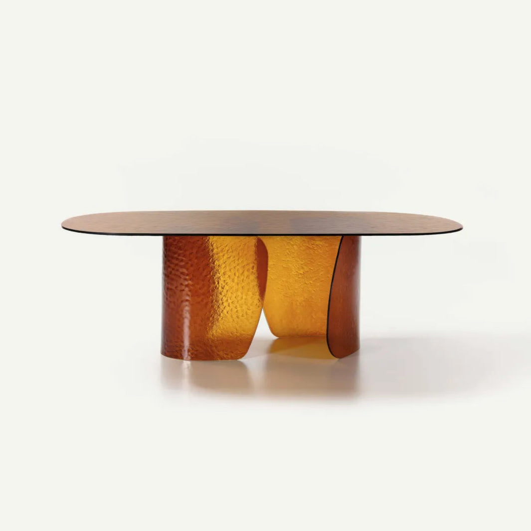 A Blur asztal finom ívei és lágy vonalai a folyékonyság érzetét keltik, a texturált üvegnek köszönhetően pedig szuggesztív fényhatást keltenek, amely átszűrődik az üvegen, élénkítve a környezetet. Az alap és a texturált öntött üveglap különböző színekben - átlátszó, barna, sötétszürke, sárga - kapható, ami a fény és a színek harmonikus keveredését eredményezi. Elérhető méretek: Ø 160x75 / 200x110x75 / 240x120x75 / 300x120x75.