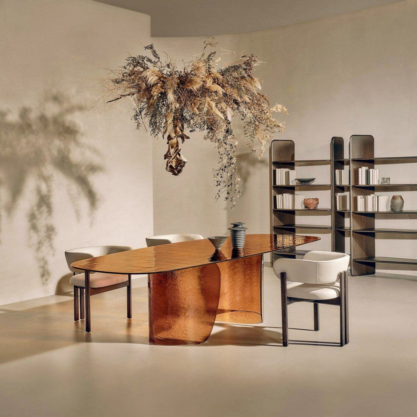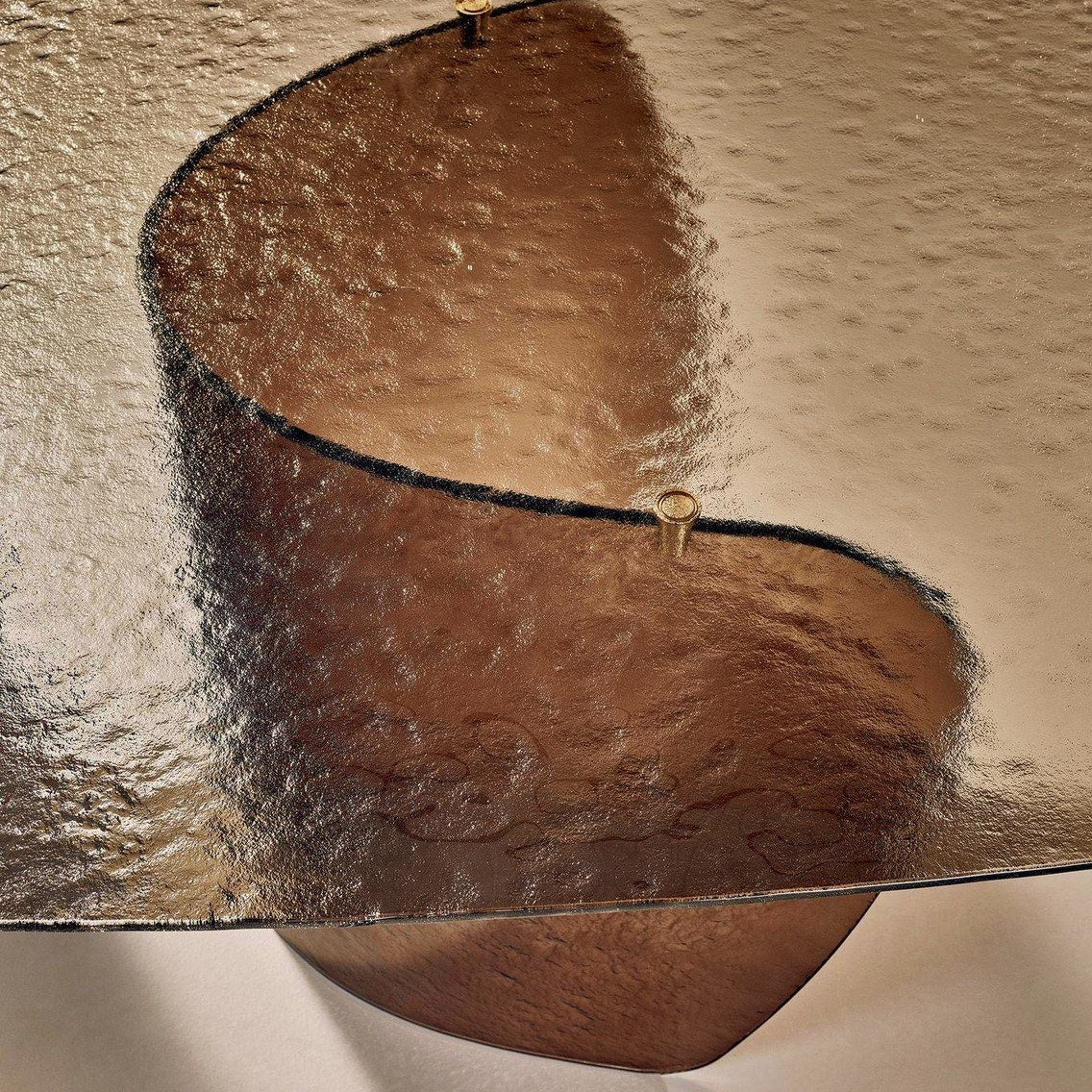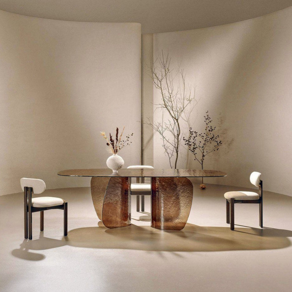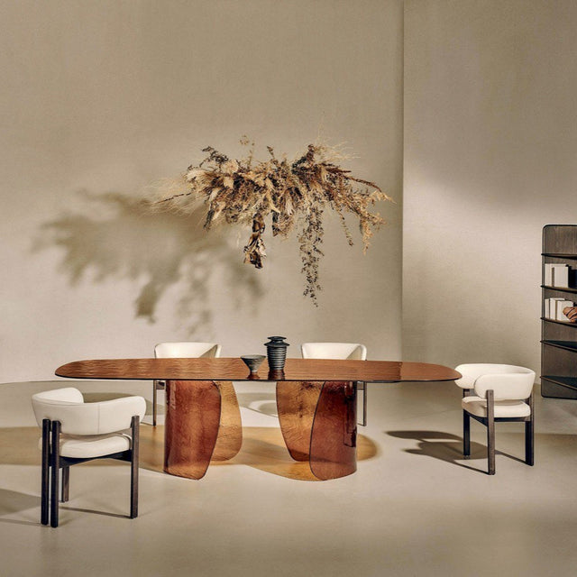 A Blur asztal finom ívei és lágy vonalai a folyékonyság érzetét keltik, a texturált üvegnek köszönhetően pedig szuggesztív fényhatást keltenek, amely átszűrődik az üvegen, élénkítve a környezetet. Az alap és a texturált öntött üveglap különböző színekben - átlátszó, barna, sötétszürke, sárga - kapható, ami a fény és a színek harmonikus keveredését eredményezi. Elérhető méretek: Ø 160x75 / 200x110x75 / 240x120x75 / 300x120x75.