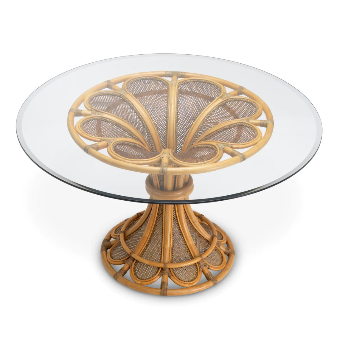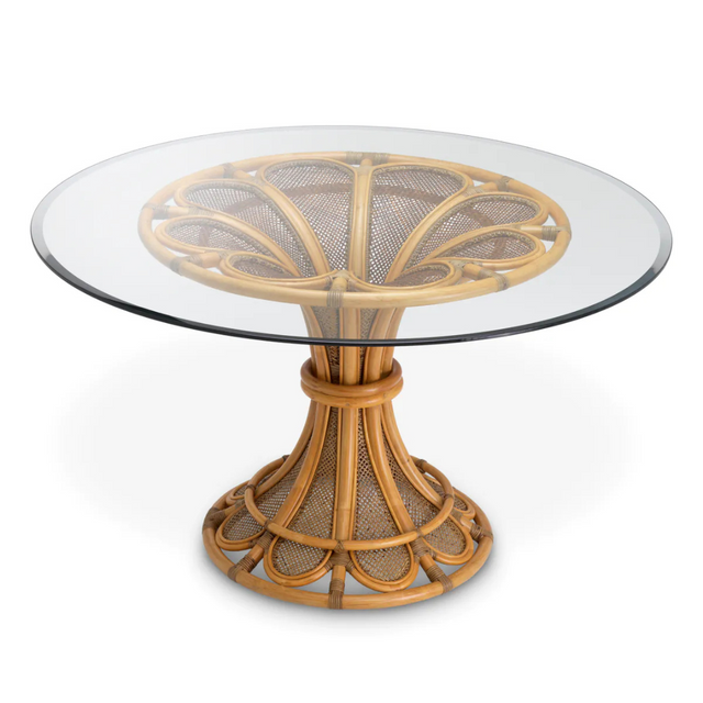 A Colony étkezőasztal egy lenyűgöző, kézzel készített, természetes rattanból fonott, átlátszó üveglappal és ferde éllel rendelkező bútordarab, amely a szakértői kézművesség művészetét testesíti meg. A klasszikus vonzerőt a modern luxussal ötvözi, így bármely tér remek kiegészítője lehet.