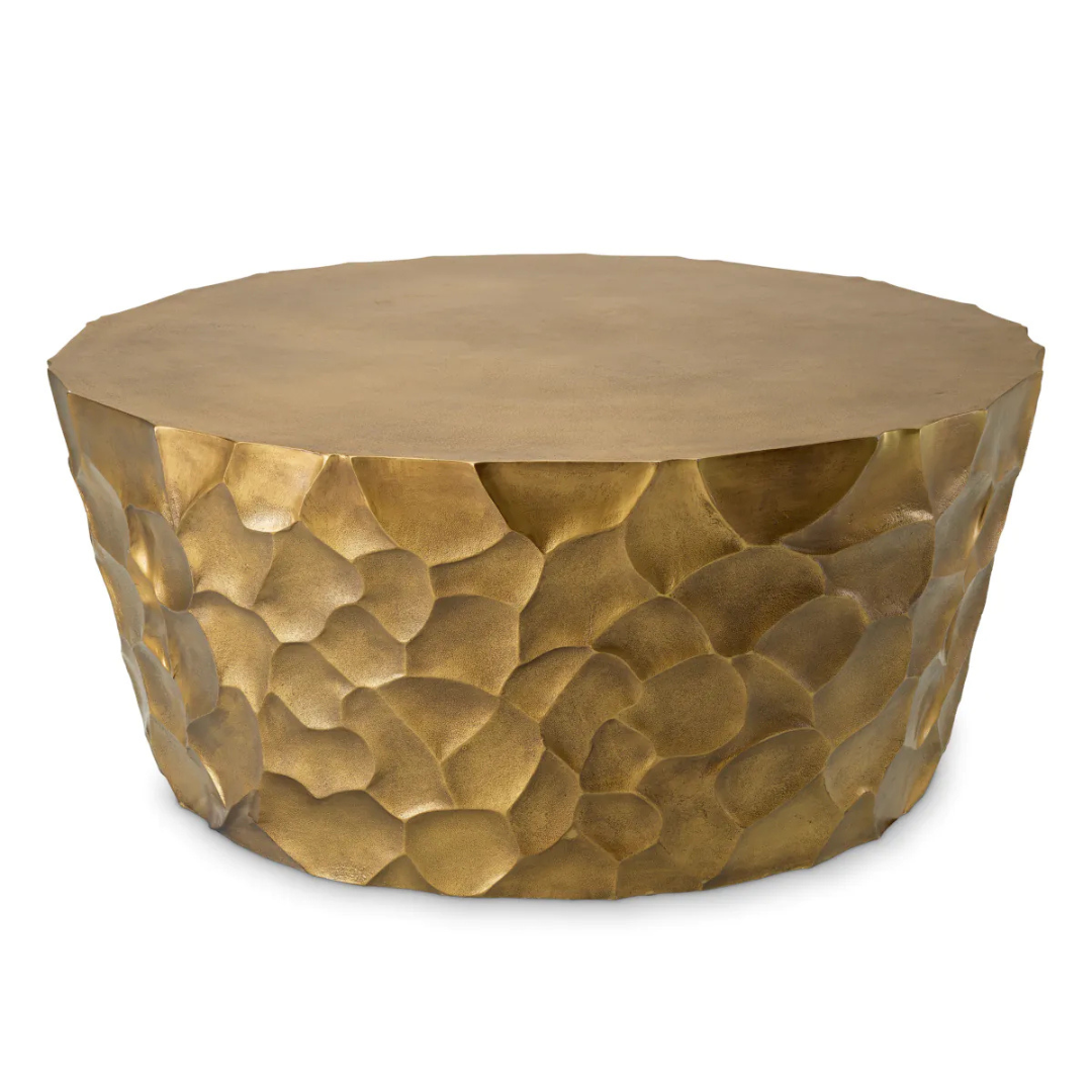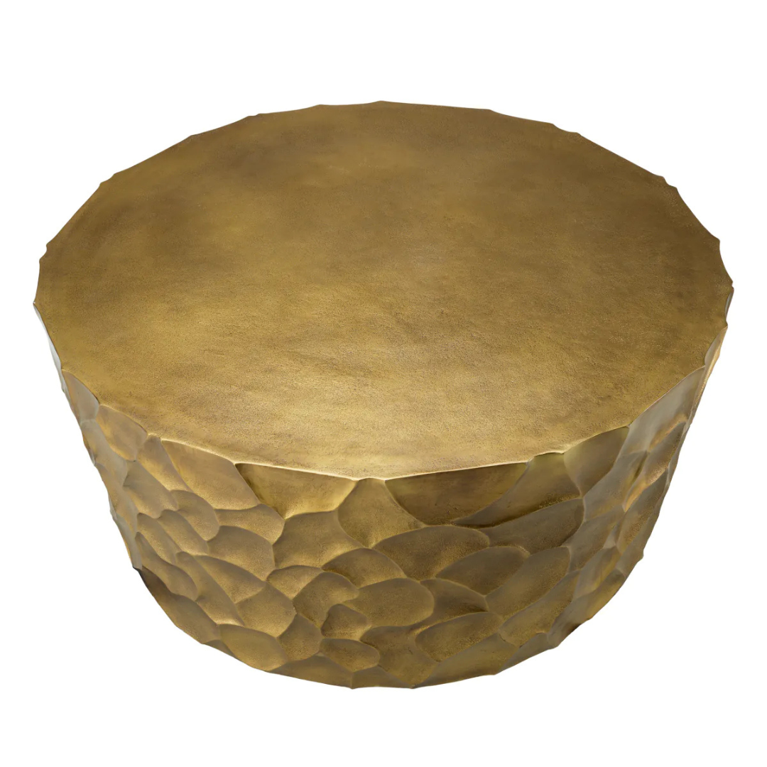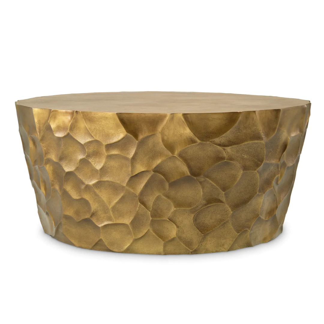 Keltsd életre otthonod a luxus megjelenésű Fiorentino dohányzóasztallal, amely egyedi dizájnt kölcsönöz bármely belső térnek. Ez a különleges darab szakértői munkával, alumíniumból készült, és jellegzetes vintage sárgaréz felülettel rendelkezik. A kör alakú asztallap felülete finoman érdes textúrájú, az oldalak pedig művészi mintázatúak. Bármelyik szögből nézed, más esztétikai élményben lesz részed.