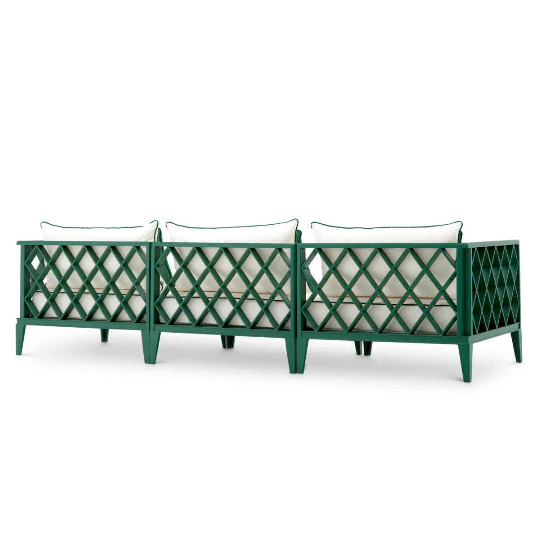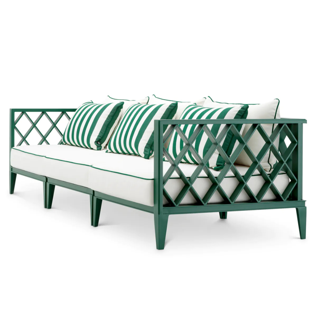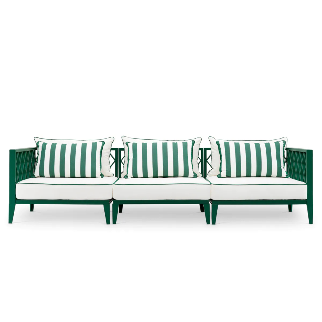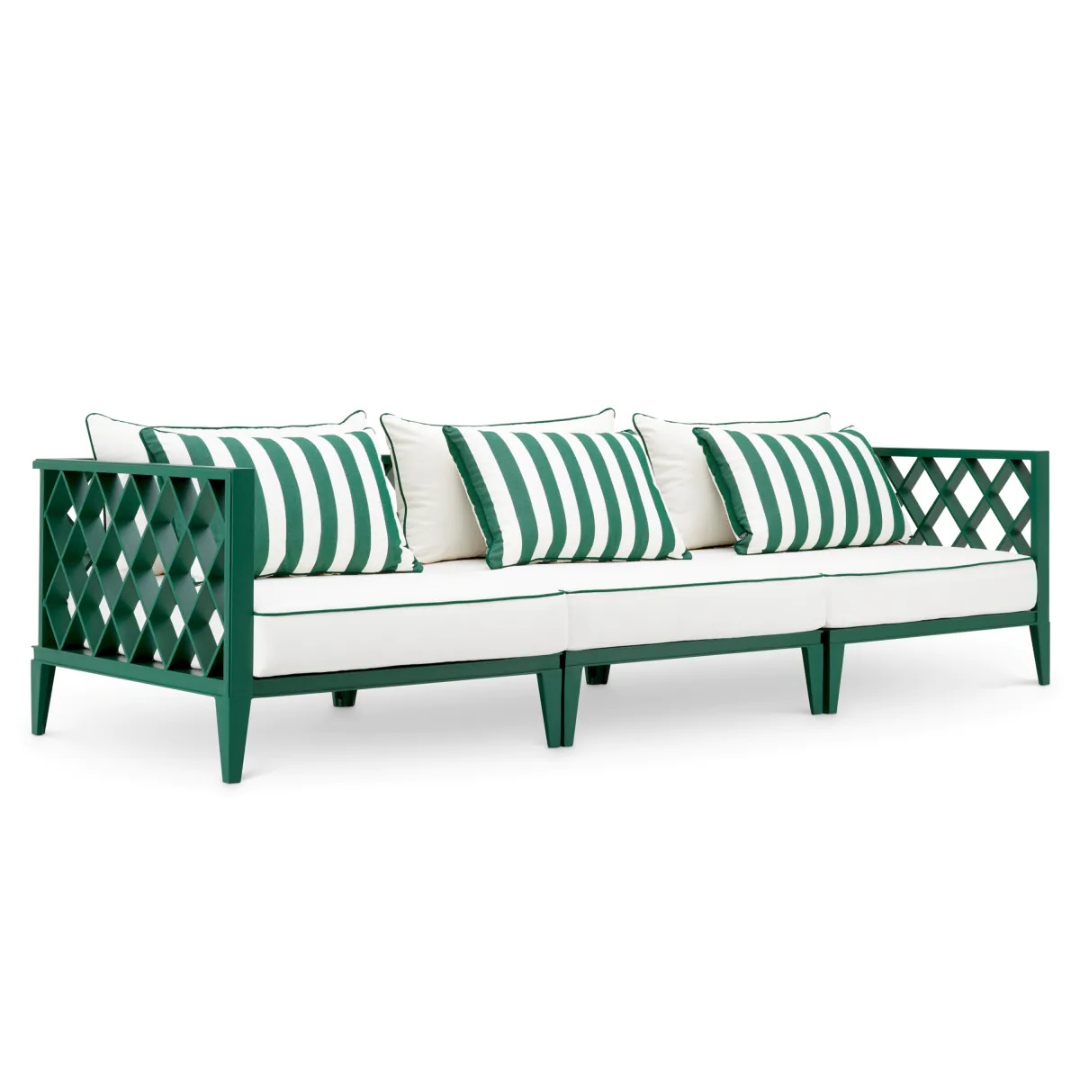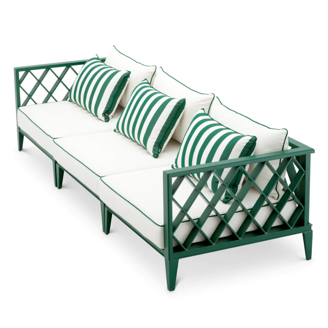 A 3 személyes Ocean Club kerti kanapé egy különleges megjelenésű, elegáns bútordarab, mely ideális választás lehet otthoni vagy szállodai kerti teraszra, medence mellé illetve bármilyen kültéri helyiségbe. A kanapé sötétzöld akril vázra épül, mely stabilitást és tartósságot biztosít, a fehér, illetve csíkos puha párnák és szivacsok pedig tökéletes kényelmet nyújtanak. Az Ocean Club kanapé igazi stílusos és exkluzív darab, mely minden térben elegáns atmoszférát teremt.