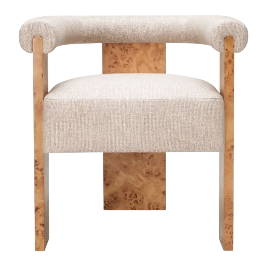Fedezd fel a Percy étkezőszéket, amelyben a világosbarna mappa burl furnér és a bézs színű Loki szövet természetes melegsége találkozik. A mappa burl, amely bonyolult, kavargó erezetéről és gazdag vizuális mélységéről ismert, egyedi karaktert kölcsönöz a dizájnnak. Ez a szék finom textúrákat és földes árnyalatokat ötvöz, meghitt sziluettet teremtve, amely visszafogott eleganciát és tapintható luxust testesít meg a kifinomult, időtálló bájt kifejező belső terek számára.
