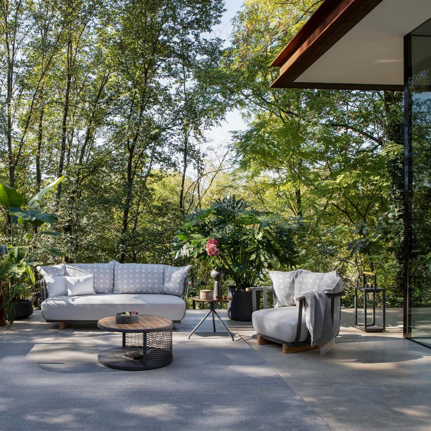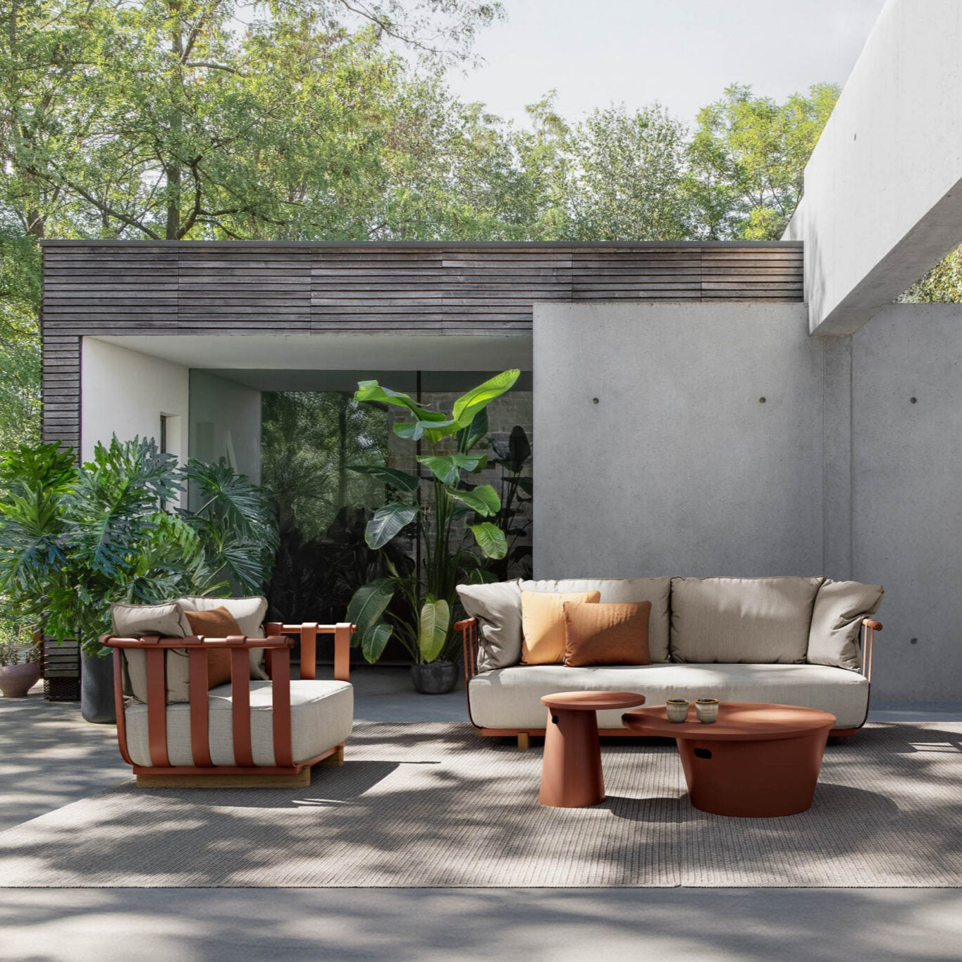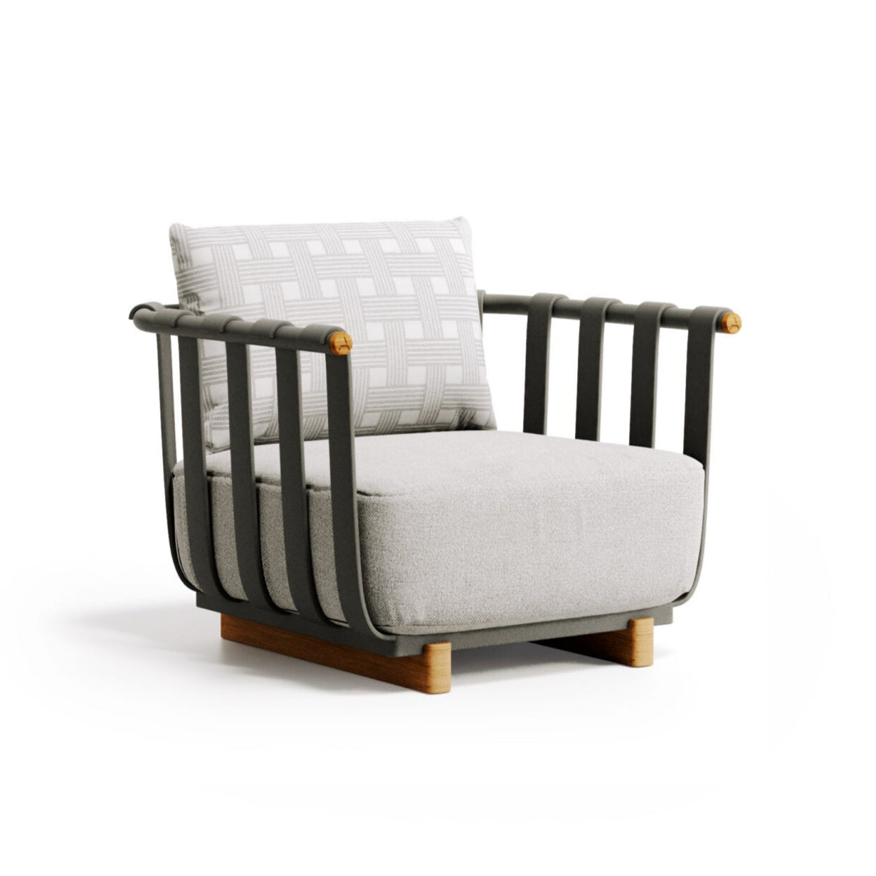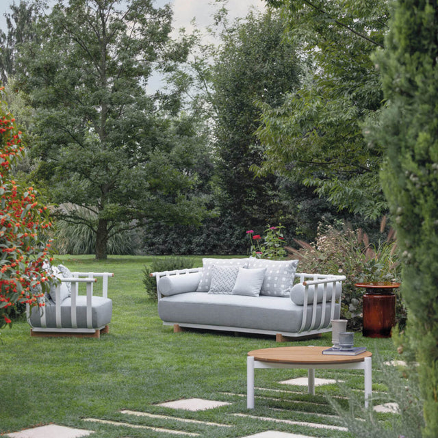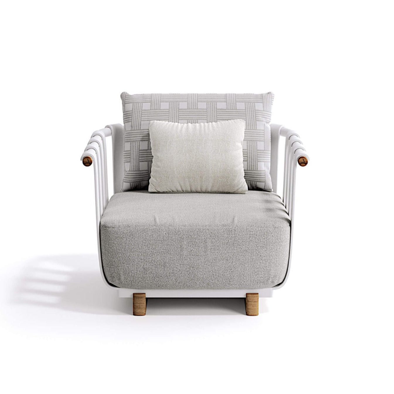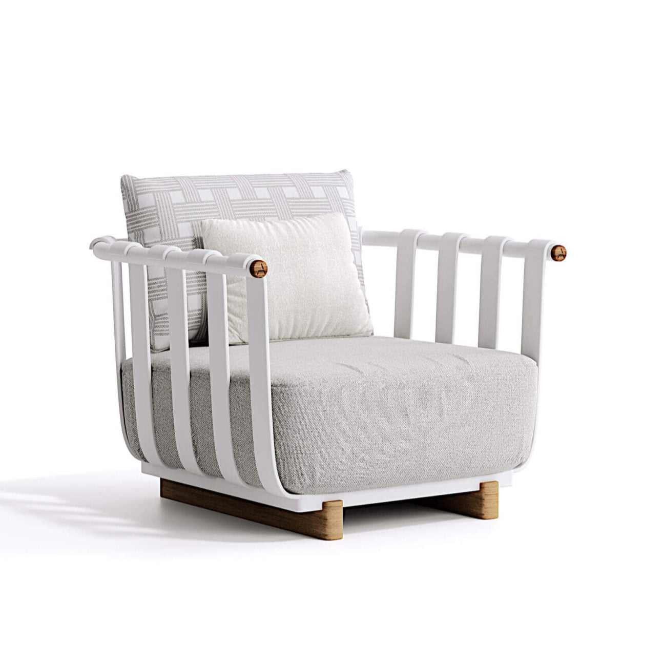 A Portofino eklektikus kettősségét a kanyargós, klasszikus formák és a modern, lineáris szerkezet kontrasztja fejezi ki. Az alumíniumot természetes teakfa részletekkel kombinálták, hogy ennek a kollekciónak egyedi és időtlen jelleget kölcsönözzenek. A hátpárnák 2 változatban kaphatók.