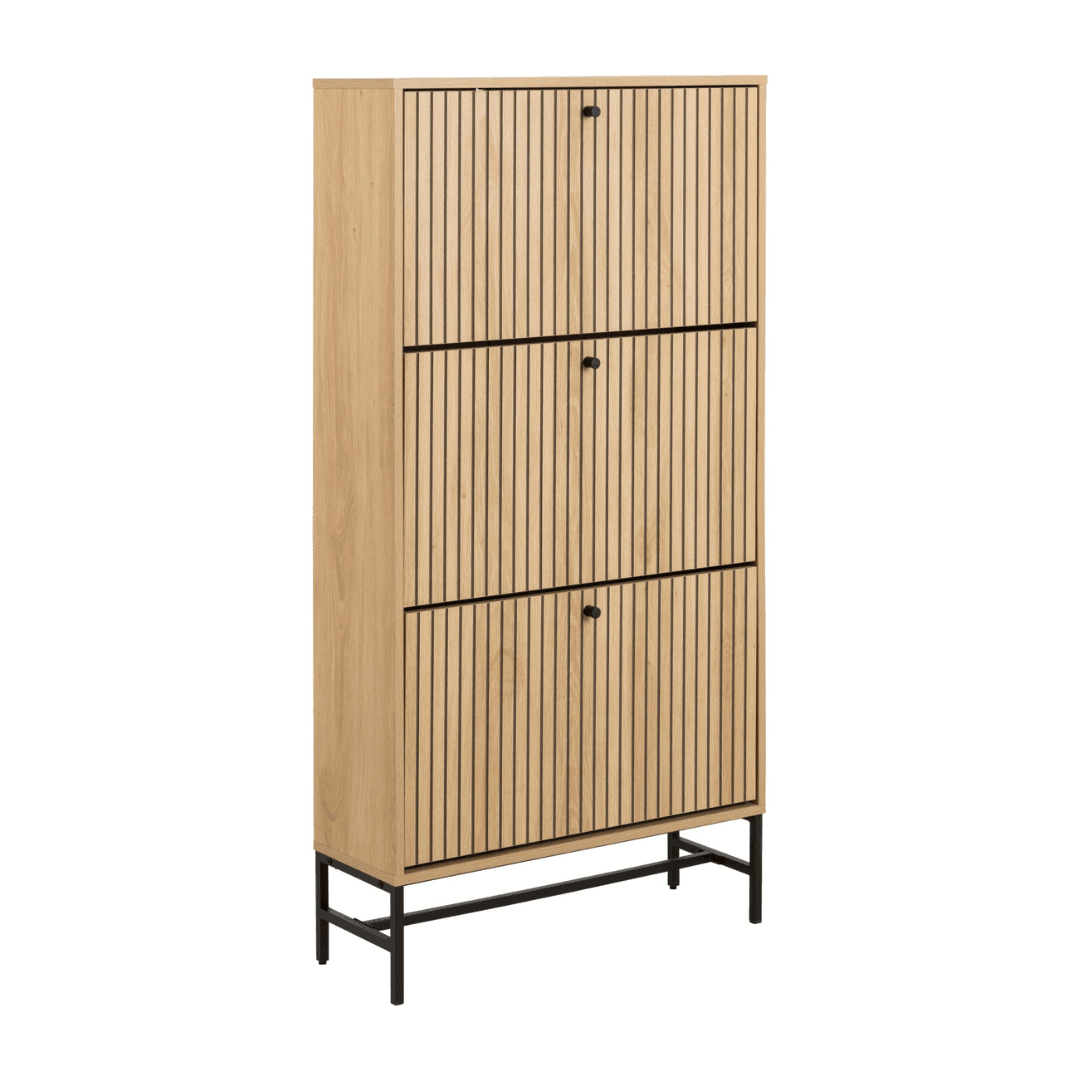 Ez a tölgyfa megjelenésű, lamellás előlappal díszített Albany cipőszekrény stílusossá és praktikusabbá teszi az előteret. A vizuális mélységgel játszva a geometriai elemek életre keltik a felületet, emellett a kontrasztos színek, és anyagok használata kiemelik a térből. Három rekesszel rendelkezik, így kihasználja a helyet, és diszkréten tárolja cipőidet. Natúr színe miatt könnyedén illeszkedik a modern és a klasszikus környezetbe is.