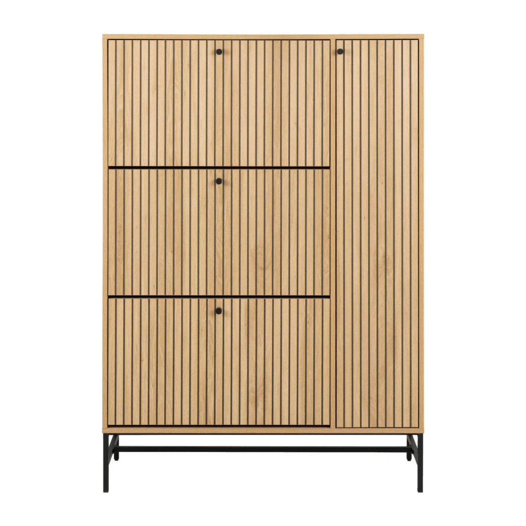Az Albany cipősszekrény modern és praktikus megoldást kínál a cipők és egyéb tárolnivalók rendszerezésére. A bútor elegáns, lamellás felülete, és natúr színe miatt stílusos megjelenést kölcsönöz, míg a fekete fém lábak stabil alátámasztást biztosítanak. A cipősszekrény három kihajtható rekesszel rendelkezik, emellett egy oldalsó ajtóval, mely mögött négy polc áll rendelkezésre a cipők, papucsok és egyéb lábbelik elhelyezésére.
