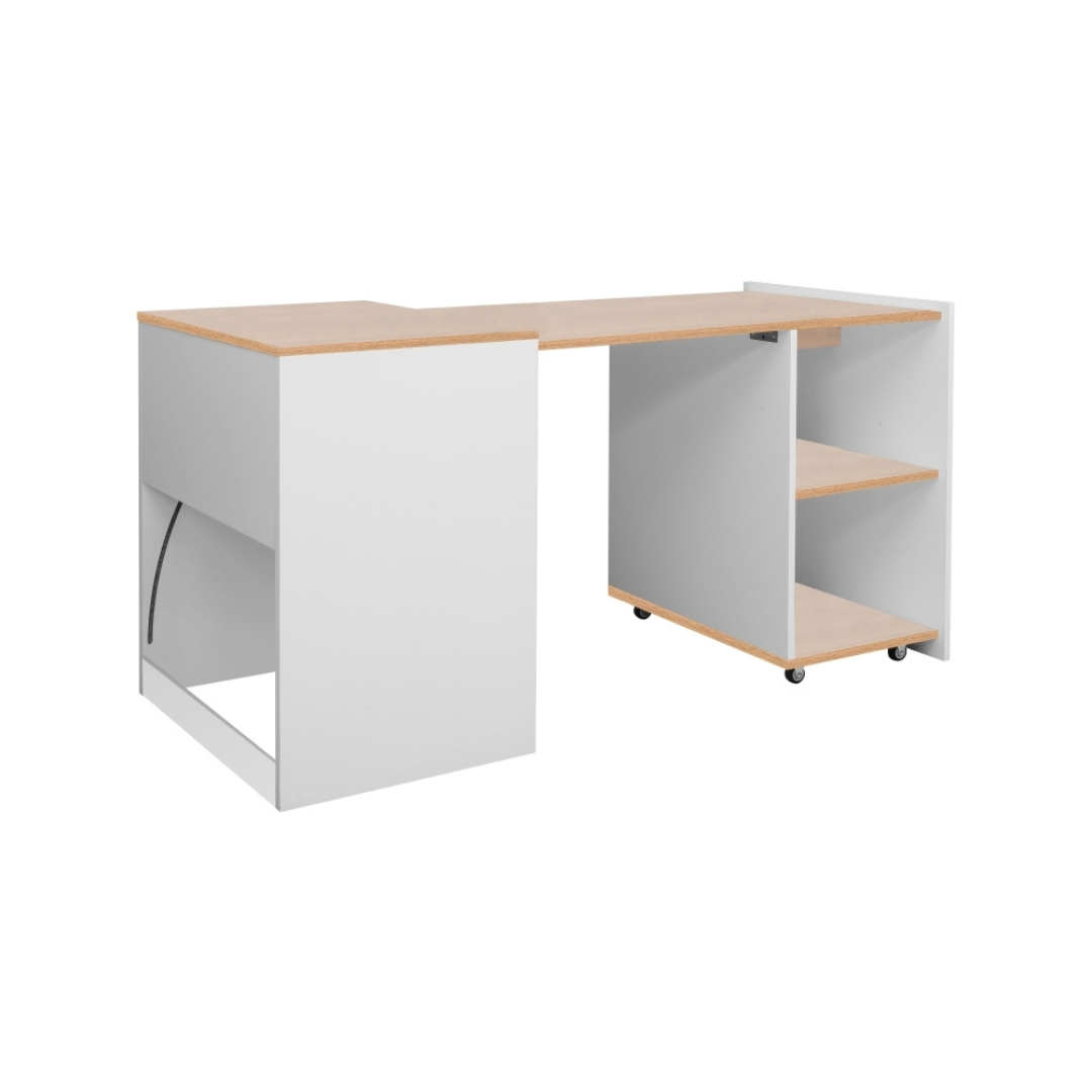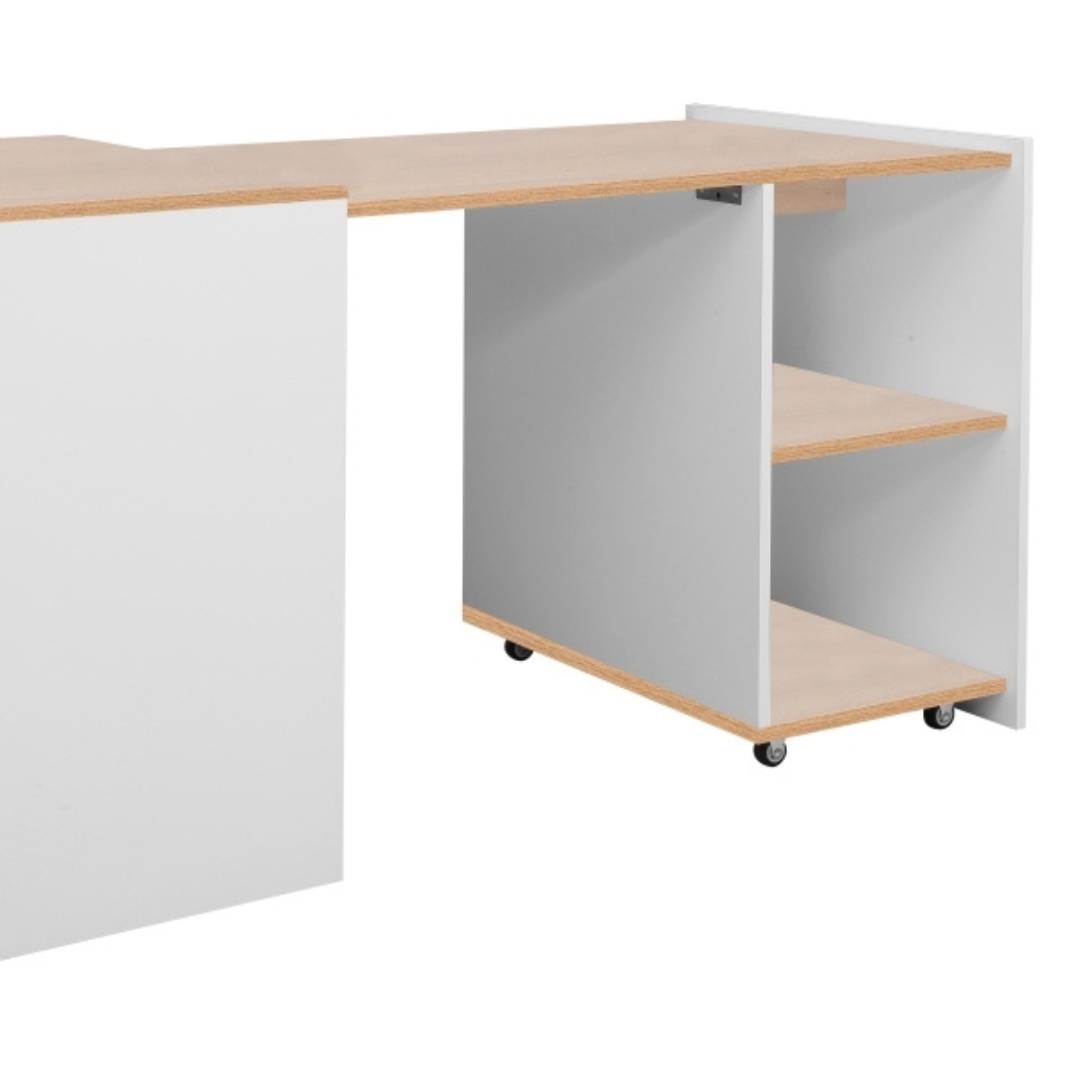 A Duo íróasztal egy praktikus bútordarab, mely két részből áll, így kényelmesen elfér rajta minden a munkához szükséges holmi. A kerekeken álló polcos rész szabadon, és könnyen áthelyezhető a kívánt pozícióba. Natúr színű lapjai elegánsan kiegészítik a fehér alapot, ezért kiválóan illeszkedik minden stílusú belső térbe.