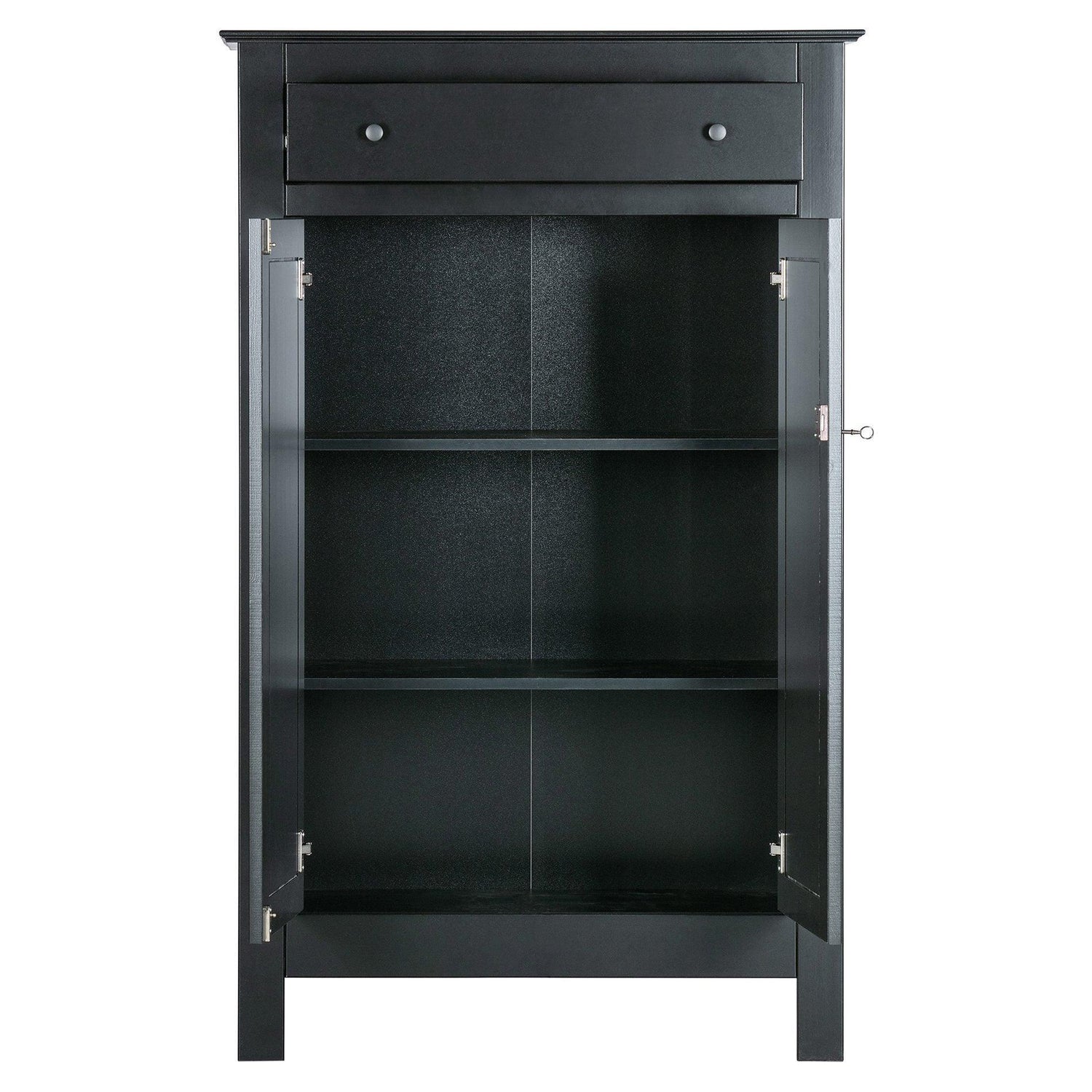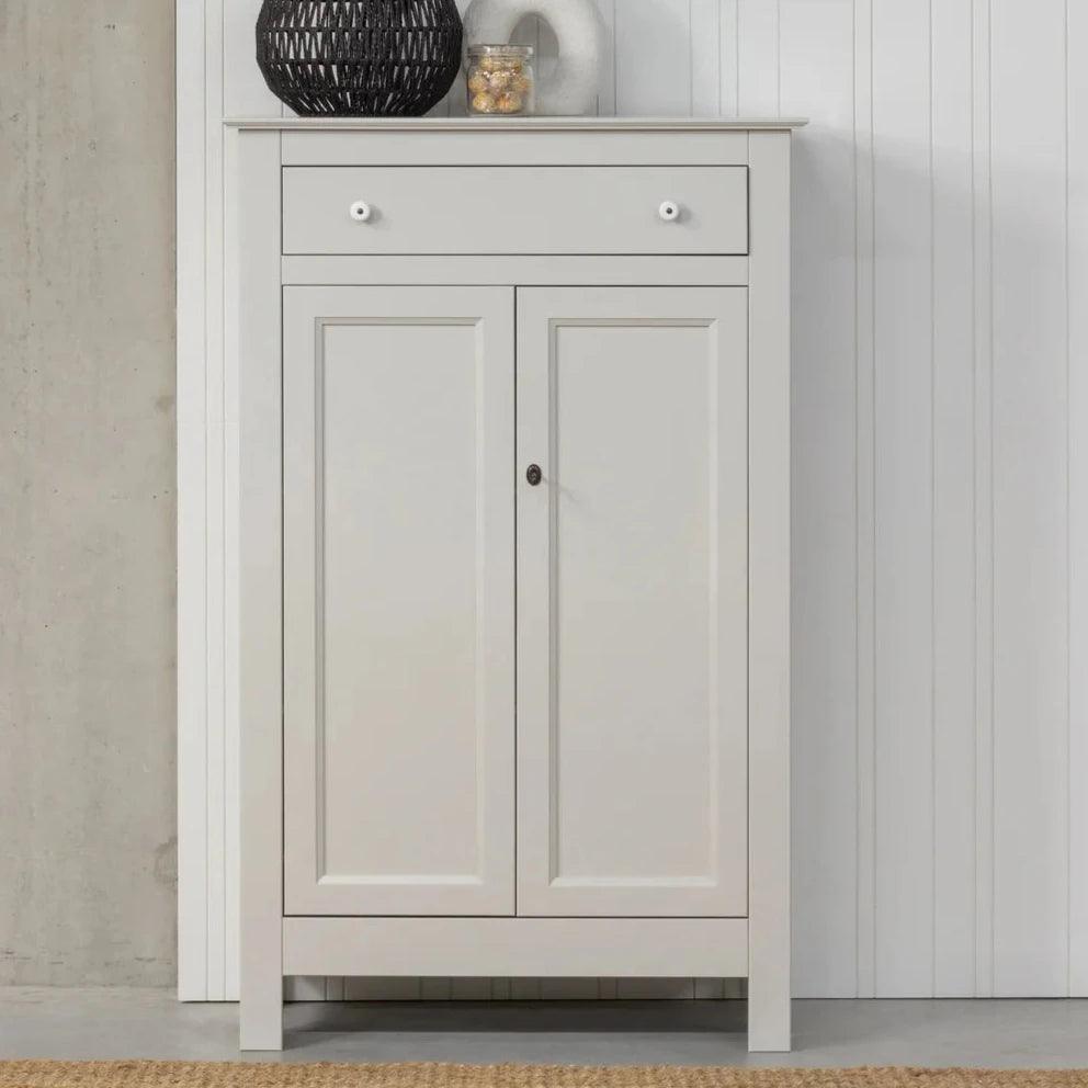 Egészítsd ki otthonod az Eva 2 ajtós fa kabinettel. A szekrény belseje fából készült, a tetején található praktikus fiók pedig 2 porcelán gombbal, tömör fém fiókvezetőkkel van ellátva. A benne található 3 széles polc segítségével rendszerezetten tárolhatod benne dolgaidat. Két ajtaja zárral és kulccsal van ellátva. Ezáltal Eva nemcsak stílusos, de rendkívül praktikus is.