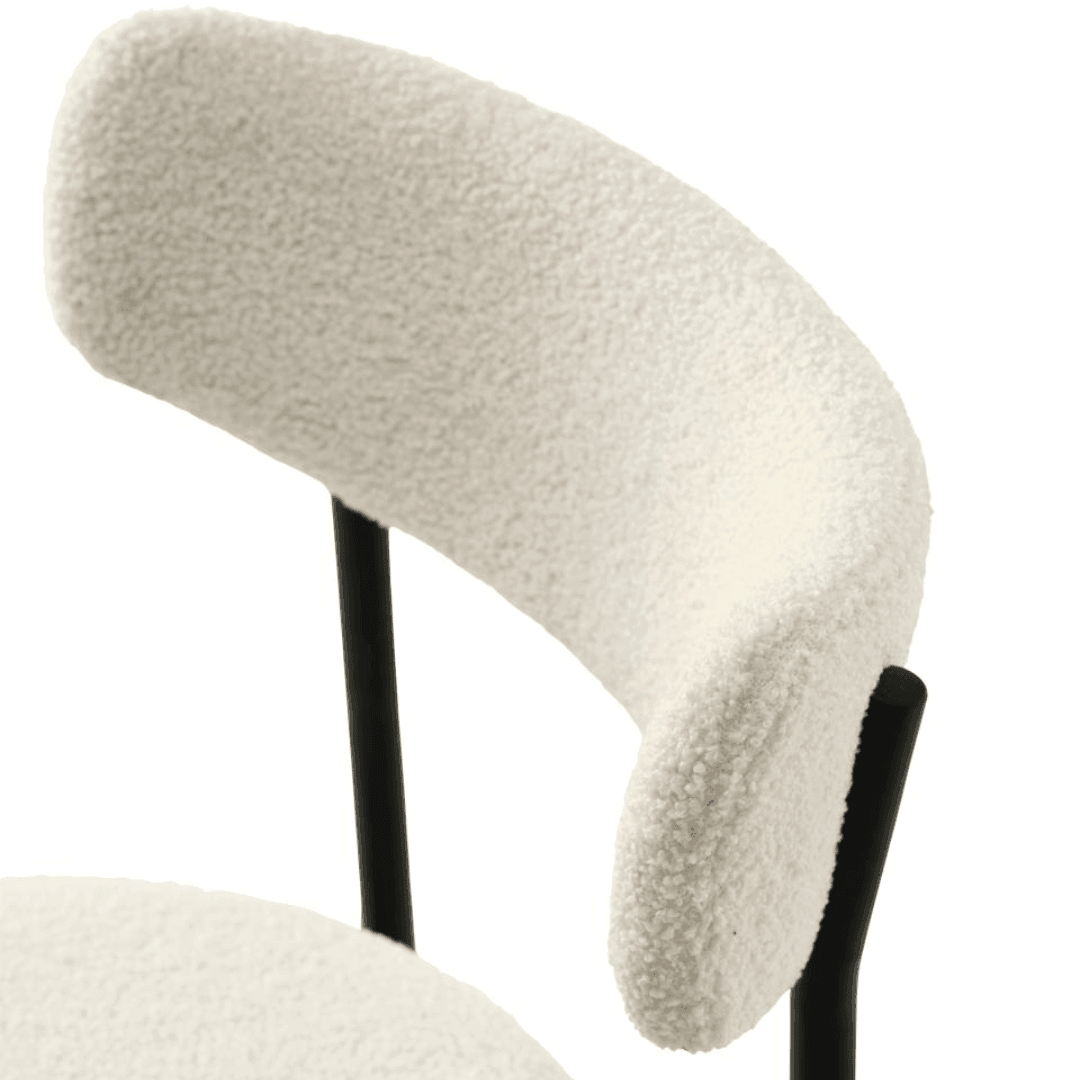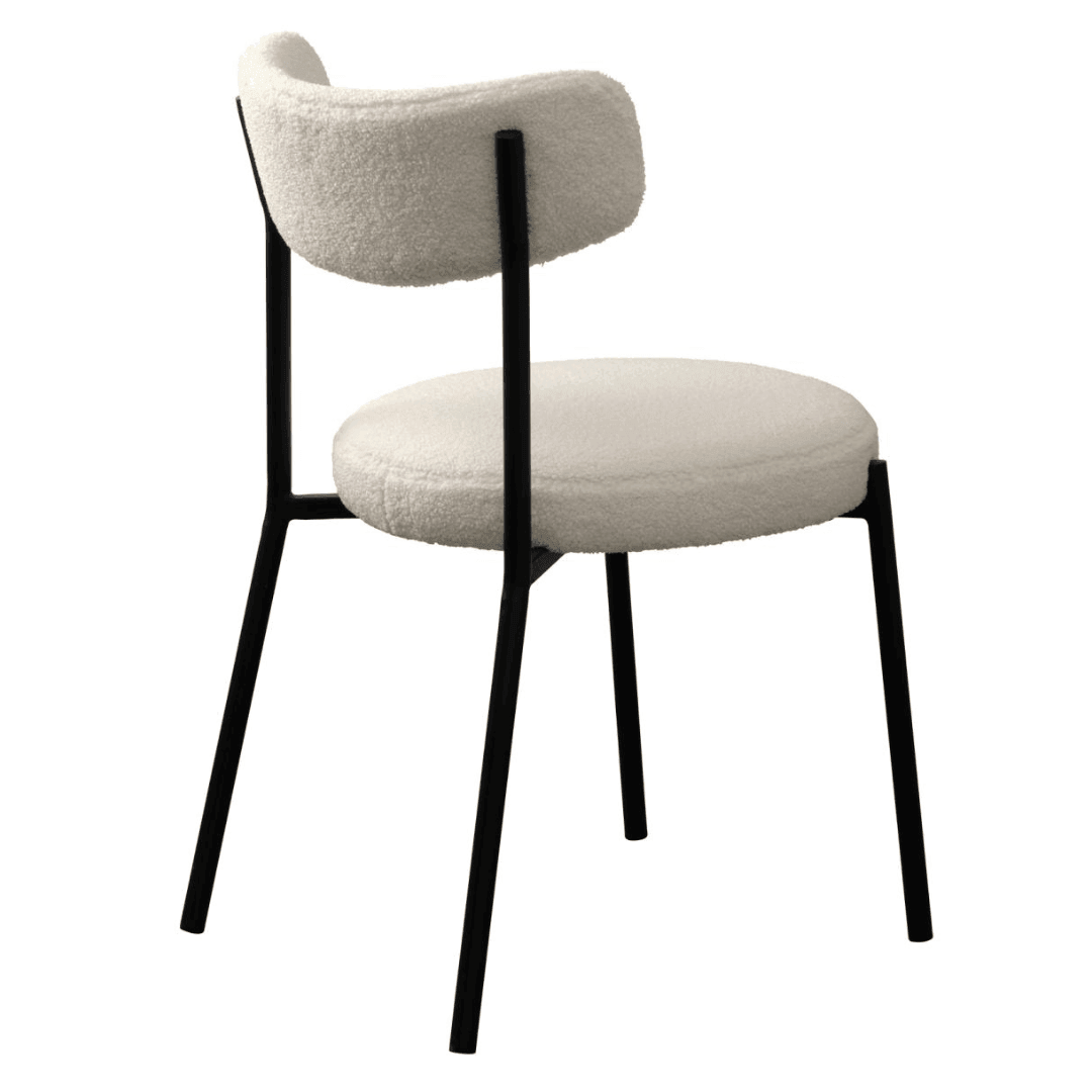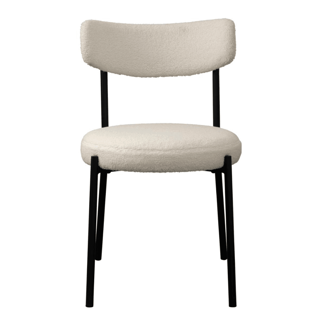 Az Gimli szék teddy anyaga 100% poliészter szövetből készült, ami egy könnyen kombinálható és tartós anyag. A lábak fekete porfestett fémből készültek, amelyek modern megjelenést biztosítanak és stabil alapot nyújtanak a széknek. A fehér és a fekete kontrasztja nagyszerűen kiemeli ezt a széket, míg a teddy anyag igazán kényelmessé teszi.