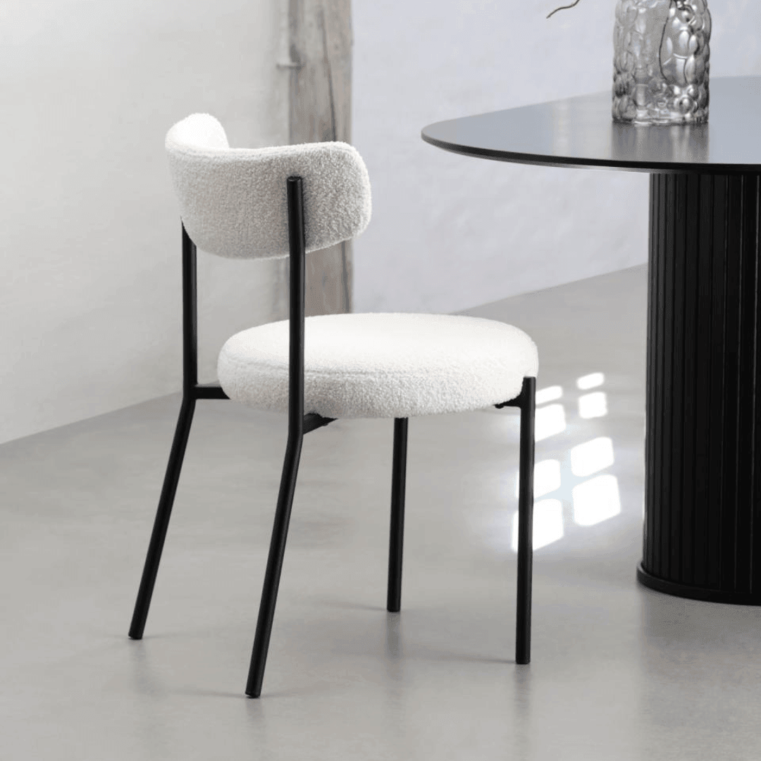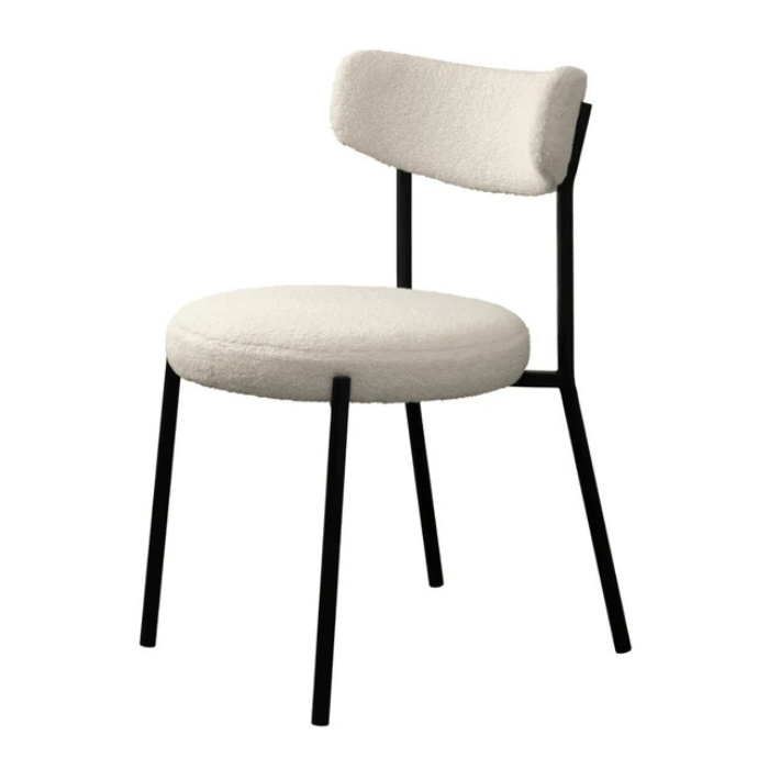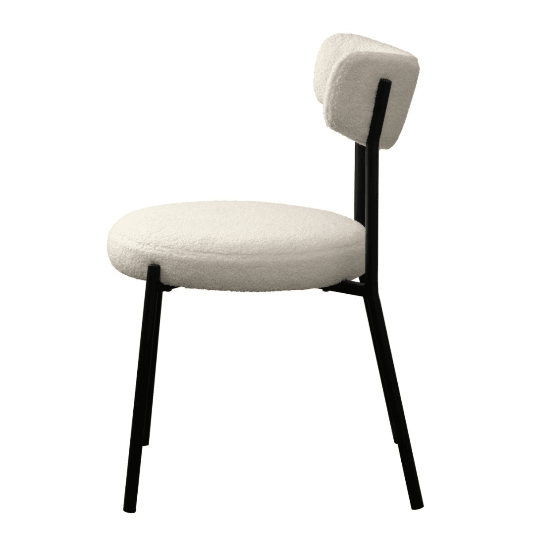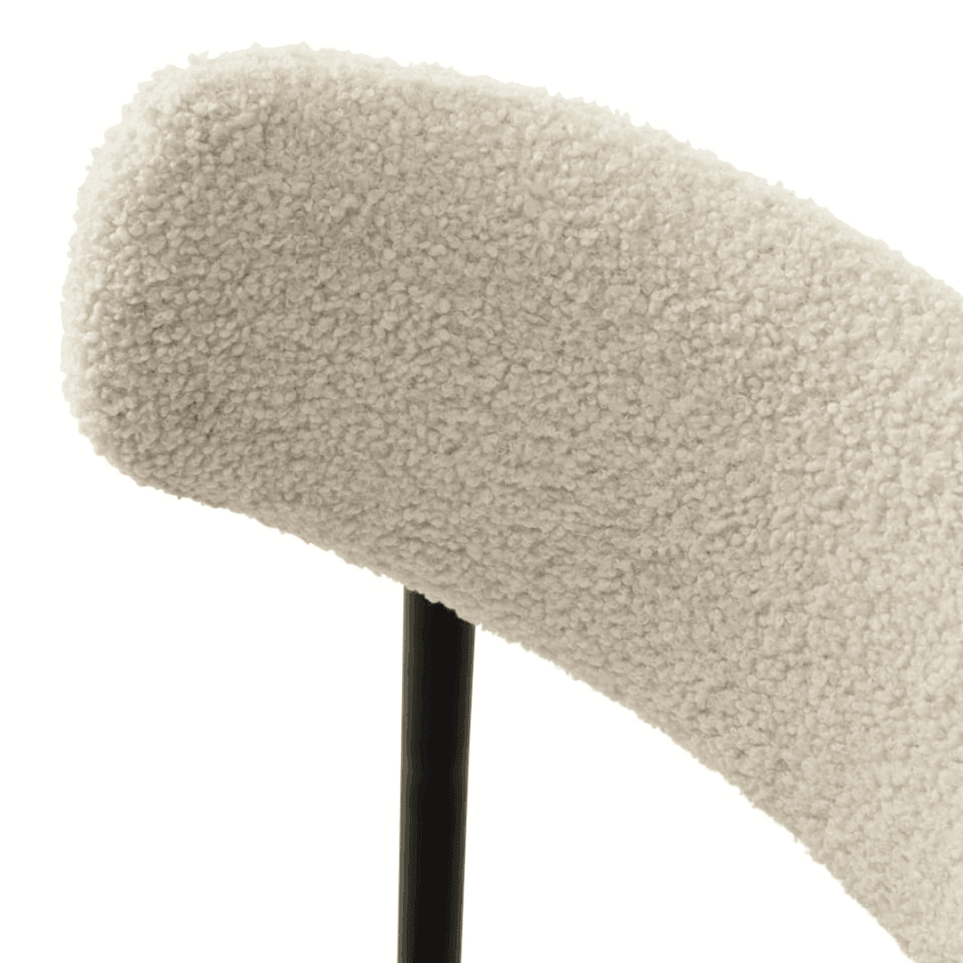 Az Gimli szék teddy anyaga 100% poliészter szövetből készült, ami egy könnyen kombinálható és tartós anyag. A lábak fekete porfestett fémből készültek, amelyek modern megjelenést biztosítanak és stabil alapot nyújtanak a széknek. A fehér és a fekete kontrasztja nagyszerűen kiemeli ezt a széket, míg a teddy anyag igazán kényelmessé teszi.