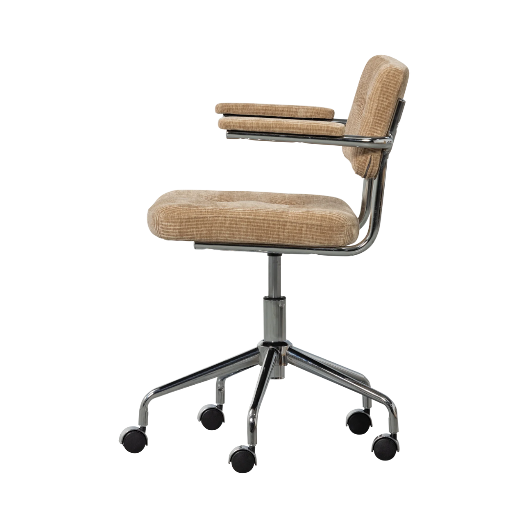 Tanulj vagy dolgozz stílusosan, a Kova irodai székünkkel, melyen kényelmesen ülhetsz az íróasztalánál. A Kova a holland Woood lakberendezési márka kollekciójából származik. A szék kerekekkel és egy karral rendelkezik az ülésmagasság beállításához. A szék világosbarna kordbársonnyal kárpitozott üléssel, háttámlával és karfákkal is rendelkezik, ez biztosítja a magas kényelmet.