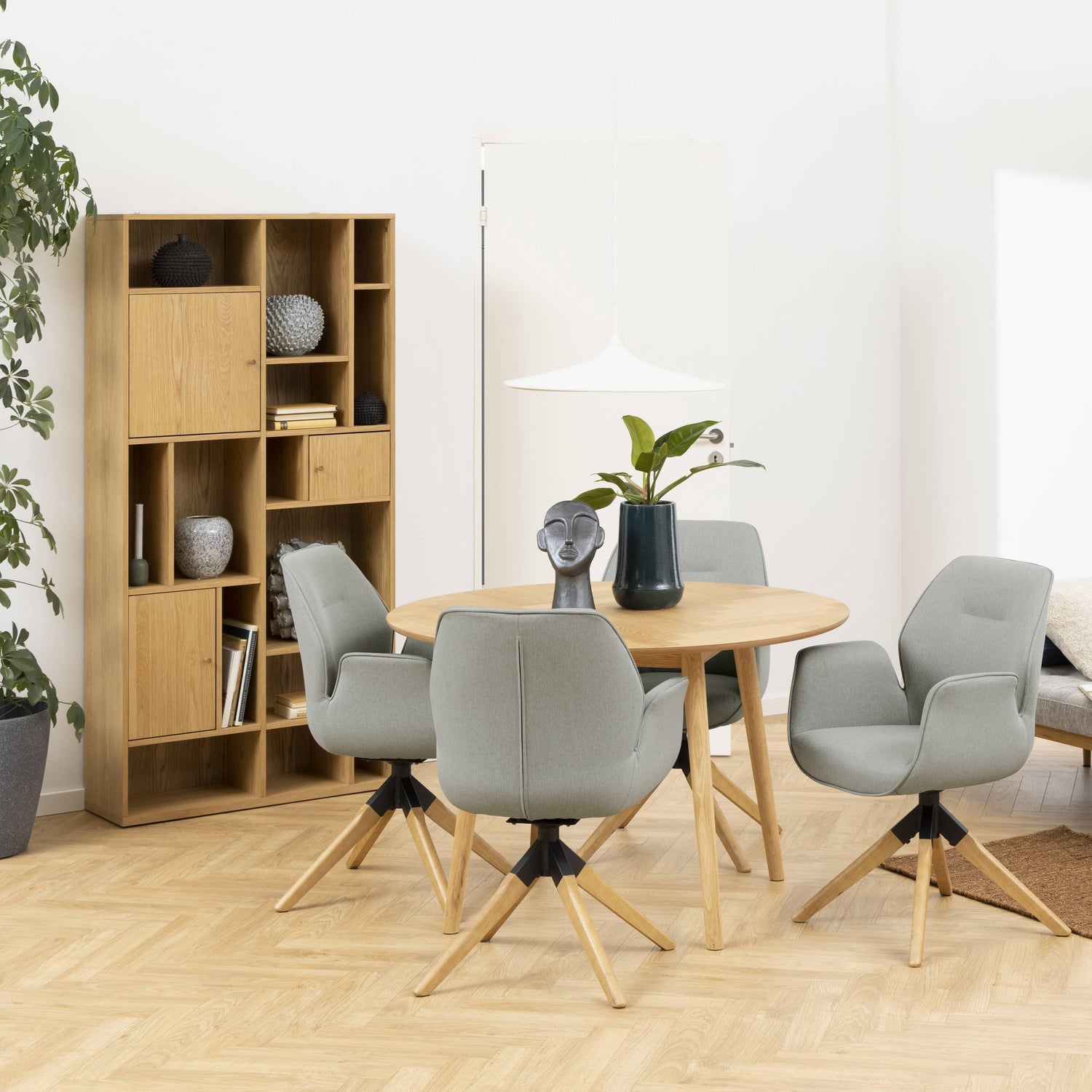 A Rangoon könyvespolc harmonikusan ötvözi a természetes bájt és a vizuális érdekességet. Az aszimmetrikus stílusban elrendezett nyitott és zárt tárolóhelyekkel ez a könyvespolc bőséges helyet biztosít, és egyben szemet gyönyörködtető is. Olajjal kezelt tölgyfa furnérból készült, erezetmintázatát az olajozott felület fokozza, hozzájárulva a lakótér meleg hangulatához.