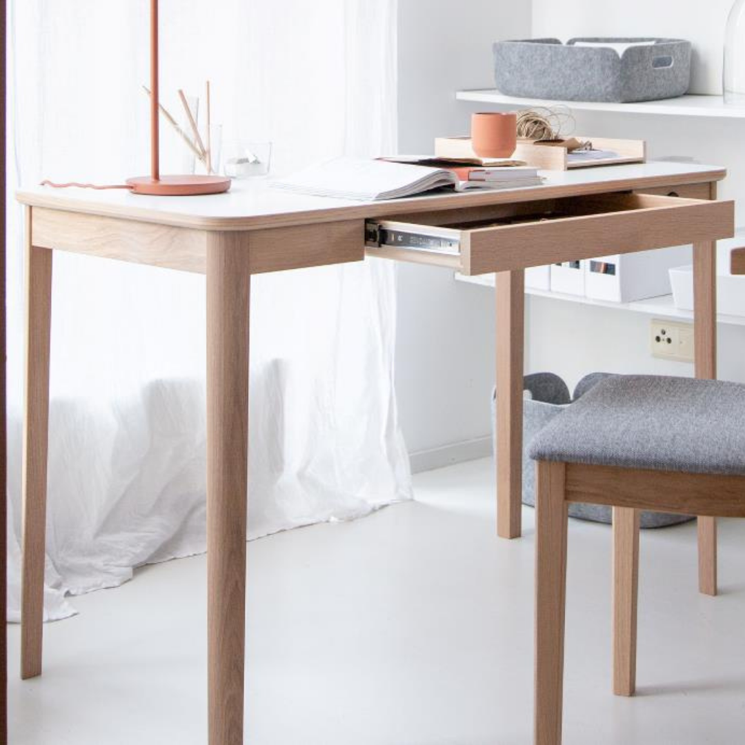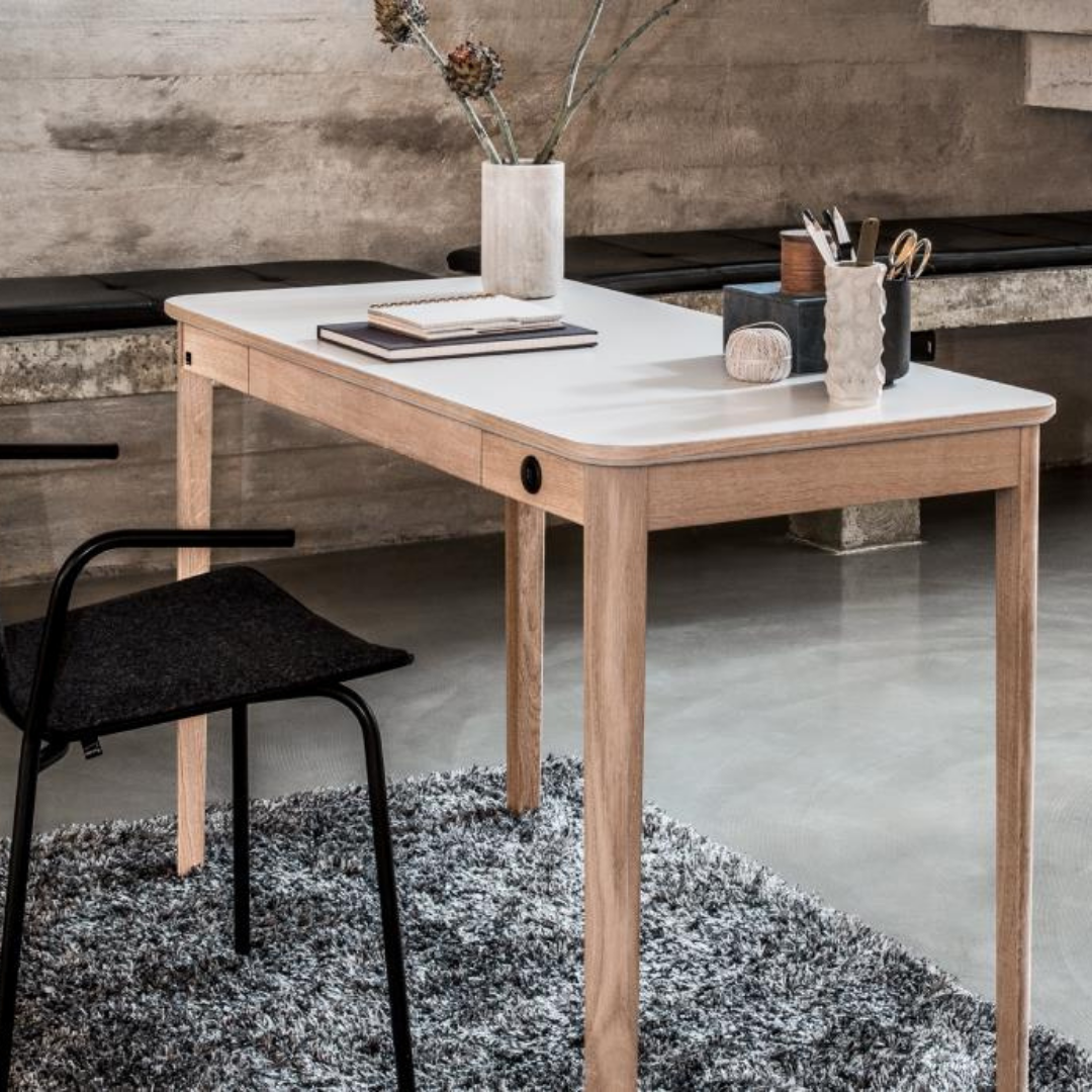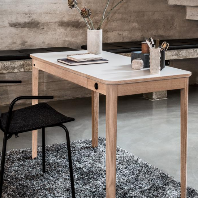 Az új Skovby 131 íróasztal lekerekített sarkokkal, és egy fiókkal rendelkezik. Letisztult kialakítása funkcionális munkaterületet biztosít. Az íróasztal klasszikus alsó vázzal rendelkezik, négy falábbal, amelyek minden sarokban rögzítve vannak. Az íróasztal előre telepített USB csatlakozókkal, tágas fiókkal és tépőzáras pántokkal rendelkezik a vezetékek és kábelek számára.