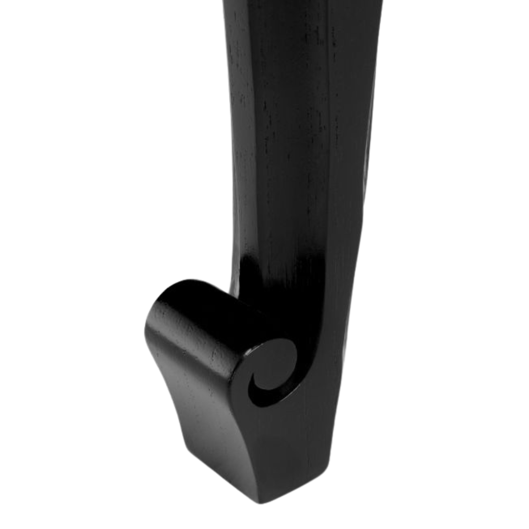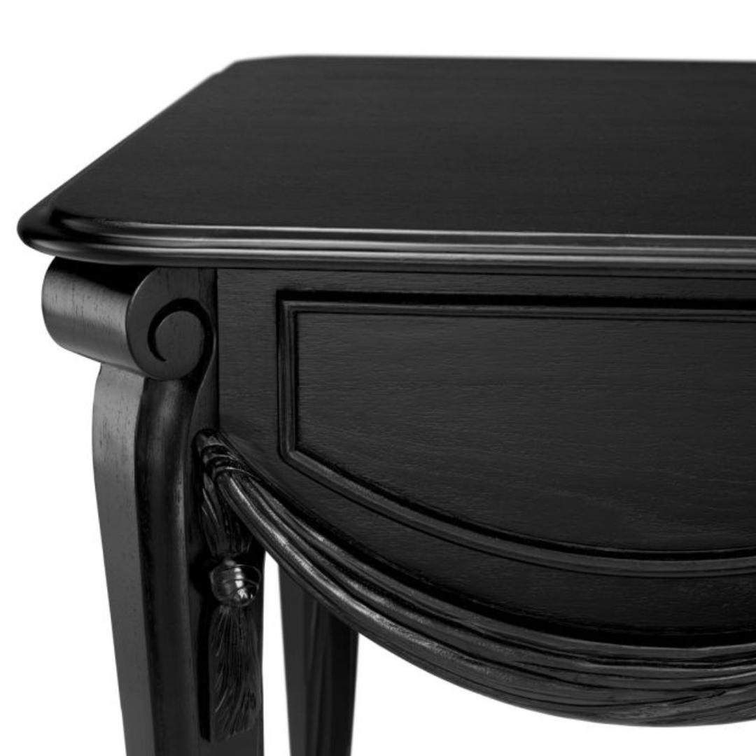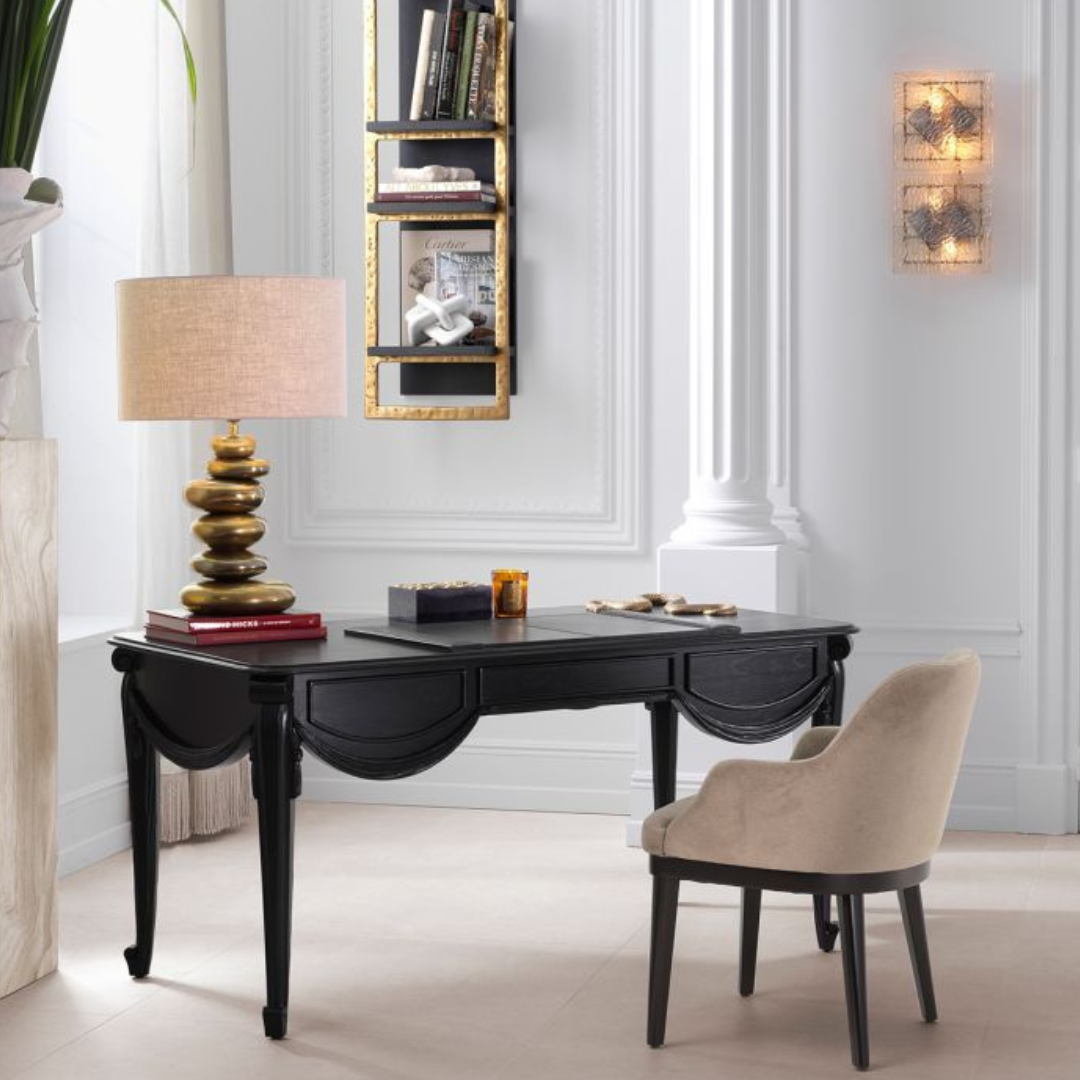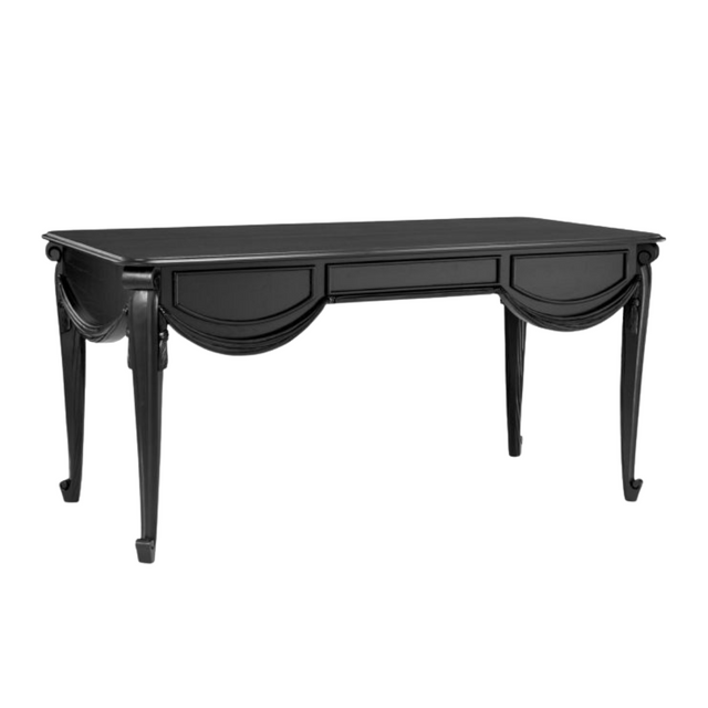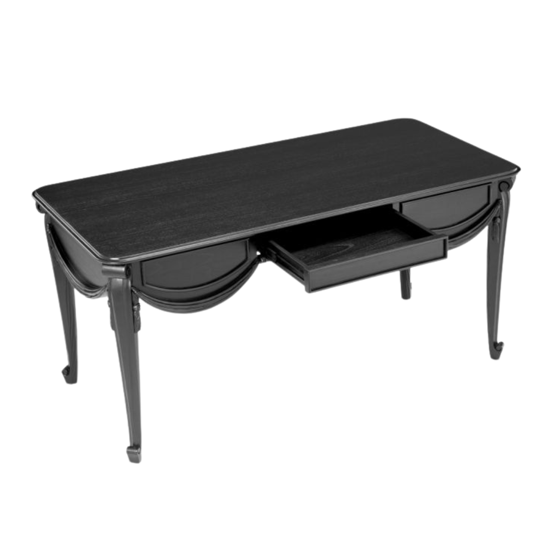 A Zafiro íróasztallal kifinomultságot vihetsz munkahelyedre. Klasszikus fekete színű, kifinomult mindifa íróasztal, amelynek egyedi, kézzel faragott drappírozott hatása a függöny puha redőire emlékeztet, és elegáns hangulatot kölcsönöz a letisztult sziluettnek. Modern és hagyományos belső terek kiegészítéseként is alkalmas, praktikus, Soft-Close rendszerrel záródó fiókjával pedig még funkcionálisabbá válik, így a stílus és a praktikum tökéletes ötvözete.