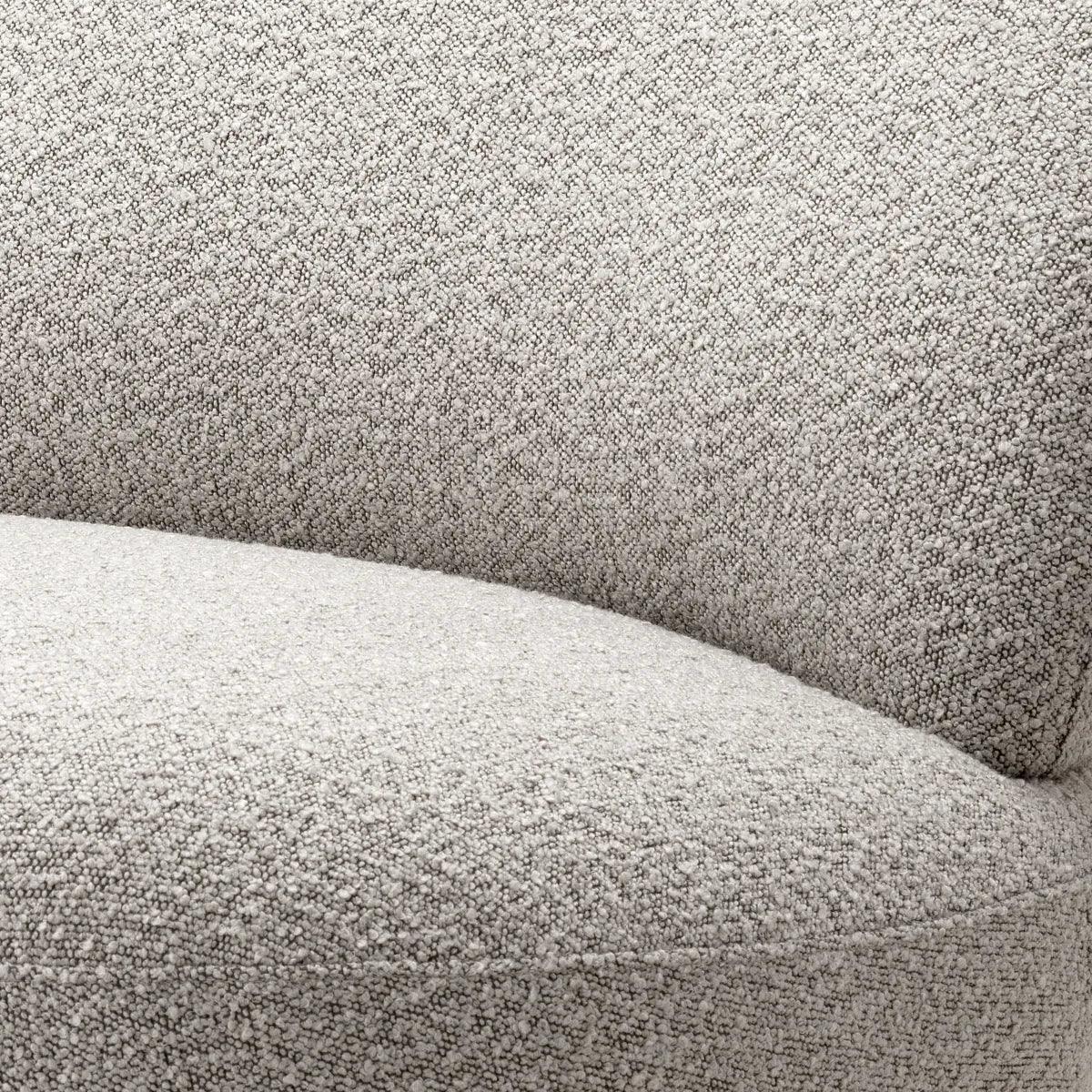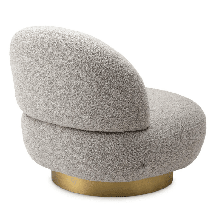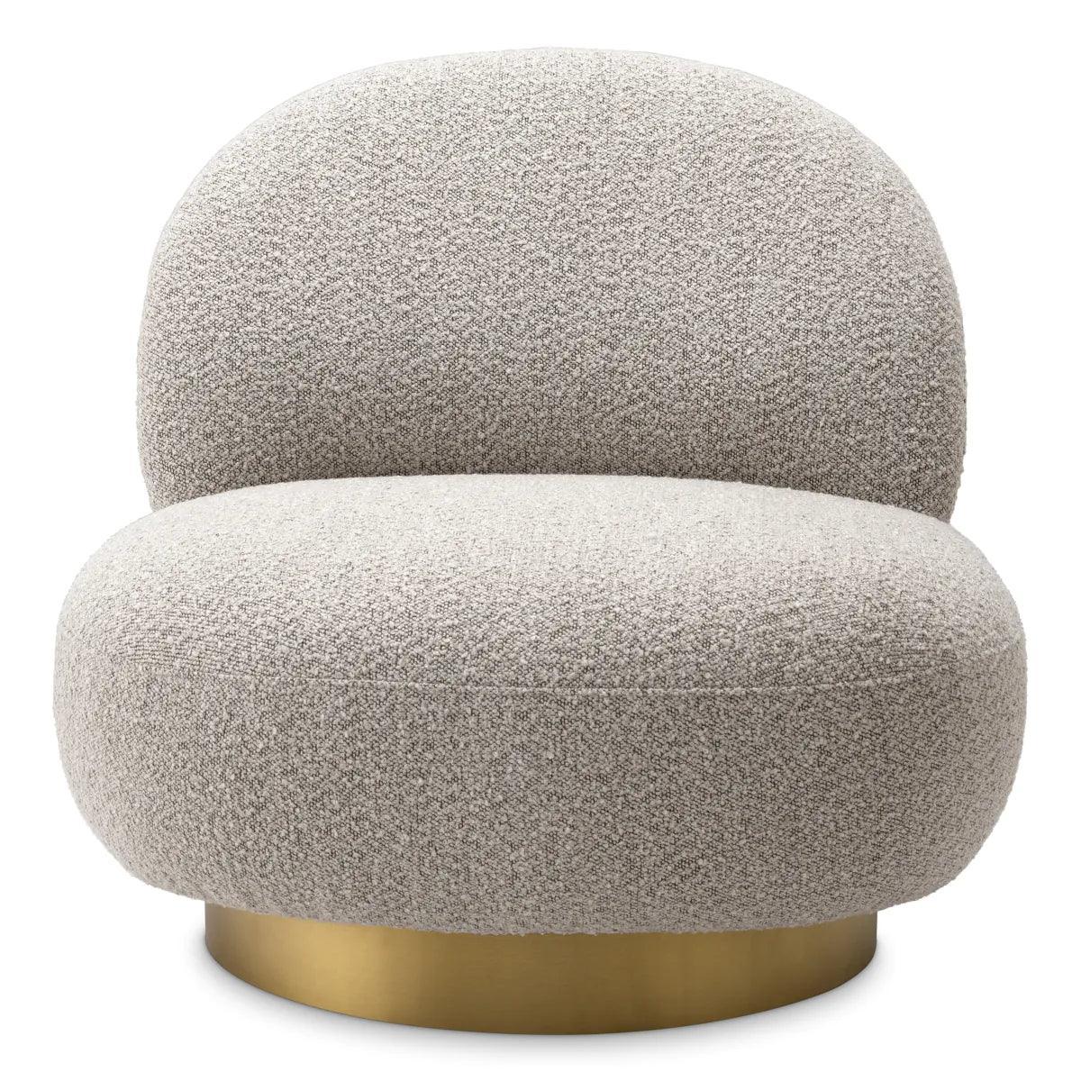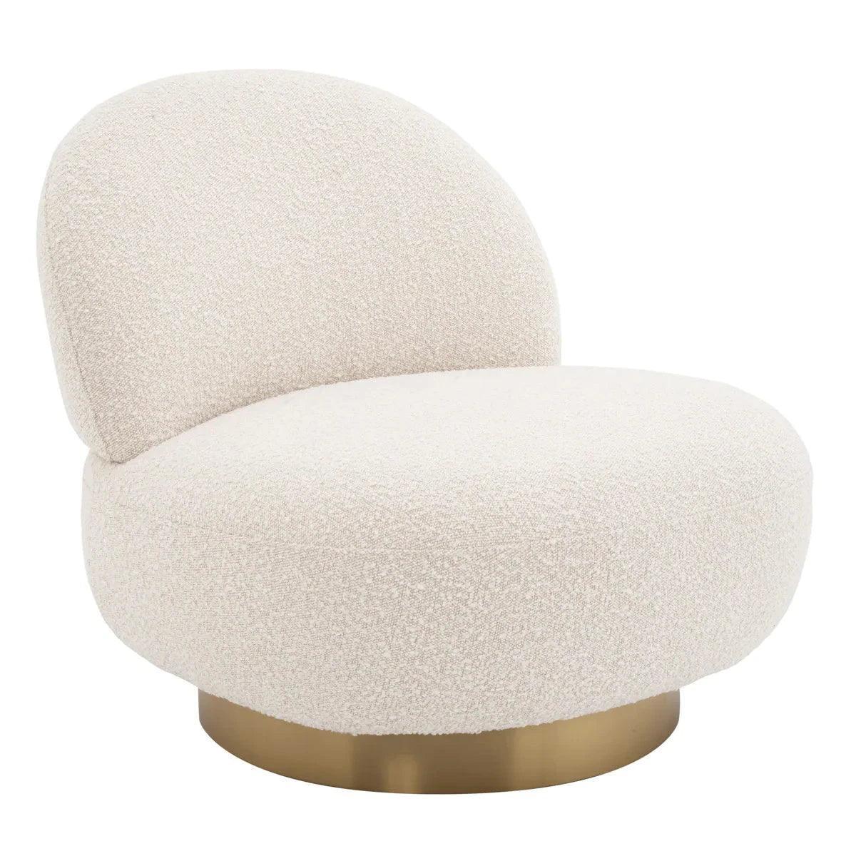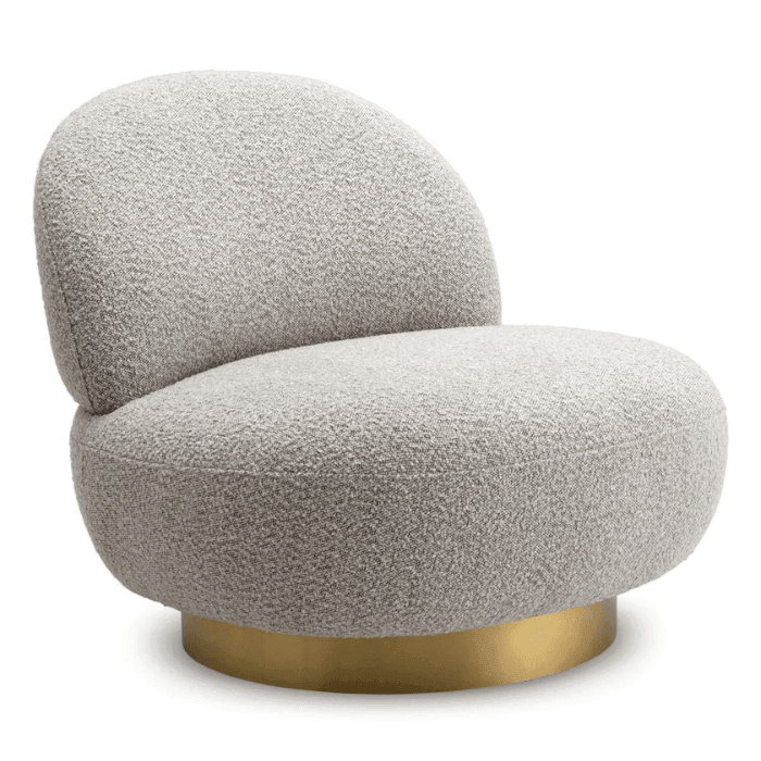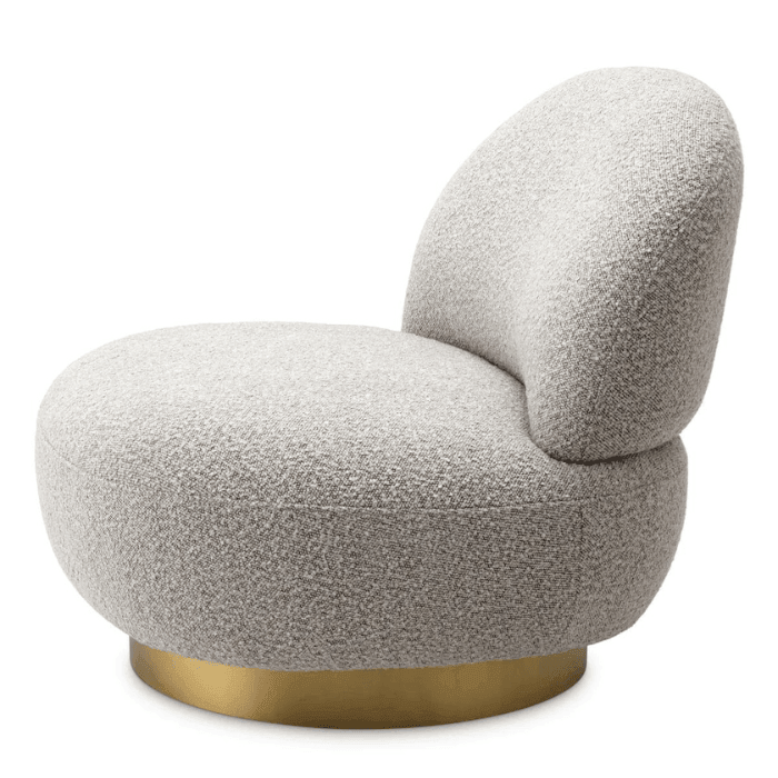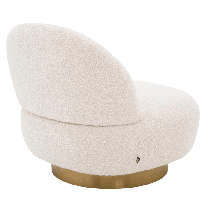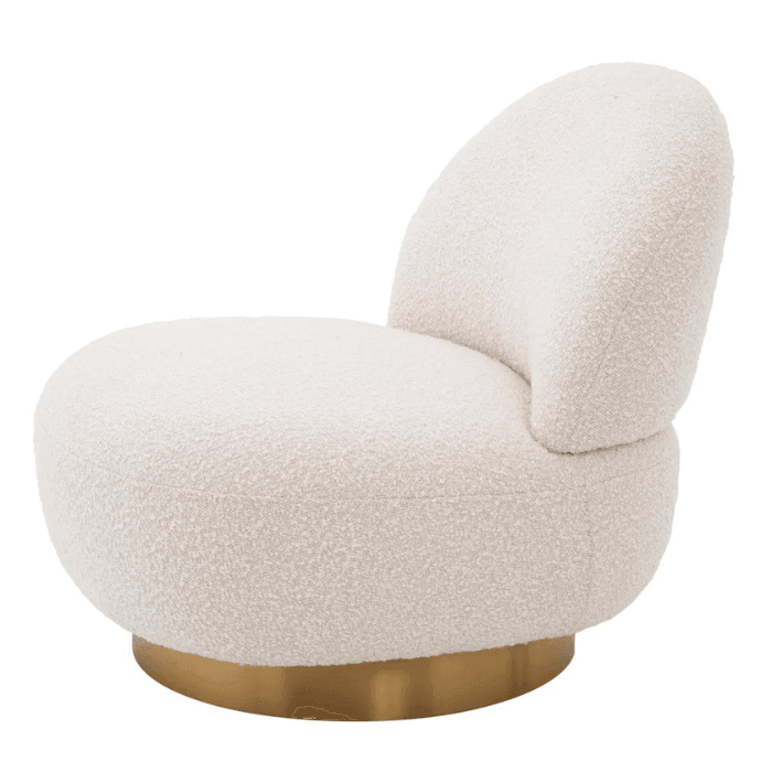 Élvezd a Clément forgó buklé fotel kényelmét és nagyszerű dizájnját. Lekerekített formájának köszönhetően könnyedén illeszkedik bármilyen berendezésű enteriőrbe. Organikus formáját puha tapintású, krémszínű buklé szövettel kárpitozták, amelyet egy szálcsiszolt sárgaréz talprész egészít ki.