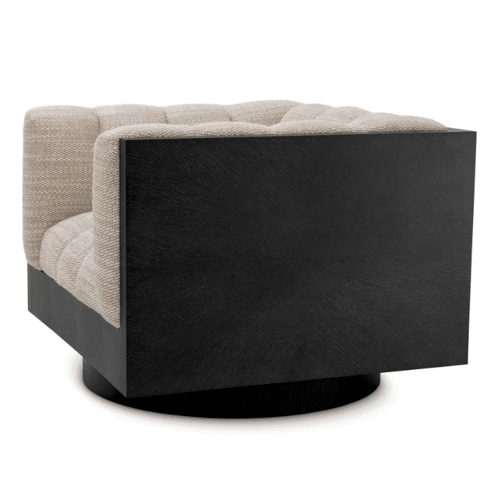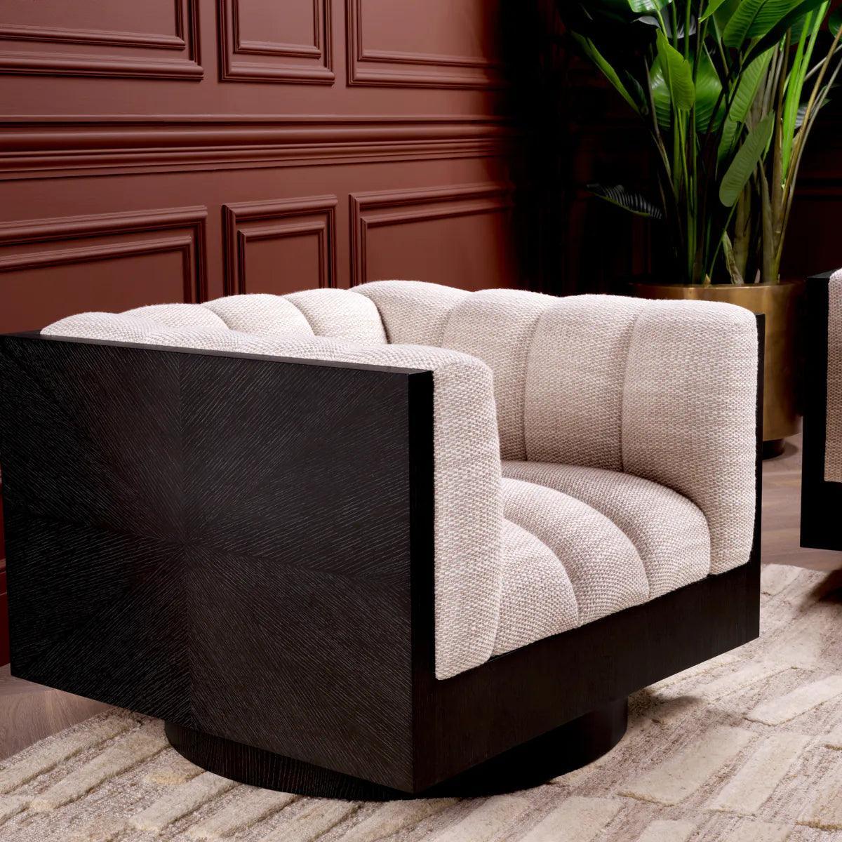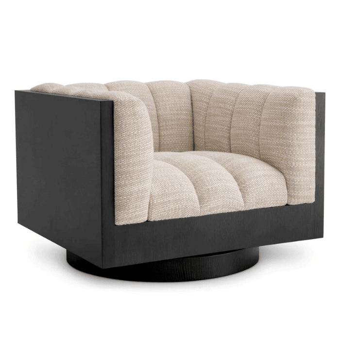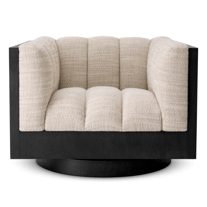 Merülj el az Eichholtz Davide forgó szövet fotel luxusában, amely tökéletesen ötvözi a kényelmet és az eleganciát. Ez az ikonikus darab nyugalmat sugároz. A kifinomult fekete forgó talp modernitást kölcsönöz neki, megteremtve az egyensúlyt a kortárs és az időtlen dizájn között. A kárpitozás vertikális vonalvezetésének köszönhetően vonzó, dimenzionális hatást kelt. Nem csupán egy bútordarab, hanem a kifinomult ízlés és elegancia kifejezése, amely egyedi varázsával gazdagítja otthonod.