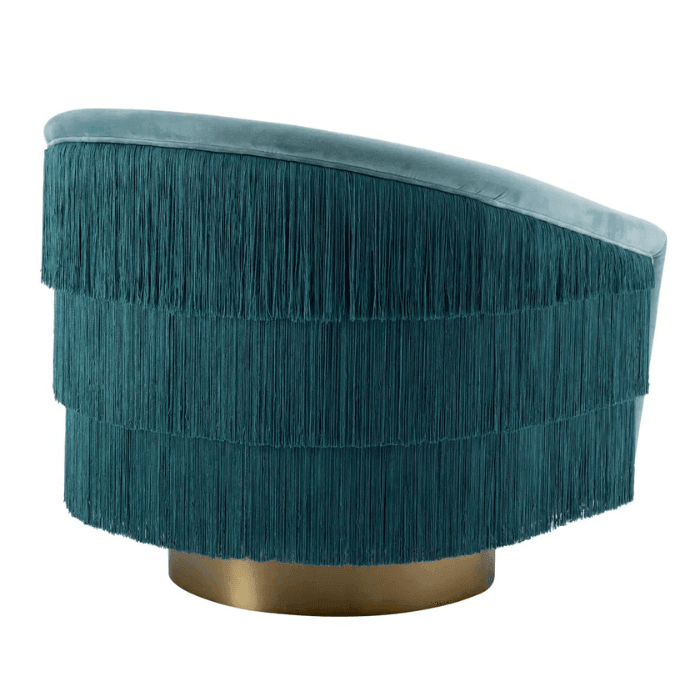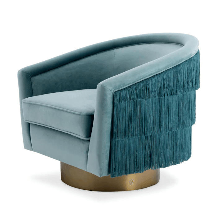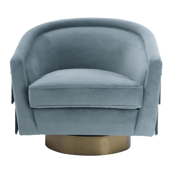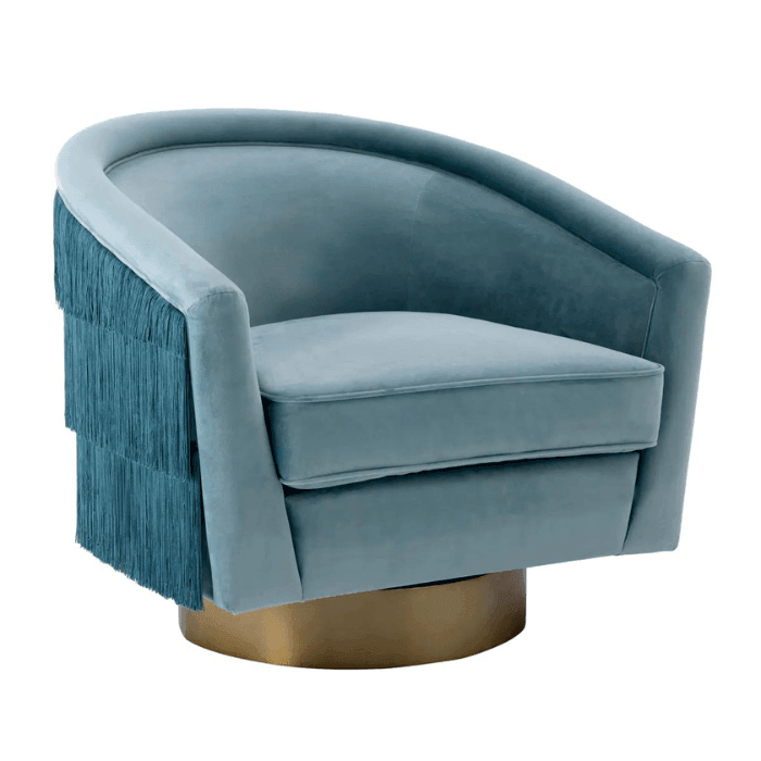 Az elegánsan ívelt Le Vante forgó bársony fotel a vintage stílus találkozása a modern kényelemmel. Világoskék bársony kárpitozás tökéletesen illik a rojtokkal díszített hátoldalhoz és a matt sárgaréz kör alakú forgó talphoz. Az ülés és a háttámla párnázottsága garantálja a kényelmes ülésélményt. Emellett ez a bájos díszfotel nagyszerű fókuszpontot alkot a nappalidban vagy a hálószobádban. Tökéletes választás, ha egyediséget és eleganciát keresel.