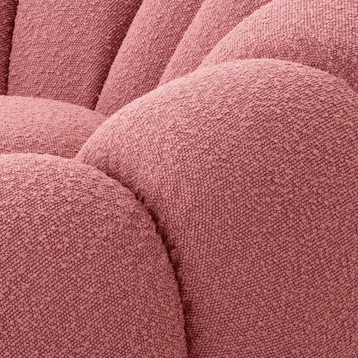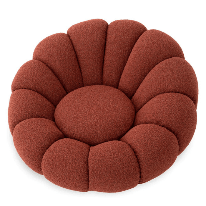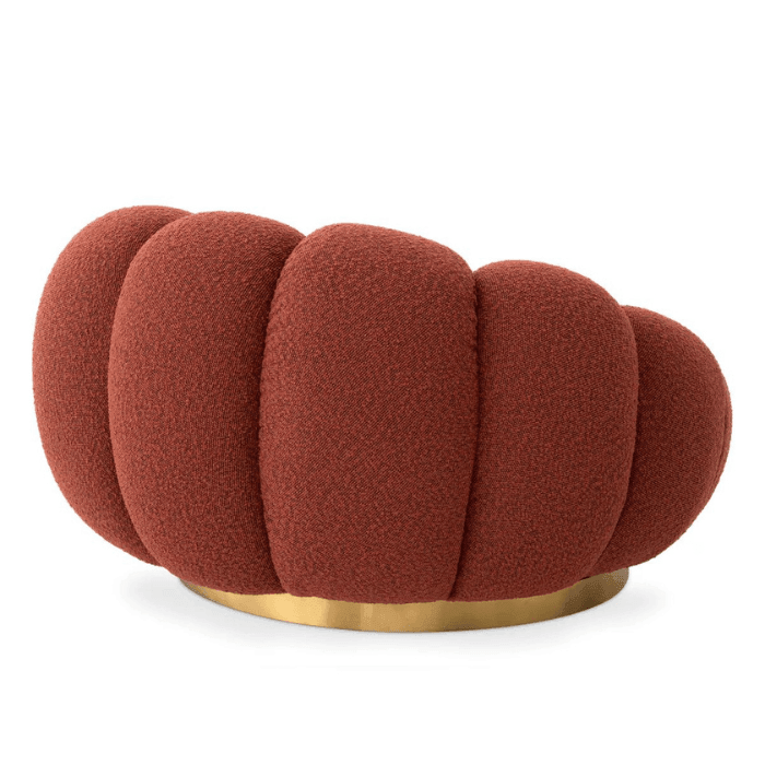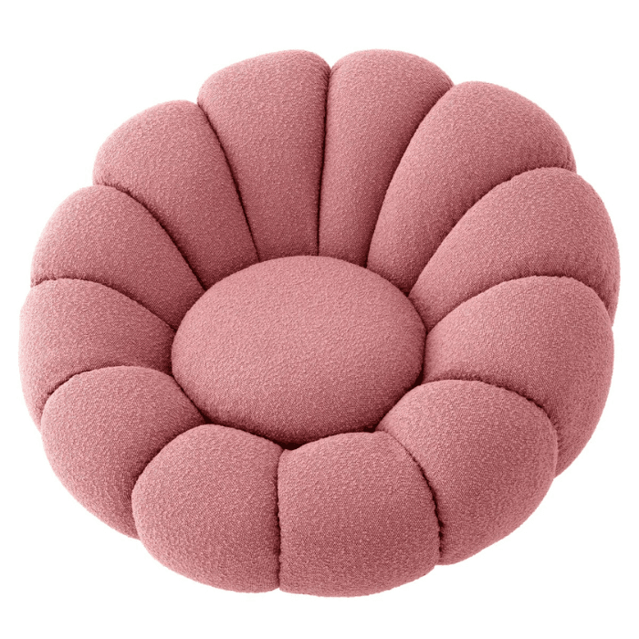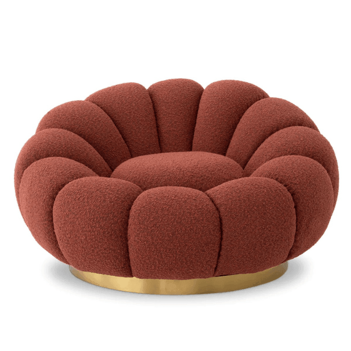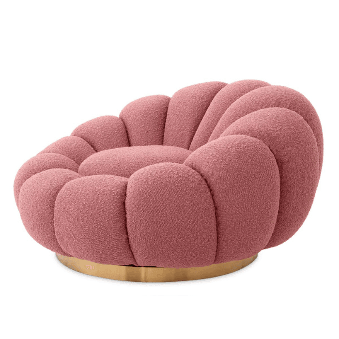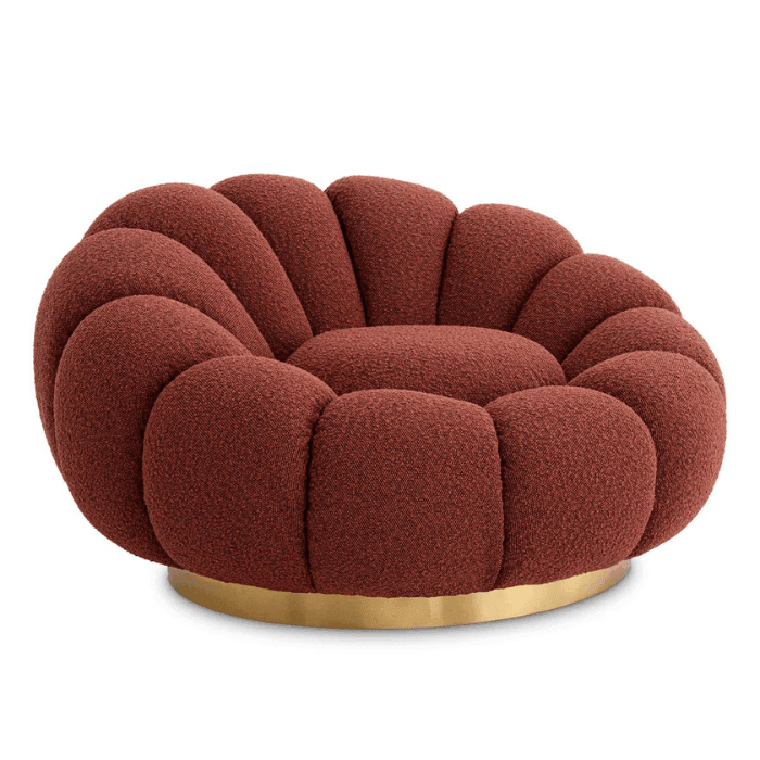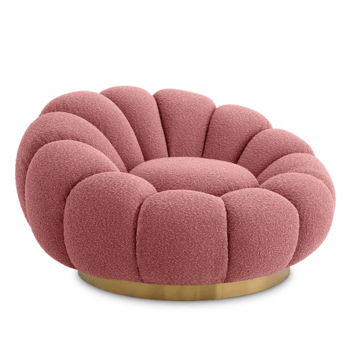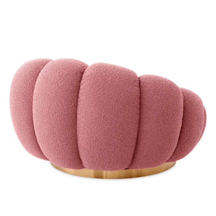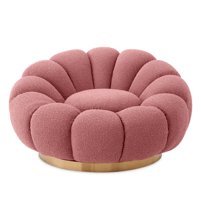Laza íveivel és puha tapintású kárpitozásával a Mello forgó buklé fotel elhozza a luxust otthonodba. Alakja egy nyitott virágra emlékeztet, ezért ez a bájos kárpitozású díszszék rendkívül dekoratív kiegészítője lesz a nappalidnak vagy hálószobádnak. A fotel matt sárgaréz forgó talpon nyugszik, ami a praktikusság garanciája. Tökéletes választás, ha egy egyedi és elegáns darabra vágysz. A prémium anyagok és a stílusos megjelenés révén ez a szék bármelyik helyiség központi eleme lesz.