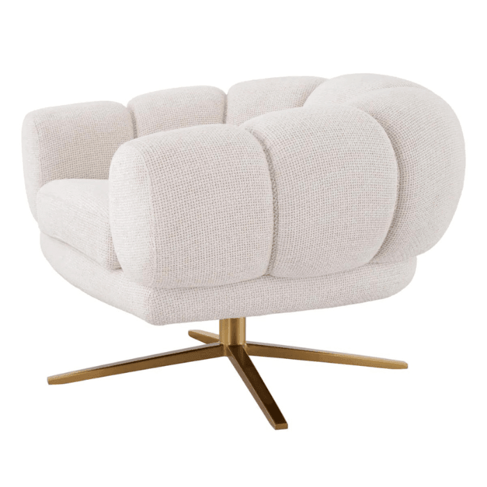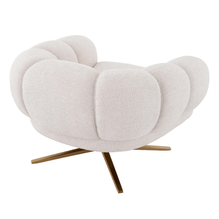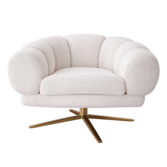 A Sunset forgó szövet fotel elegáns és kellemes kiegészítője otthonodnak. Egyedülálló dizájnjával és kifinomult részleteivel bármely helyiségben kiemelkedő darab lesz. Remekül illeszkedik kortárs és klasszikus enteriőrökbe. A törtfehér kárpittal borított fotel időtlen vonzerőt és kényelmet sugároz. A matt sárgaréz bevonatú forgó talp eleganciát kölcsönöz ennek a mesés darabnak, így tökéletes választás. Kiválóan alkalmas arra, hogy stílusos fókuszpontja legyen nappalidnak vagy dolgozószobádnak.