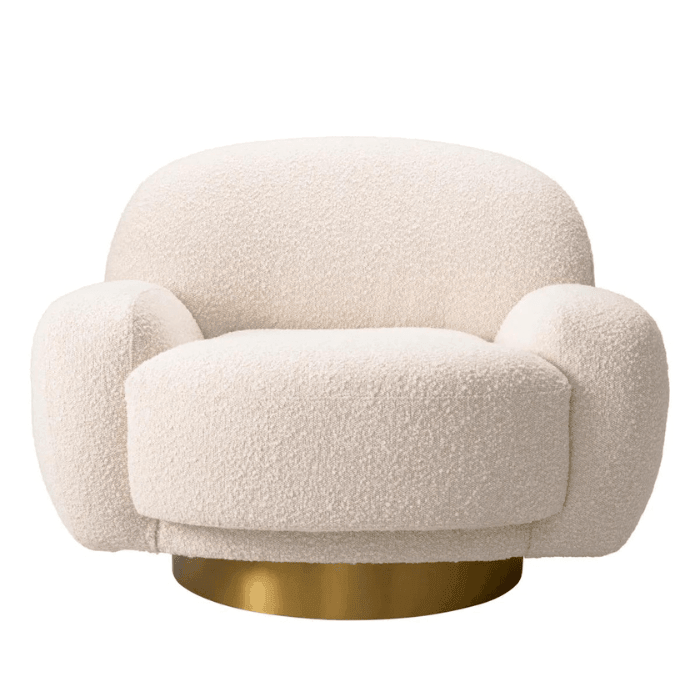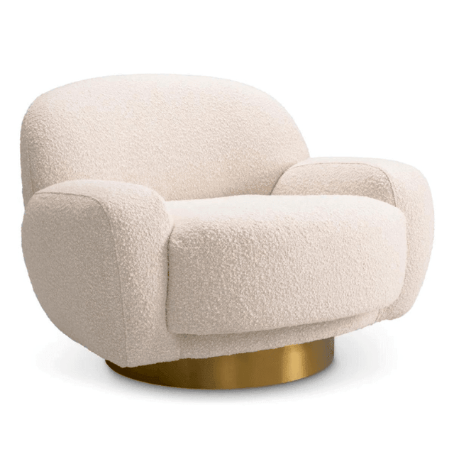 Az Udine forgó buklé fotel lágy organikus formái és ívelt vonalai lendületet és mozgást kölcsönöznek bármely lakótérnek. Minőségi buklé kárpitozásával és matt sárgaréz forgó talpával nemcsak esztétikailag vonzó, hanem tökéletes a pihenéshez is. Ideális választás, ha szeretnél egy elegáns és kényelmes darabot otthonodba. A modern dizájn és a prémium anyagok kombinációja biztosítja, hogy hosszú távon is élvezhesd. Kiemelkedik stílusával és kényelmével, így tökéletes kiegészítője nappalidnak vagy hálószobádnak,