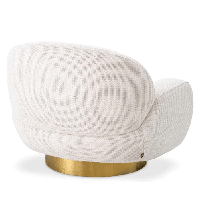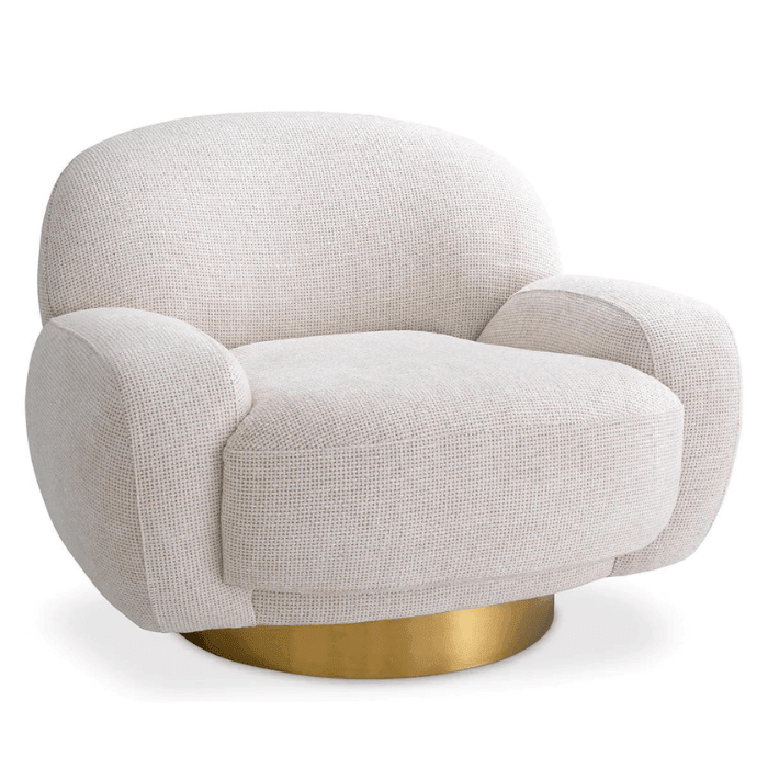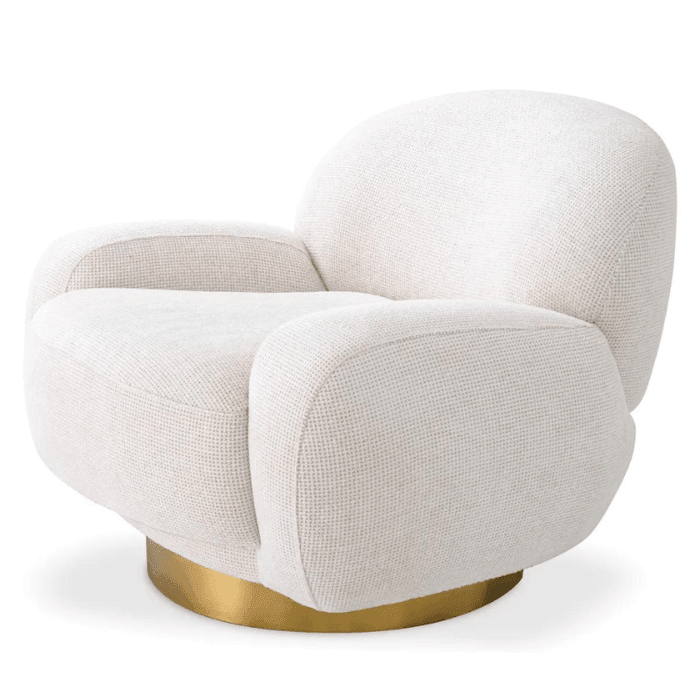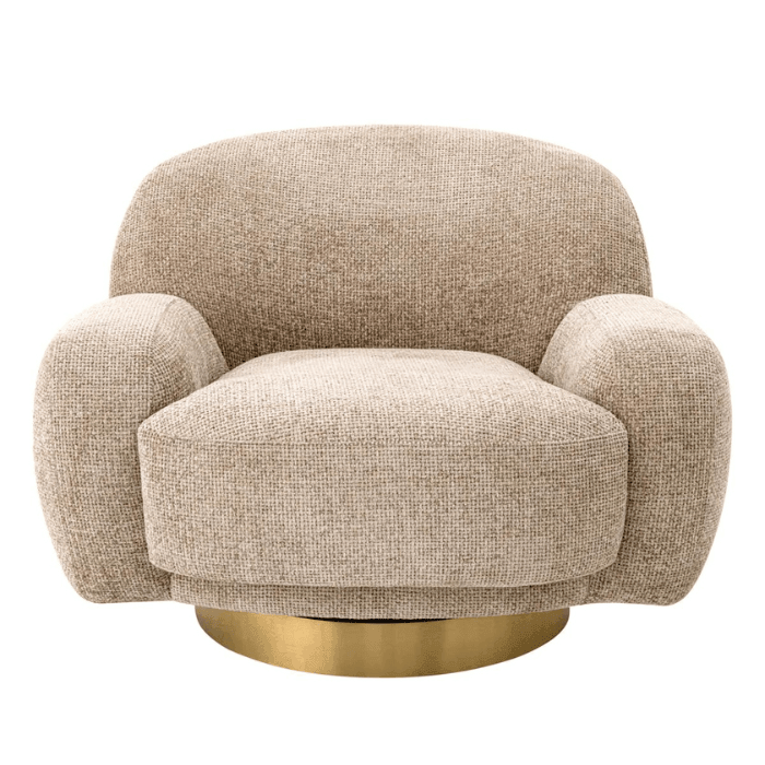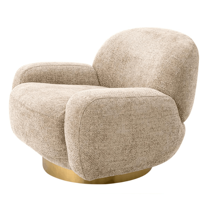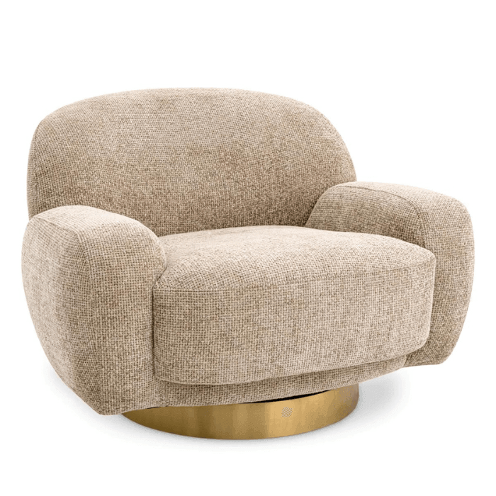 Az Udine forgó szövet fotel lágy organikus formái és ívelt vonalai lendületet és mozgást kölcsönöznek bármely lakótérnek. Minőségi kárpitozásával és matt sárgaréz forgó talpával nemcsak esztétikailag vonzó, hanem tökéletes a pihenéshez is. Ideális választás, ha szeretnél egy elegáns és kényelmes darabot otthonodba. A modern dizájn és a prémium anyagok kombinációja biztosítja, hogy hosszú távon is élvezhesd. Kiemelkedik stílusával és kényelmével, így tökéletes kiegészítője nappalidnak vagy hálószobádnak,