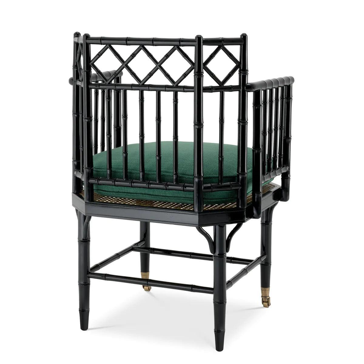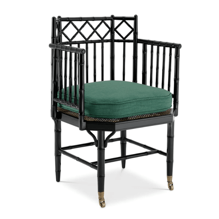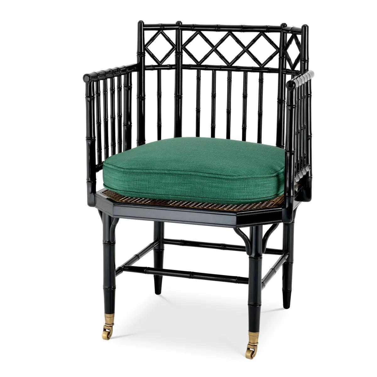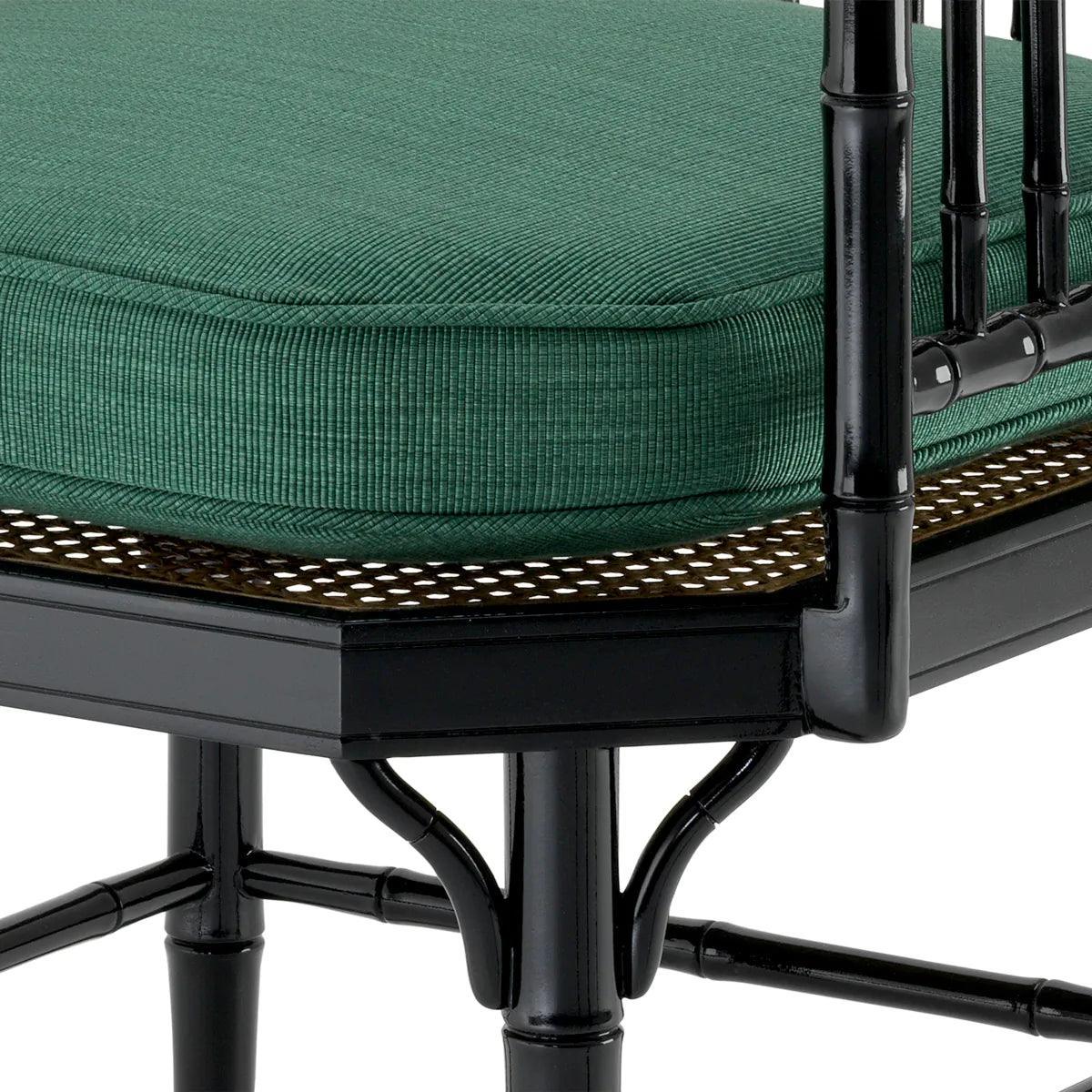 Varázsold otthonodba az Art Deco gazdag stílusát a Xavier szövet fotel segítségével. Fekete bevonatú, bambusz hatású vázával és természetes nádszálas ülésével ez a csábító ülőalkalmatosság keleties hangulatot kölcsönöz otthonodnak. Az első lábakon antik sárgaréz görgők kerültek elhelyezésre. Továbbá a fotel tartozéka egy zöld ülőpárna a fokozott kényelem érdekében.