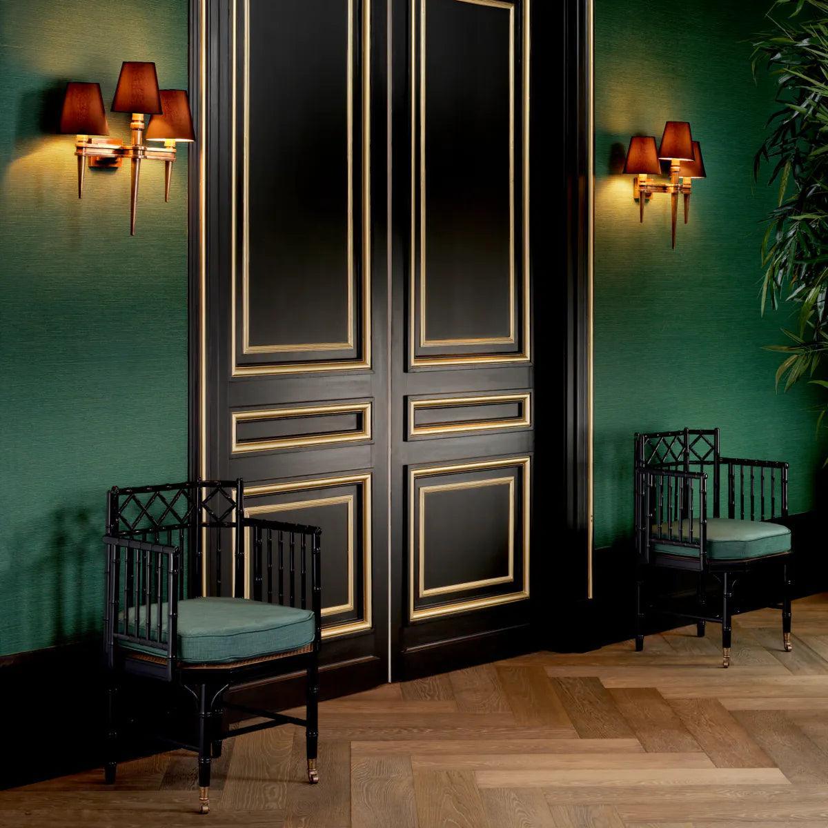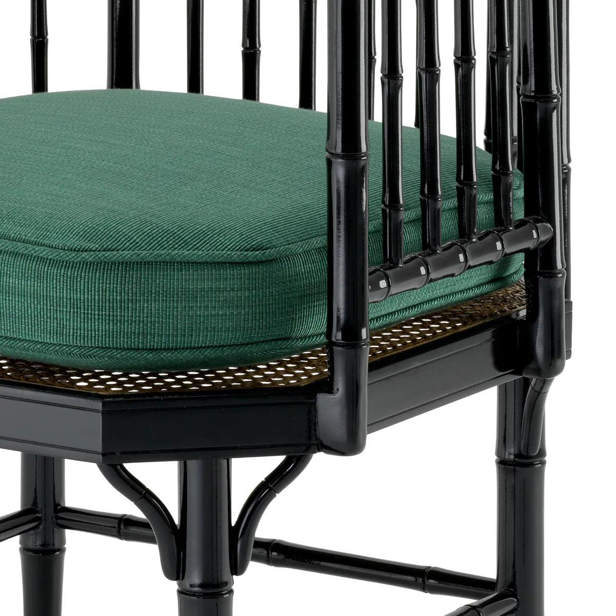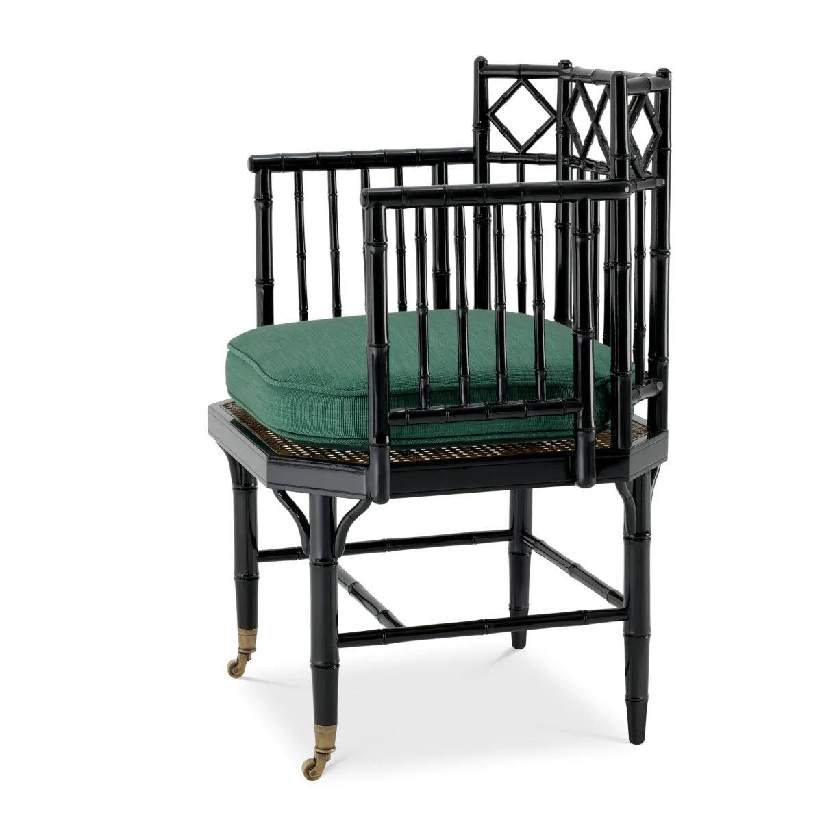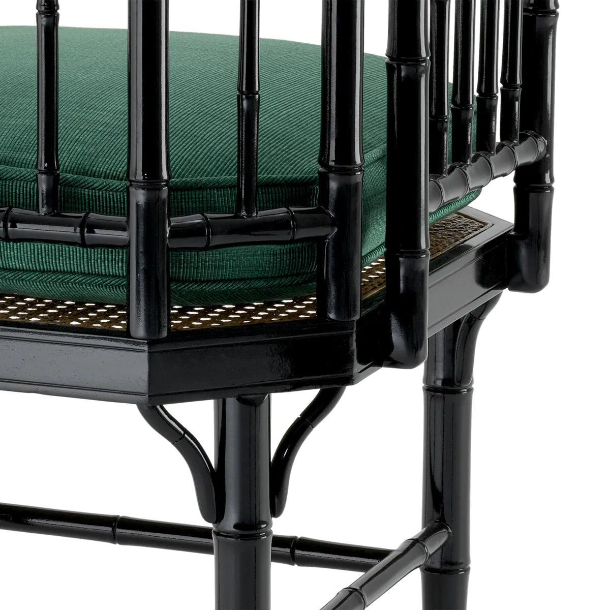 Varázsold otthonodba az Art Deco gazdag stílusát a Xavier szövet fotel segítségével. Fekete bevonatú, bambusz hatású vázával és természetes nádszálas ülésével ez a csábító ülőalkalmatosság keleties hangulatot kölcsönöz otthonodnak. Az első lábakon antik sárgaréz görgők kerültek elhelyezésre. Továbbá a fotel tartozéka egy zöld ülőpárna a fokozott kényelem érdekében.
