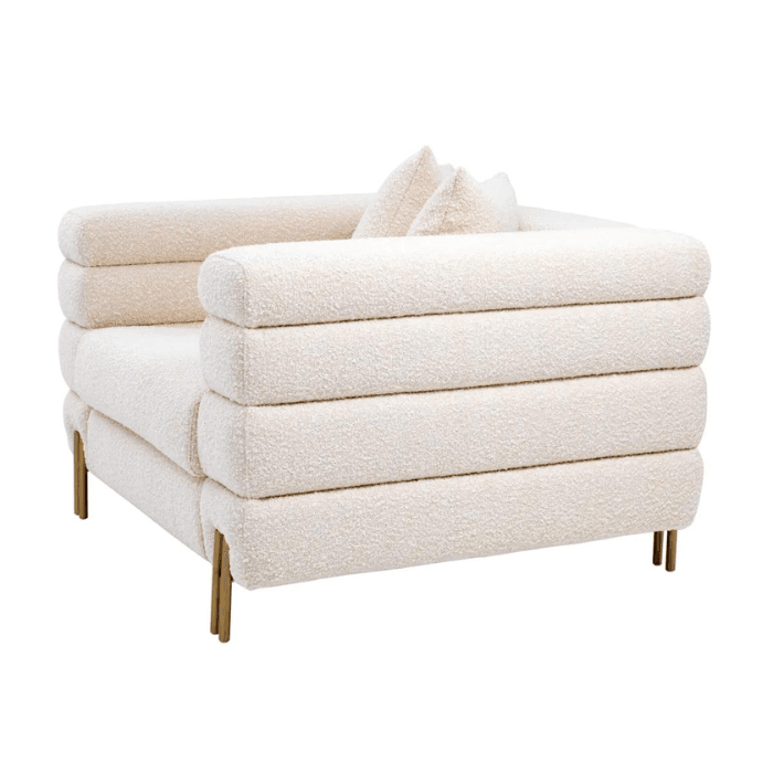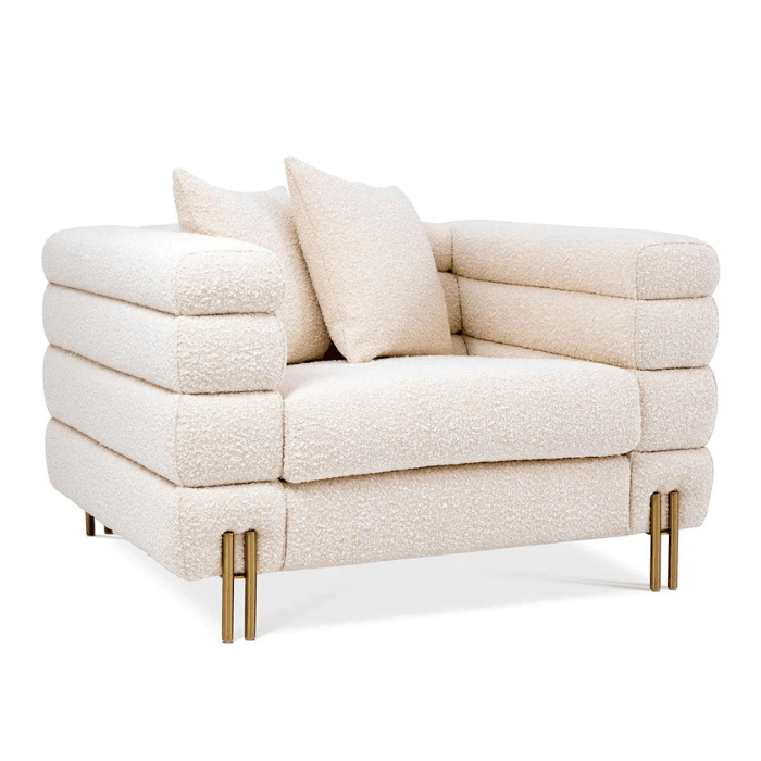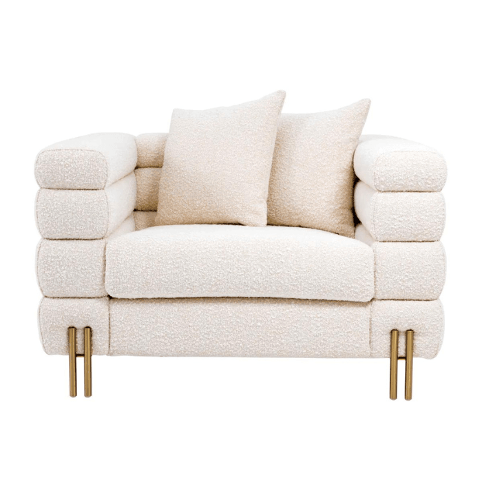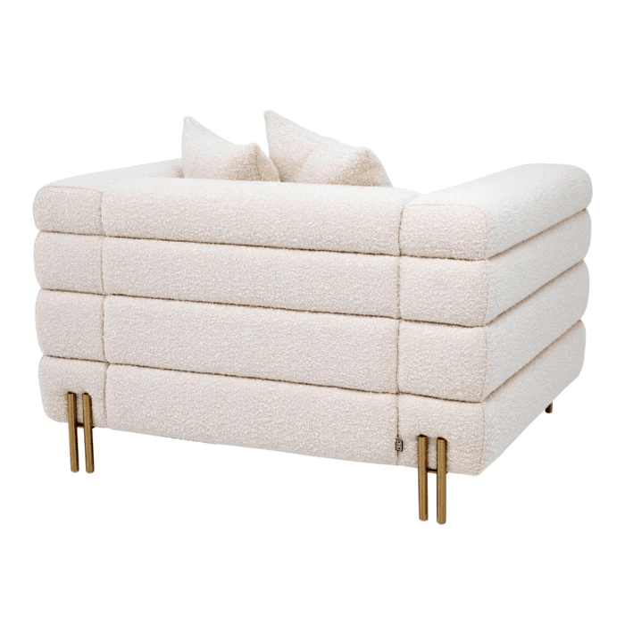 A csodálatos York buklé fotel matt sárgaréz lábakkal a dekadencia jegyeit hordozza magán. Jellegzetes formáját a Streamline Moderne inspirálta, egy nemzetközi Art Deco dizájnstílus az 1930-as évekből, amelyet lágy ívelt formák és hosszú vízszintes vonalak jellemeznek. A két négyzet alakú díszpárnával a fotel tartozéka. Tökéletes választás azok számára, akik szeretik a letisztult eleganciát. A kiváló minőségű anyagoknak köszönhetően hosszú éveken át megőrzi szépségét és tartósságát.