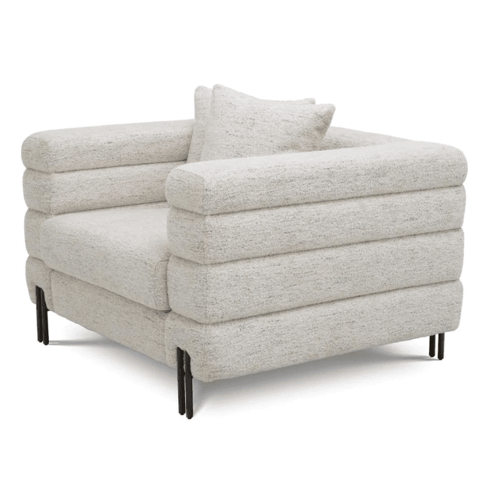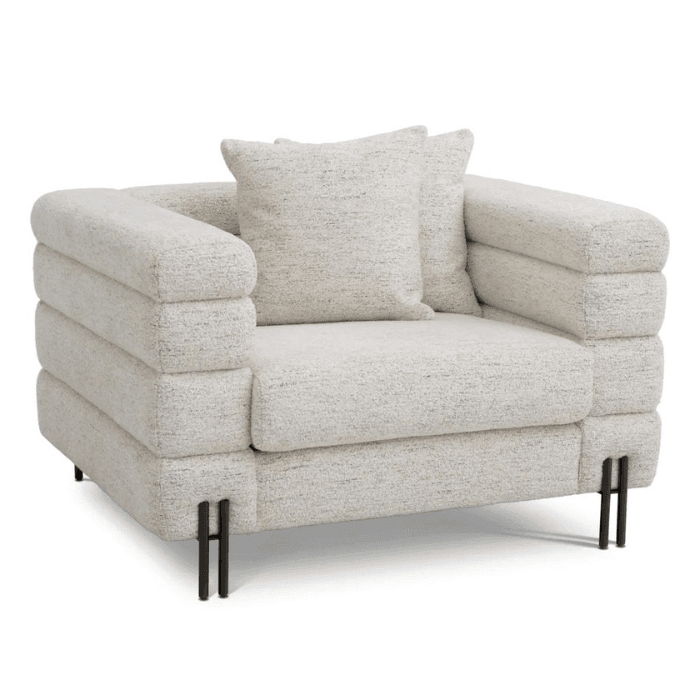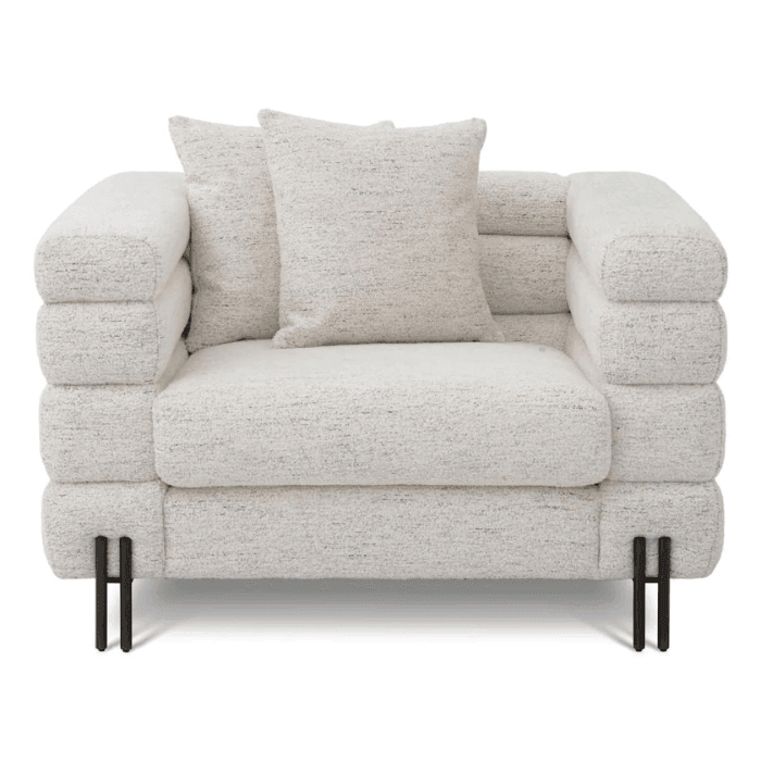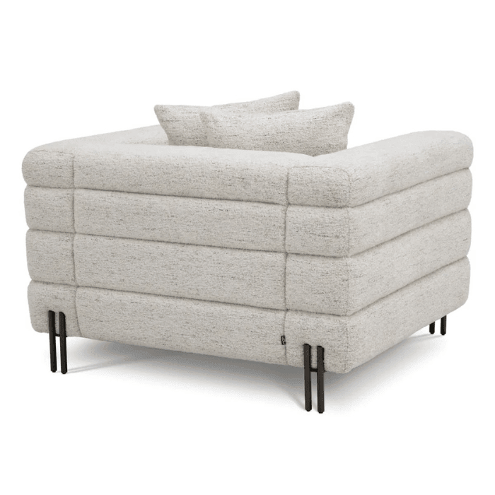 A csodálatos York szövet fotel világos kárpitozásával és fekete lábaival a dekadencia jegyeit hordozza magán. Jellegzetes formáját a Streamline Moderne inspirálta, egy nemzetközi Art Deco dizájnstílus az 1930-as évekből, amelyet lágy ívelt formák és hosszú vízszintes vonalak jellemeznek. A két négyzet alakú díszpárnával a fotel tartozéka. Tökéletes választás azok számára, akik szeretik a letisztult eleganciát. A kiváló minőségű anyagoknak köszönhetően hosszú éveken át megőrzi szépségét és tartósságát.