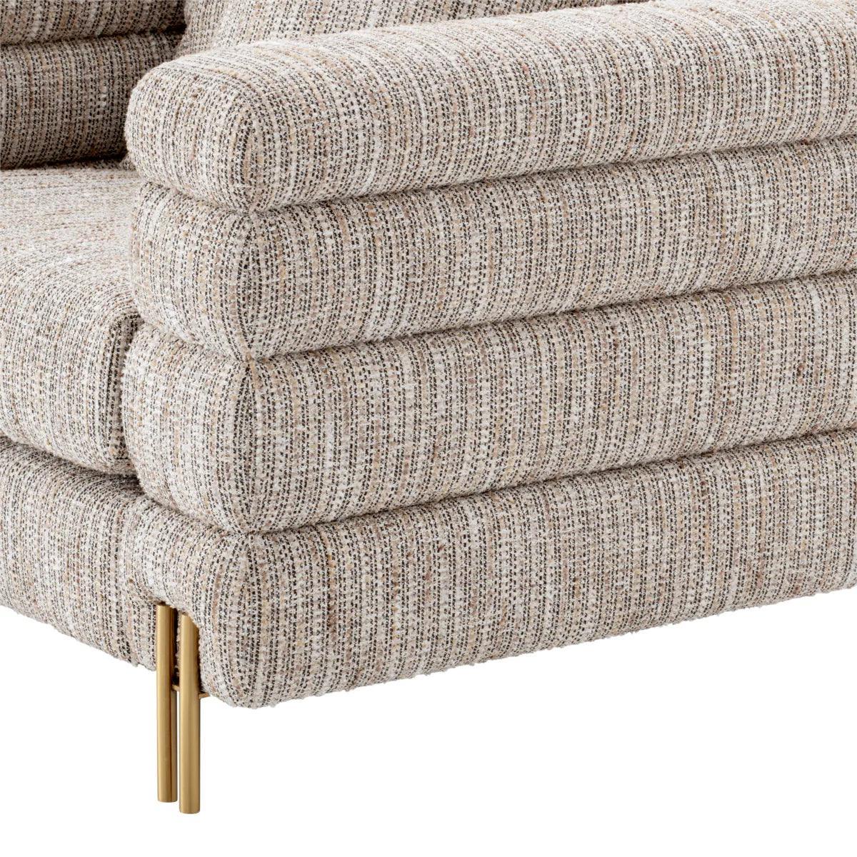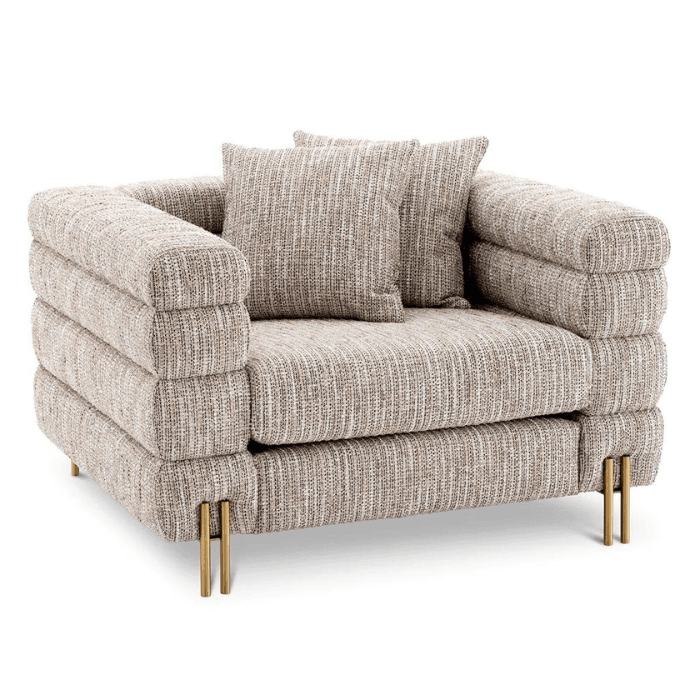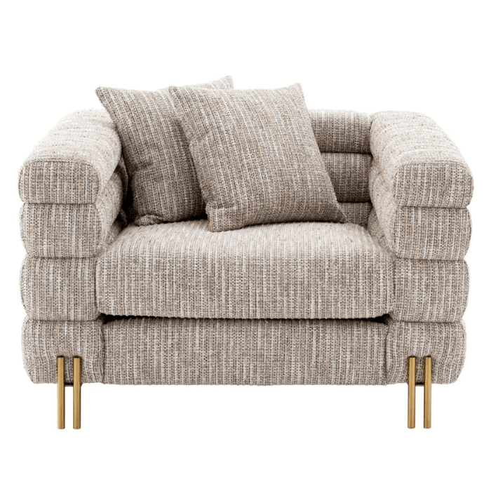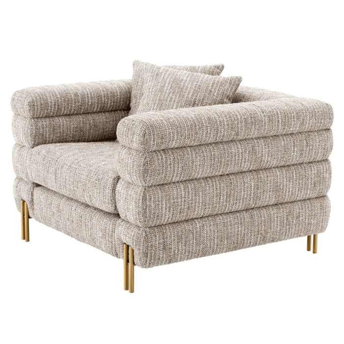 A csodálatos York szövet fotel sárgaréz lábakkal a dekadencia jegyeit hordozza magán. Jellegzetes formáját a Streamline Moderne inspirálta, egy nemzetközi Art Deco dizájnstílus az 1930-as évekből, amelyet lágy ívelt formák és hosszú vízszintes vonalak jellemeznek. A két négyzet alakú díszpárnával a fotel tartozéka. Tökéletes választás azok számára, akik szeretik a letisztult eleganciát. A kiváló minőségű anyagoknak köszönhetően hosszú éveken át megőrzi szépségét és tartósságát.