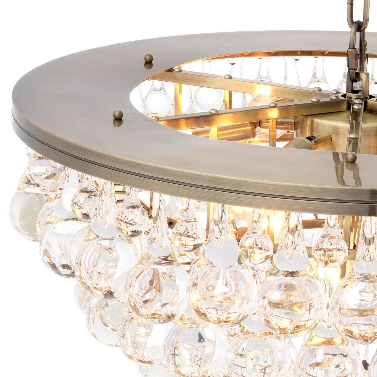 Csempéssz eleganciát és luxust belső teredbe a Bolzano csillár segítségével. Ez a pompás lámpatest tökéletes olyan alacsonyabb belmagasságú helyiségekbe, ahol nem lehetséges hagyományos függőcsillár. Könnyű, szálcsiszolt sárgaréz bevonattal és átlátszó üvegcseppekkel gazdagon díszítve ez a pazar függőlámpa lenyűgöző fényjátékot hoz létre. Belsejében 9 db izzónak megfelelő hely található.