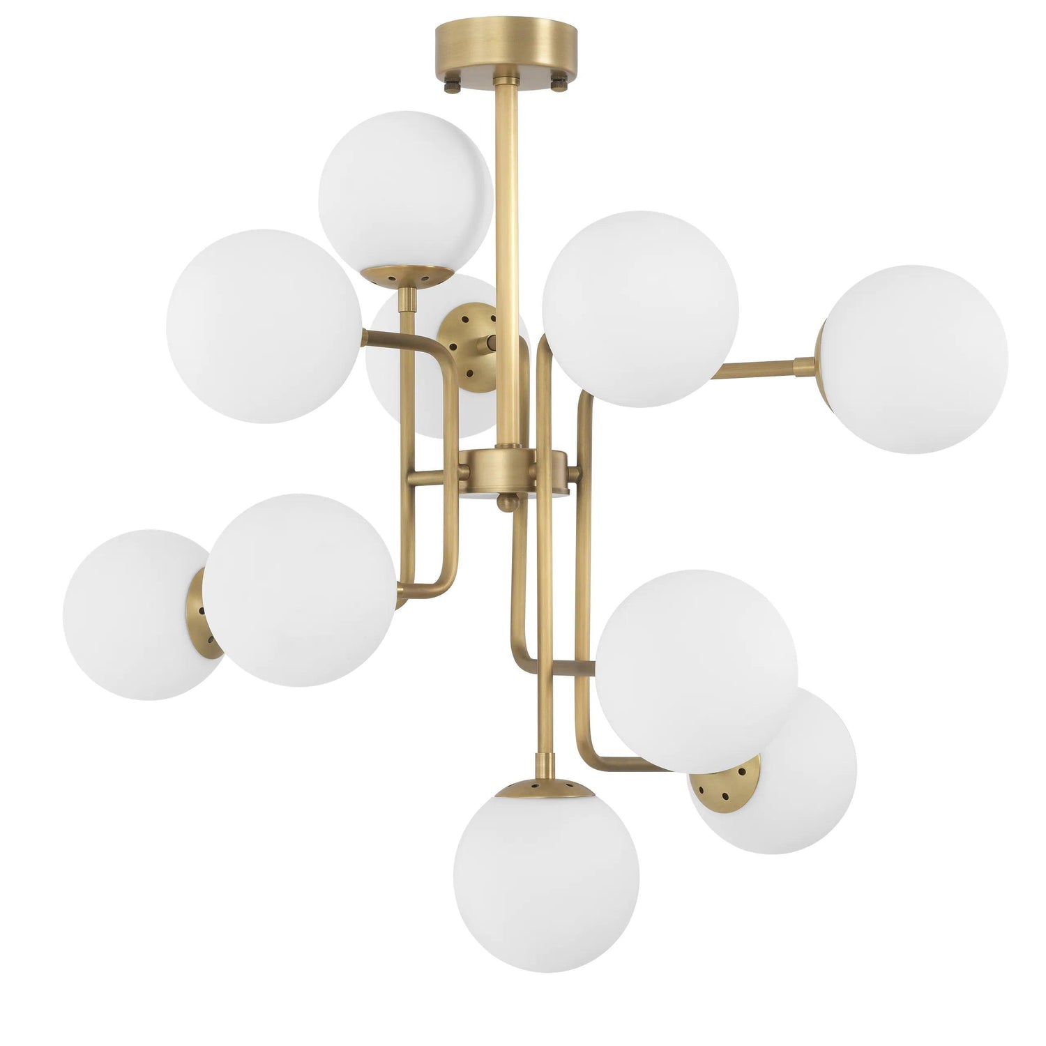 Hozz létre előkelő és meghitt hangulatot nappalidban vagy étkeződben az antik sárgaréz kivitelű Chase csillárral. A stratégiailag elhelyezett rudak megtámasztják a tíz darab fehér üveggömböt, hogy feltűnő fényforrást hozzanak létre, amely egy csipetnyi retro stílust visz a modern otthonokba.