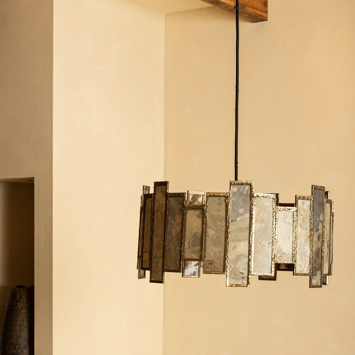 A Levan függőlámpa egy különleges dekoráció, amelynek búrája vékony, kő lapokból áll, melyeket arany színű fém váz keretez. A rusztikus megjelenéssel rendelkező modell stílust és hangulatos fényt varázsolhat bármely helyiségbe. A termék az izzót nem tartalmazza.