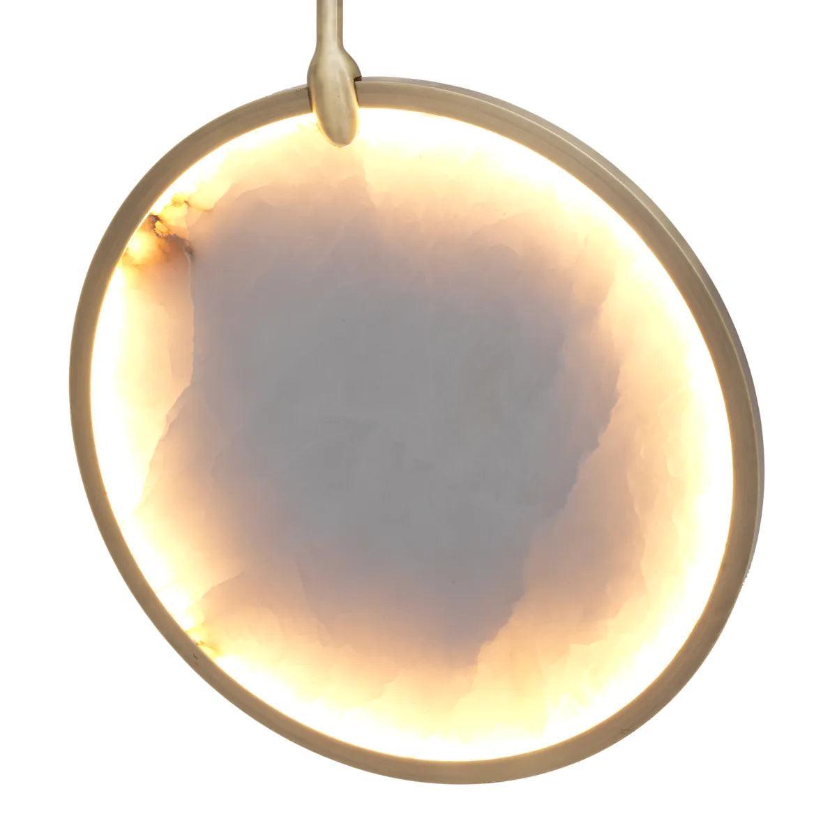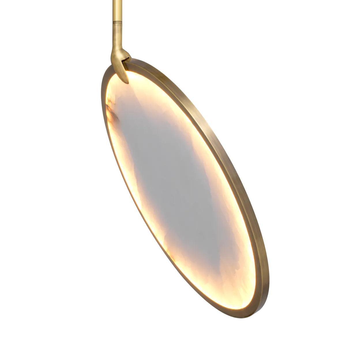 A különleges megjelenésű, és egyedi formájú Ocala csillár elegáns, és modern sziluettel rendelkezik. A körkörös lapos alabástrom gipsz búrával és beépített LED-lámpával ez az egyetlen, világos szálcsiszolt sárgaréz bevonatú függő éppoly funkcionális, mint stílusos. a lámpabúra átmérője 54.5cm.
