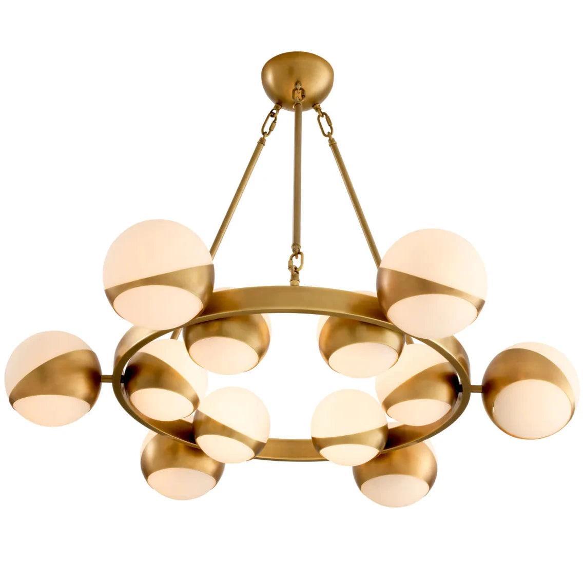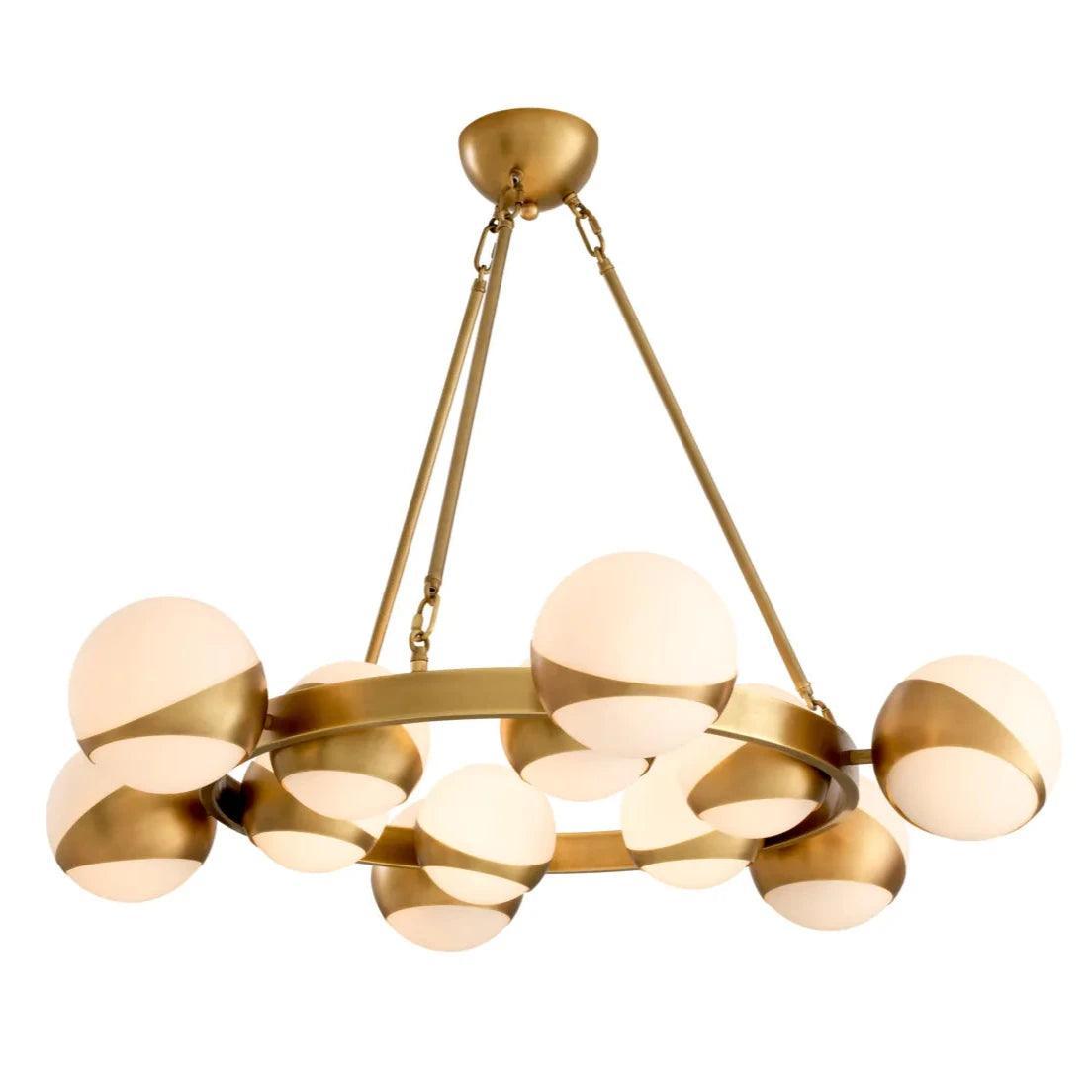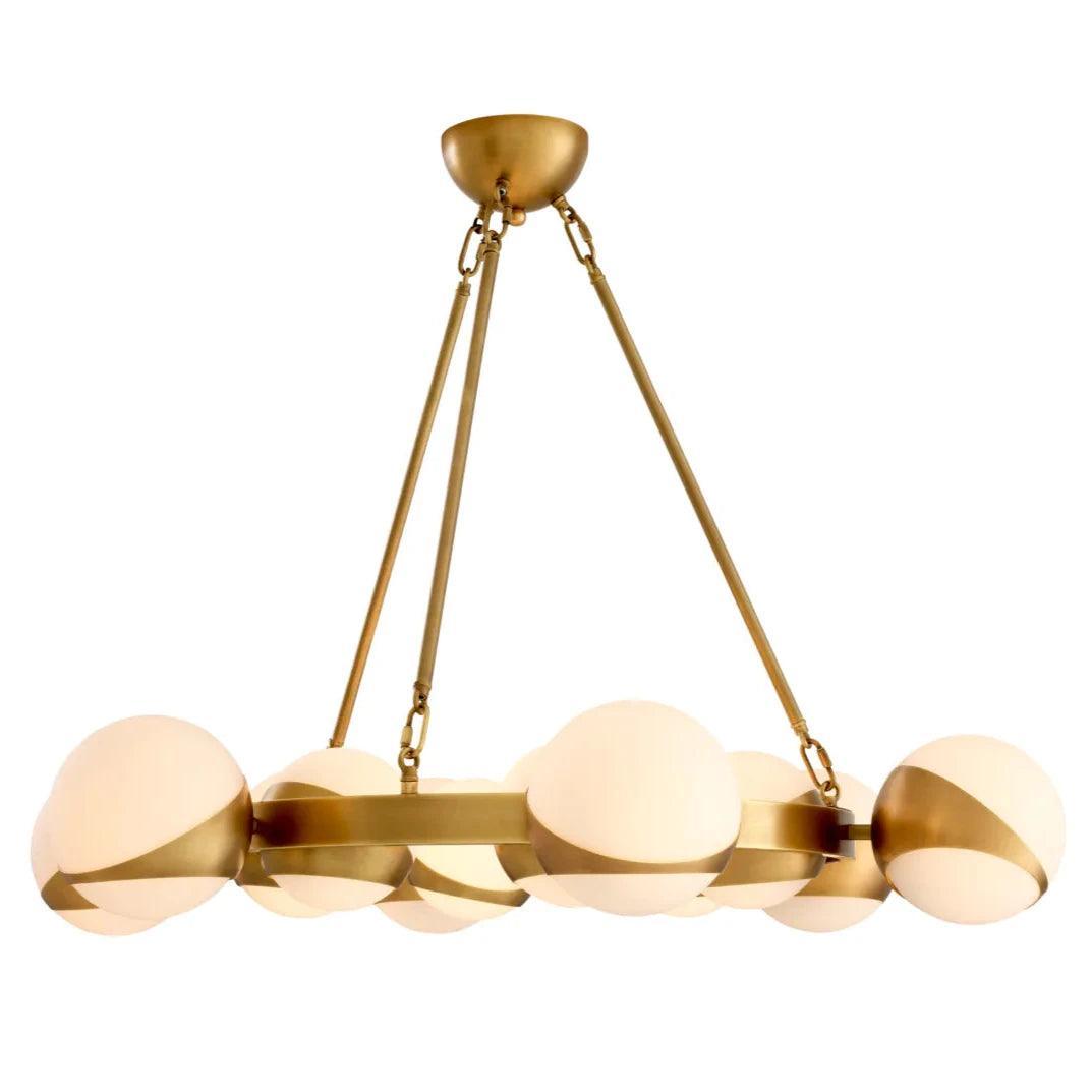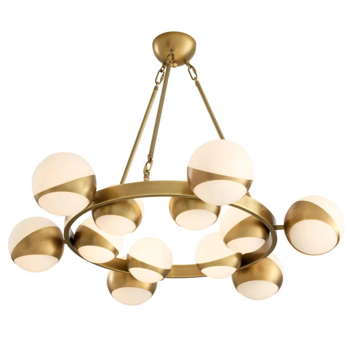 Az elegáns, stílusos és szoborszerű Piazetta csillár kellemes hangulatot kölcsönöz a századközepi modern stílusú térnek. A tizenkét darab gömb alakú, fehér üvegbúrák lágy és meleg fényt árasztanak a helyiségben, míg az antik sárgaréz felület éles kontraszttal teszi teljessé a megjelenést. A lámpatest közvetlenül a mennyezetre szerelhető, vagy lánccal is felfüggeszthető.
