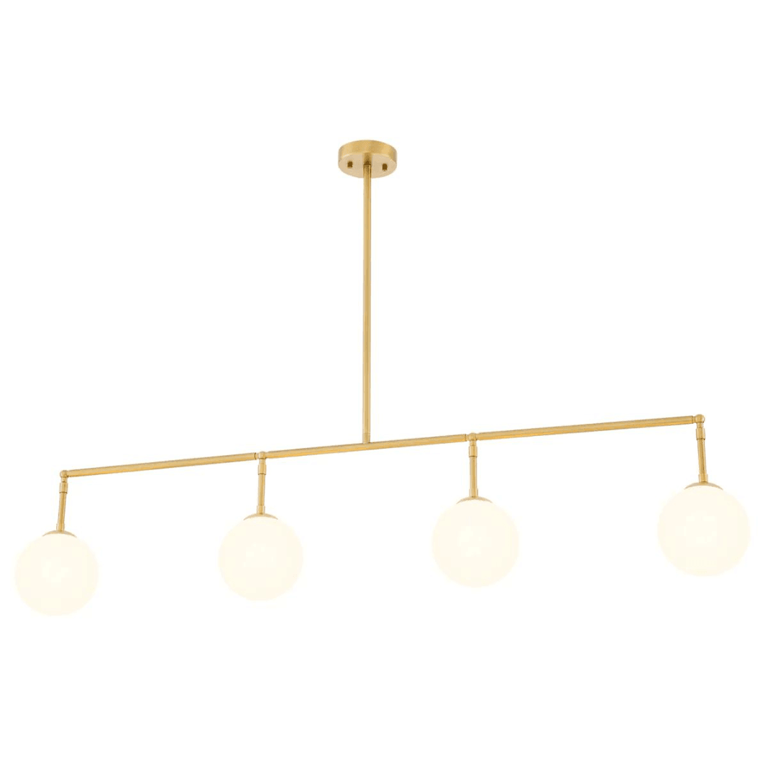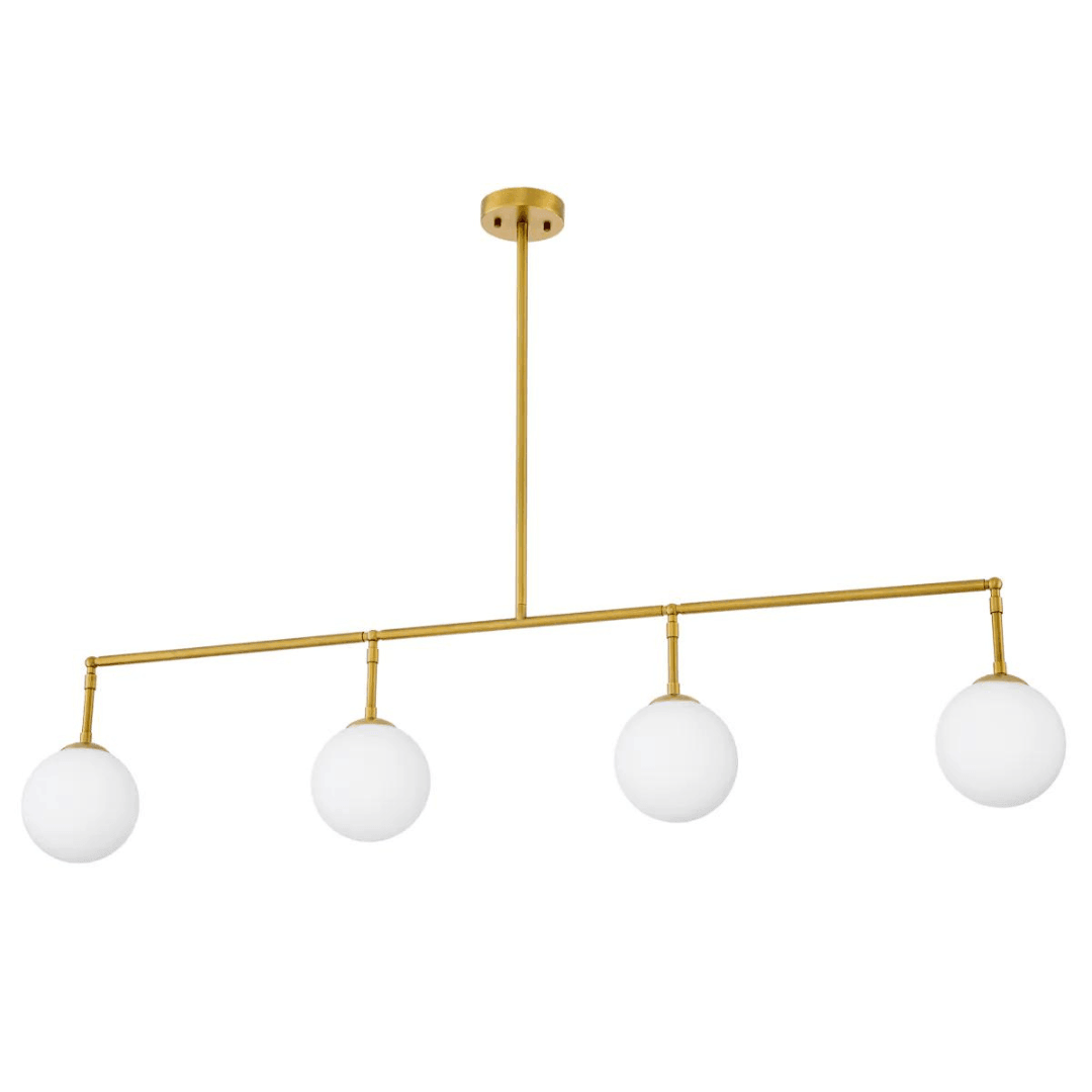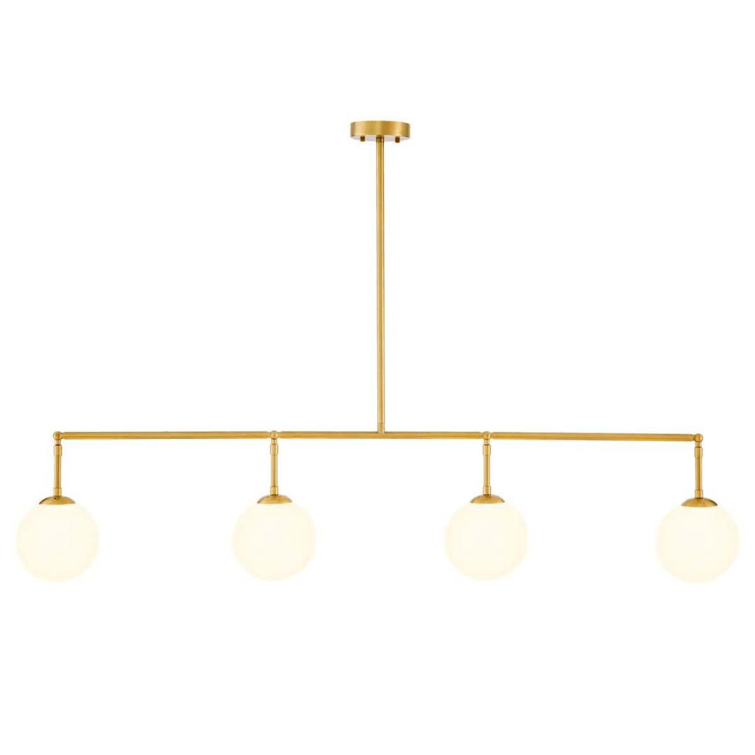 A fémből készült és antik sárgaréz bevonattal ellátott Tara csillár négy üveggömböt tartalmaz, amelyek egymástól egyenlő távolságra lógnak egy rúdon. Ez a szépsége és funkciója miatt népszerű, elegáns függőlámpa századközepi modern hangulatot kölcsönöz étkeződnek vagy konyhaszigetednek.