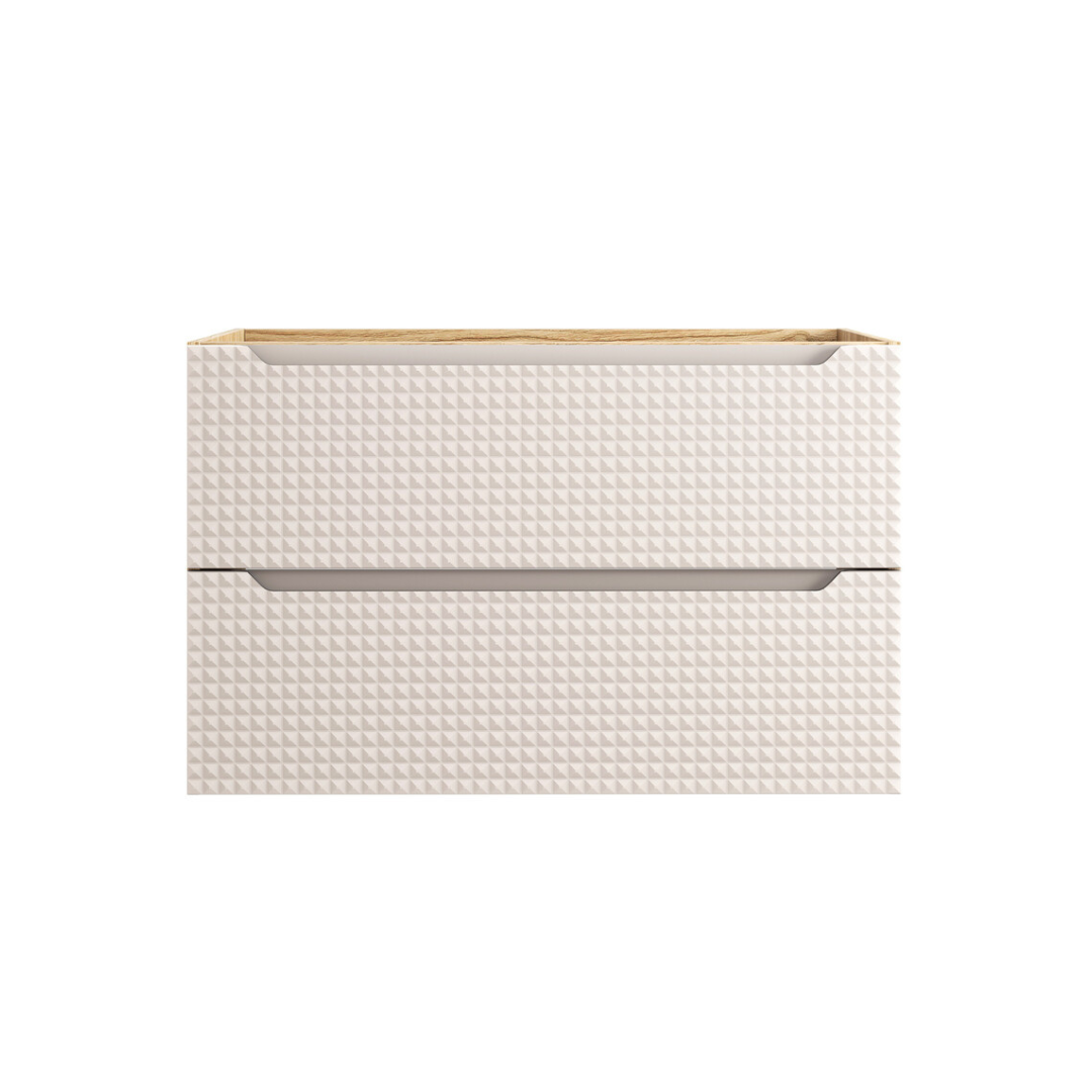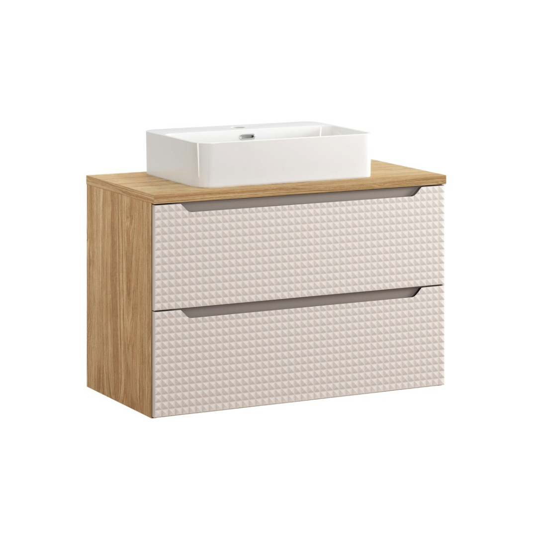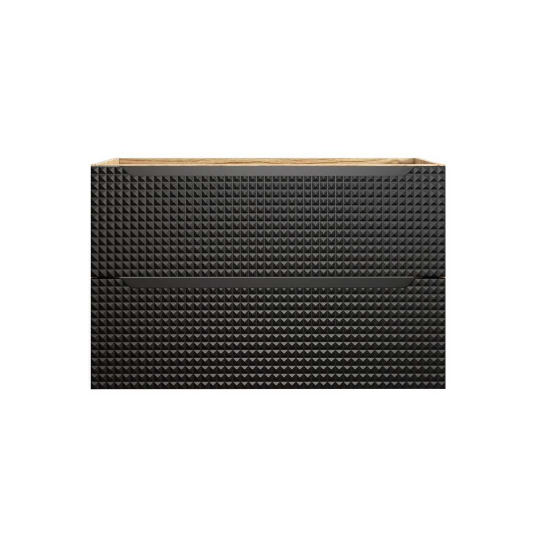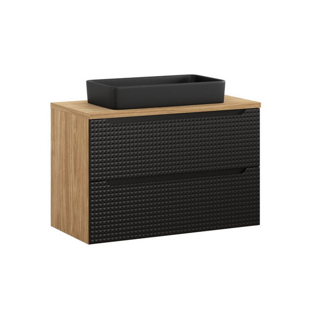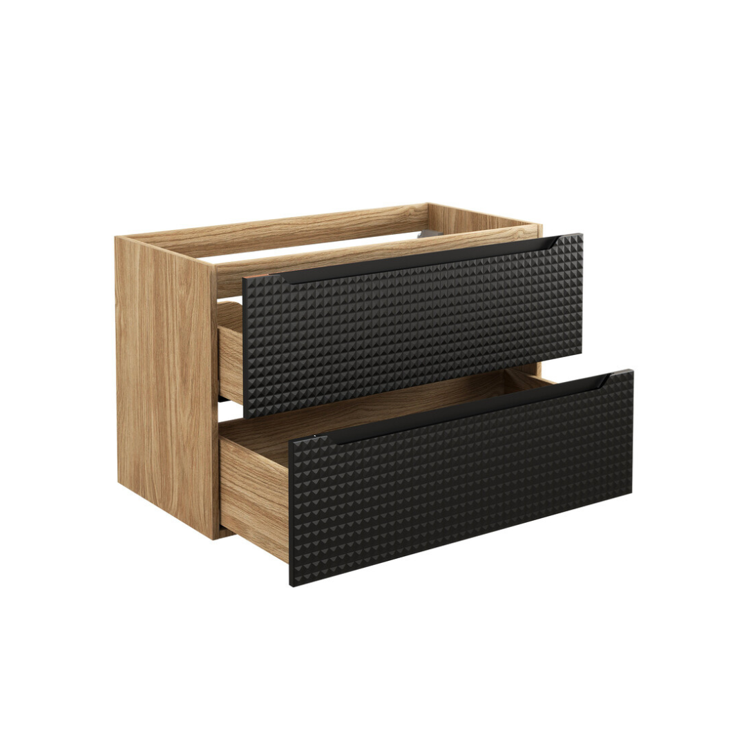 A Luxor 90 fiókos fürdőszoba bútor és mosdó szett egy stílusos bútordarab, amely tökéletes kiegészítője lehet bármely fürdőszobának. A natúr színű tölgyfa váz és pult meleg, természetes megjelenést biztosít, amely harmonikus összhangban áll a fekete vagy bézs előlapokkal. Az ajtók egyedi 3D-s mintázata nemcsak esztétikai értéket ad, hanem kiemeli a szekrény dizájnját is. A fekete változathoz matt fekete Slim (61x34x11 cm), míg a bézs színűhöz fényes fehér Trust 2 (55x38x12 cm) kerámia mosdókagyló tartozik.