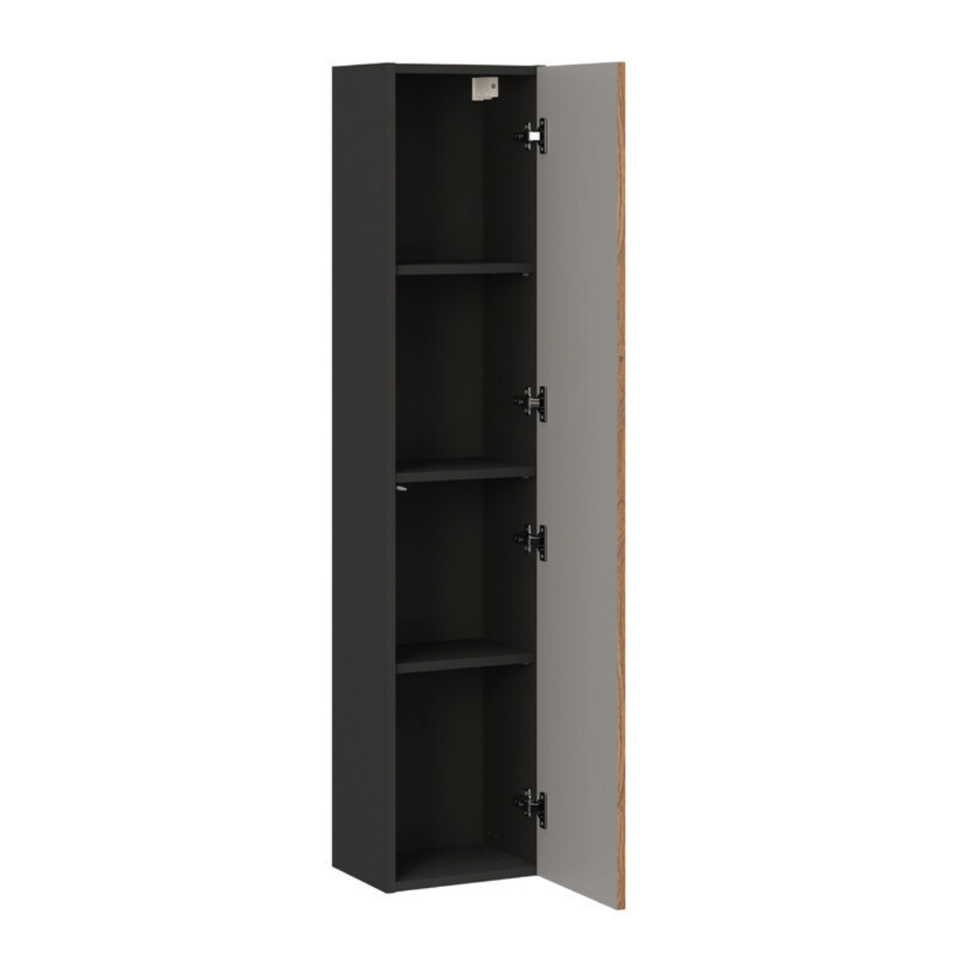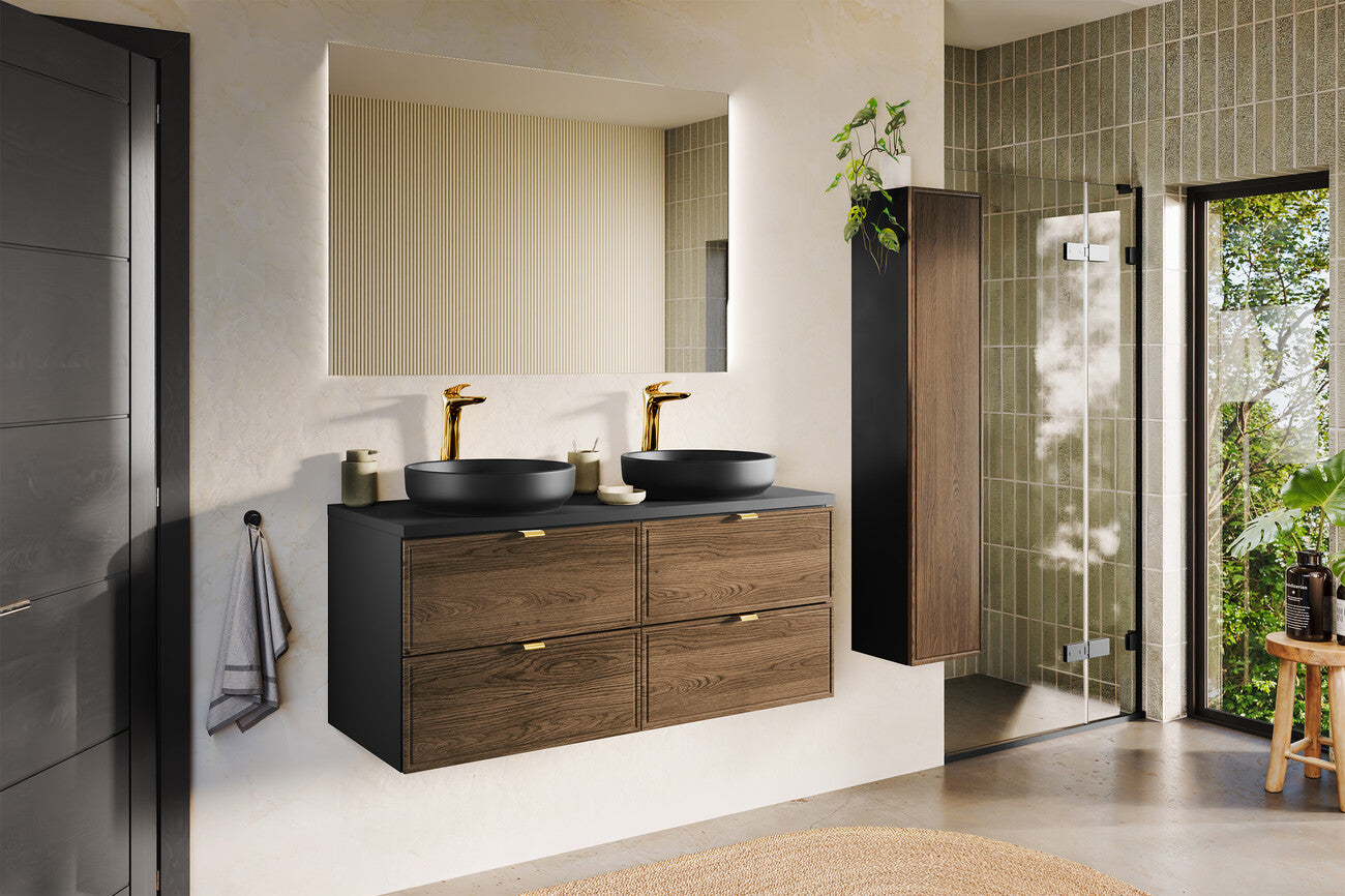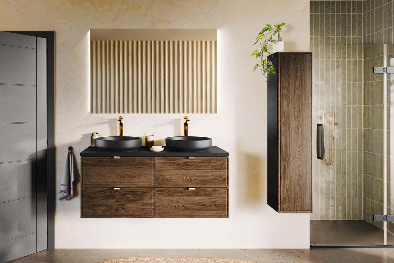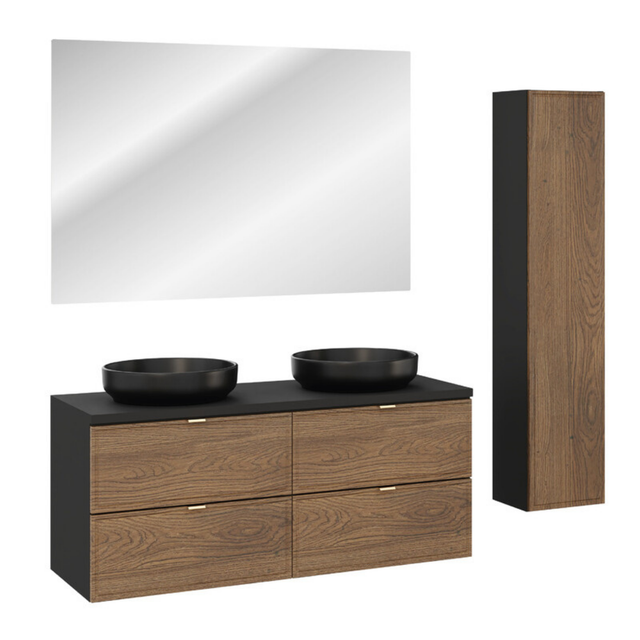 A Talia komplett fürdőszoba bútor szett kiváló választás lehet bármely fürdőszobába. A szekrények jellegzetes casella tölgy előlapjai, finoman mart kerettel, időtlen kialakításukkal felkeltik a figyelmet. A matt fekete bútortestek, és pult pedig merészséget és kortárs megjelenést kölcsönöznek a kollekciónak. A készlet tartalmaz 2db mosdószekrényt (60x45.6x50 cm), 1db pultot (120x46x2.5 cm), 2db matt fekete River 1 kerámia mosdókagylót (Ø40x12 cm), 1db magasszekrényt (30x25.5x140 cm), és 1db LED-es Aura tükröt (120x80 cm, IP21).