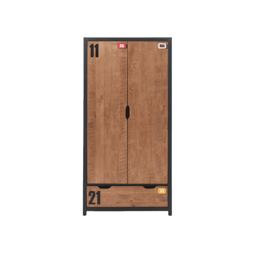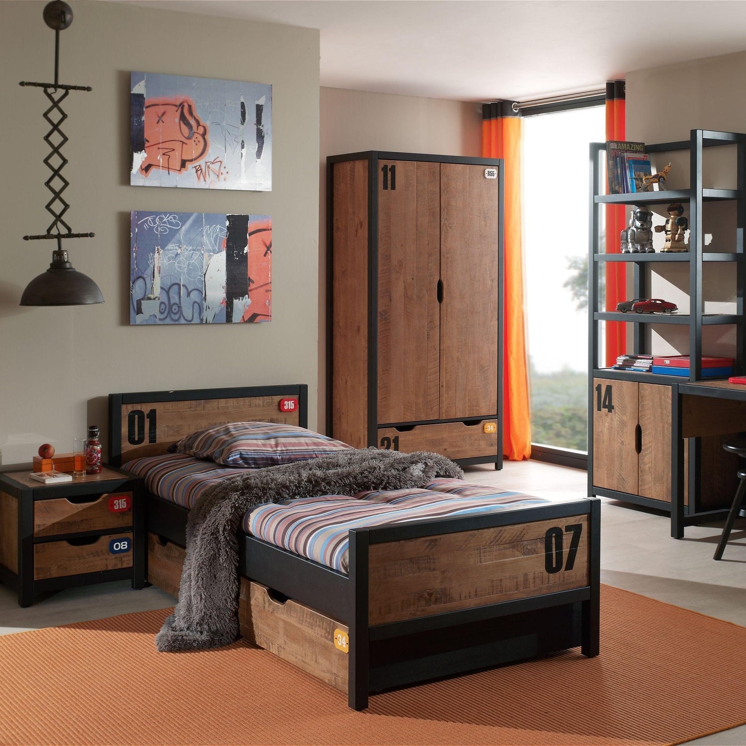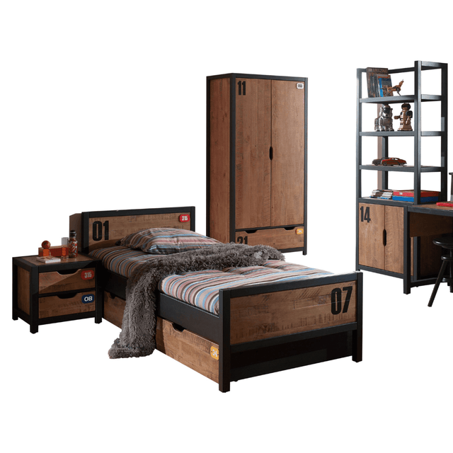 Az Alex19 gyerek bútor szett anyaga tömör fenyő, amely fekete fém vázakkal rendelkezik. A bútorokon található élénk színű számok teszik trendivé az Alex kollekciót. A szett tartalmaz egy 90x200cm-es ágyat (ágyrács nélkül), egy kihúzható, kerekes 190x93cm-es ágyneműtartót, egy 50x45x45cm-es két fiókos éjjeliszekrényt, egy 100x55x200cm-es két ajtós szekrényt, és egy 80x40x200cm-es polcot.