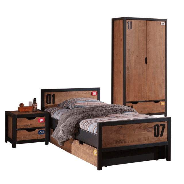 Az Alex54 gyerek bútor szett tömör fenyőből és fekete fém vázakkal rendelkezik. A bútorokon található élénk színű számok teszik trendivé az Alex kollekciót. A szett tartalmaz egy 90x200cm-es ágyat ágyráccsal, egy kihúzható, kerekes 190x93cm-es ágyneműtartót, egy 50x45x45cm-es két fiókos éjjeliszekrényt, és egy 100x55x200cm-es két ajtós szekrényt.