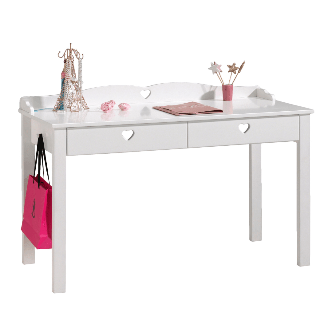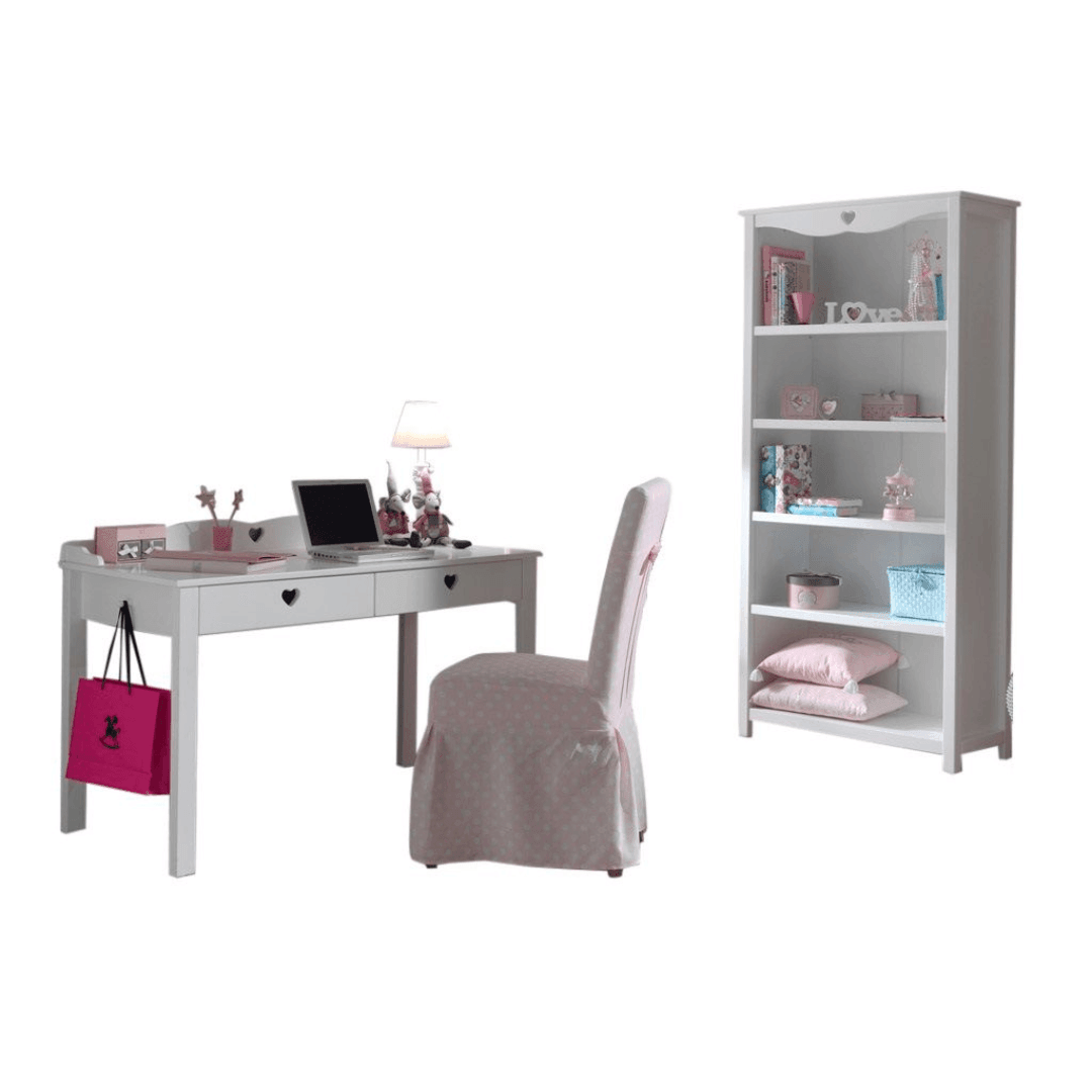 Az Amori07 gyerek bútor szett egy elegáns, és praktikus készlet. Az asztal két fiókkal, nagy munkafelülettel, és kis szívecskés részletekkel rendelkezik. A könyvespolc öt pakolórésszel rendelkezik, így rengeteg helyet biztosít a könyvek, tárgyak tárolására. Letisztult és elegáns fehér színük miatt könnyen alkalmazkodik bármilyen enteriőrhöz, és dekorációhoz. Az asztal mérete 130x60x84.5cm, a polc mérete 90x190x40cm. A szettnek nem része a dekoráció és a szék.